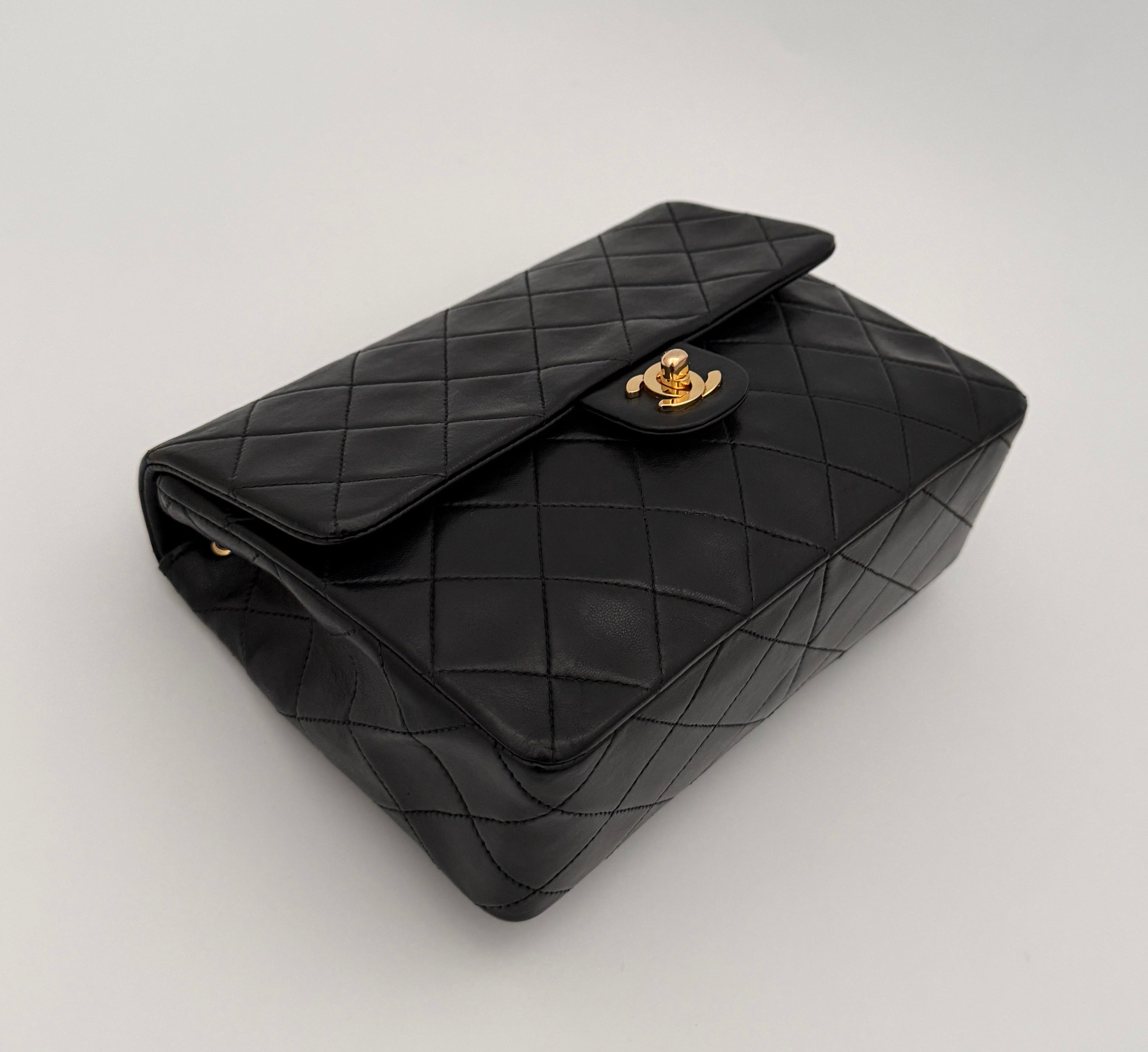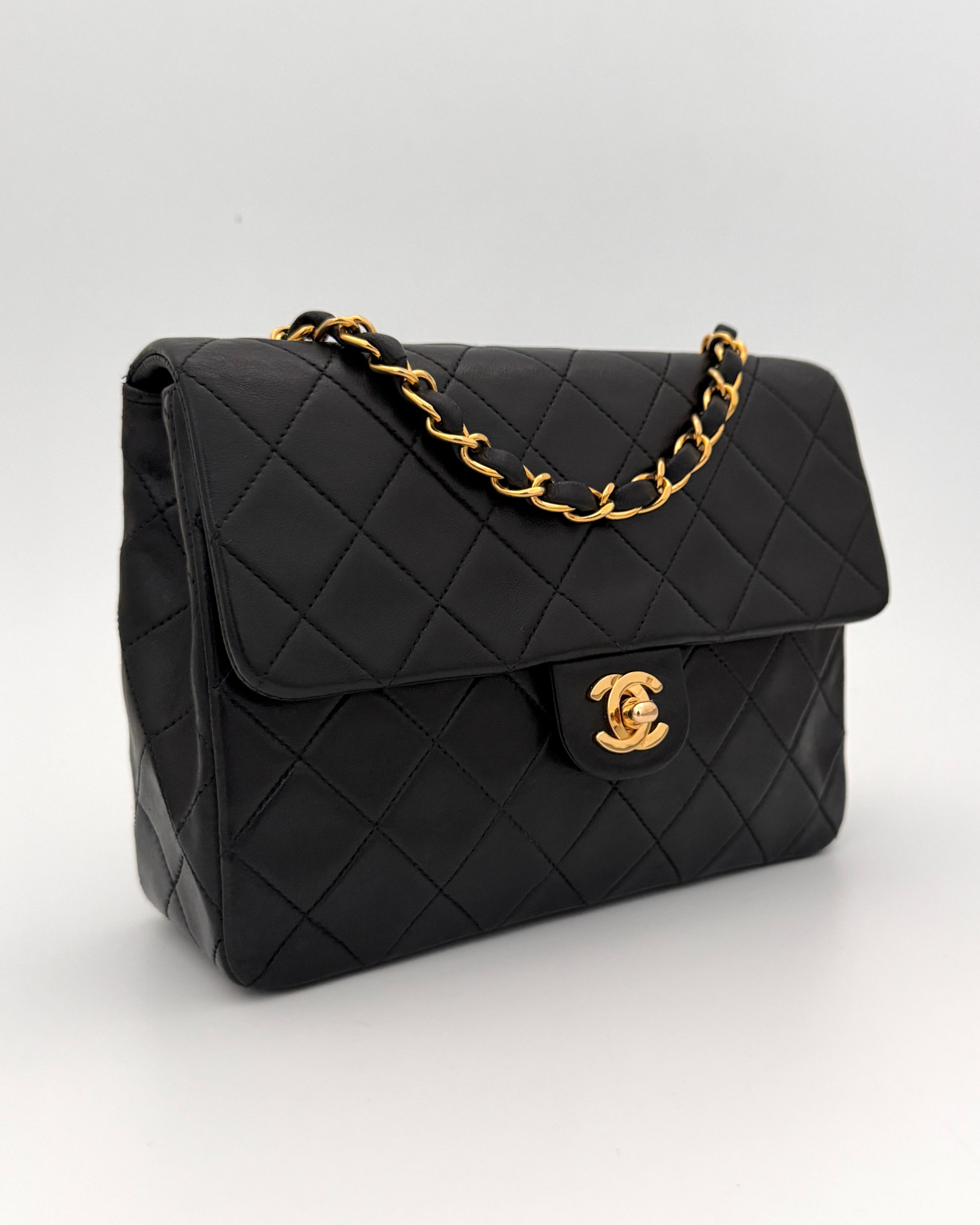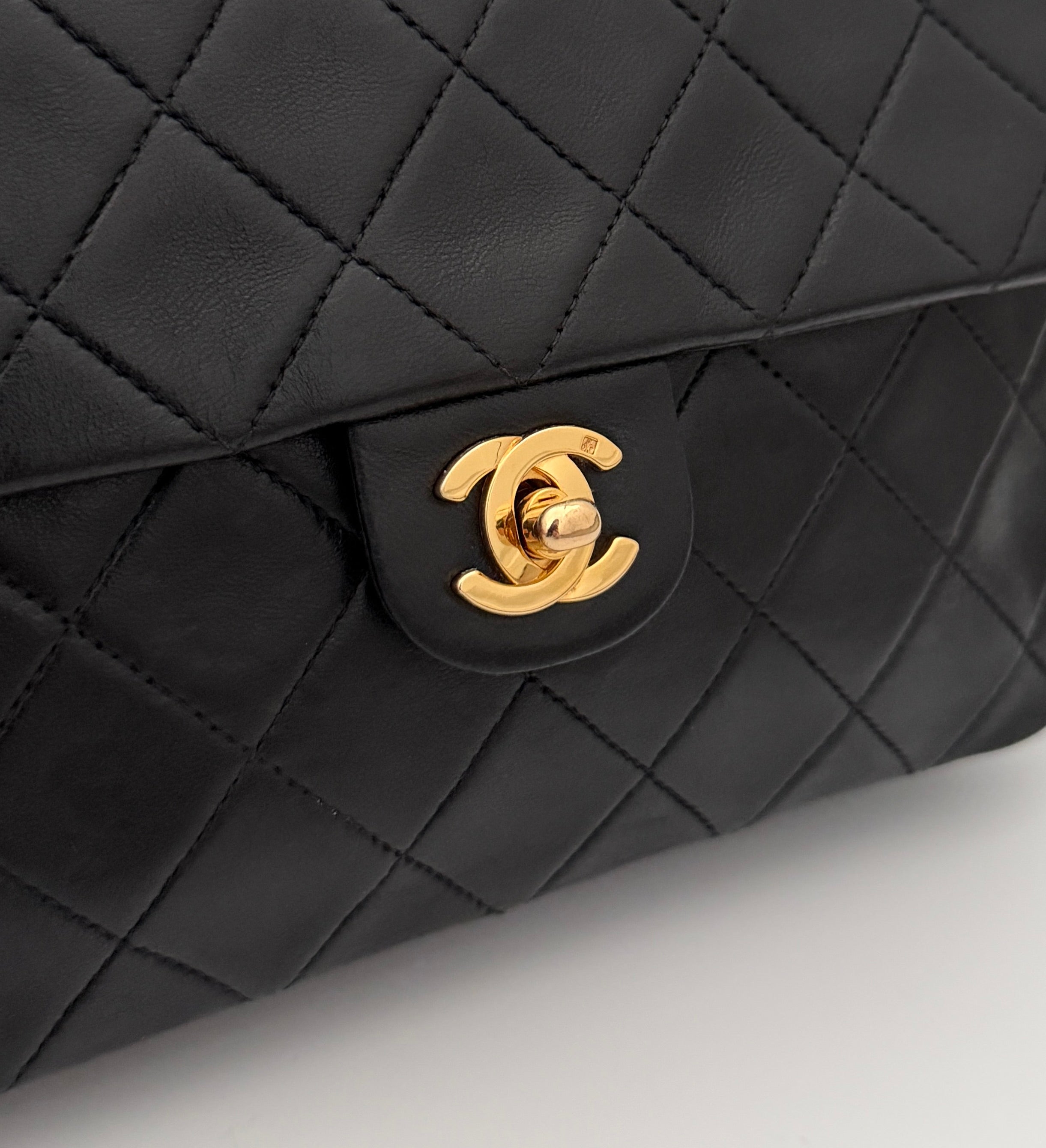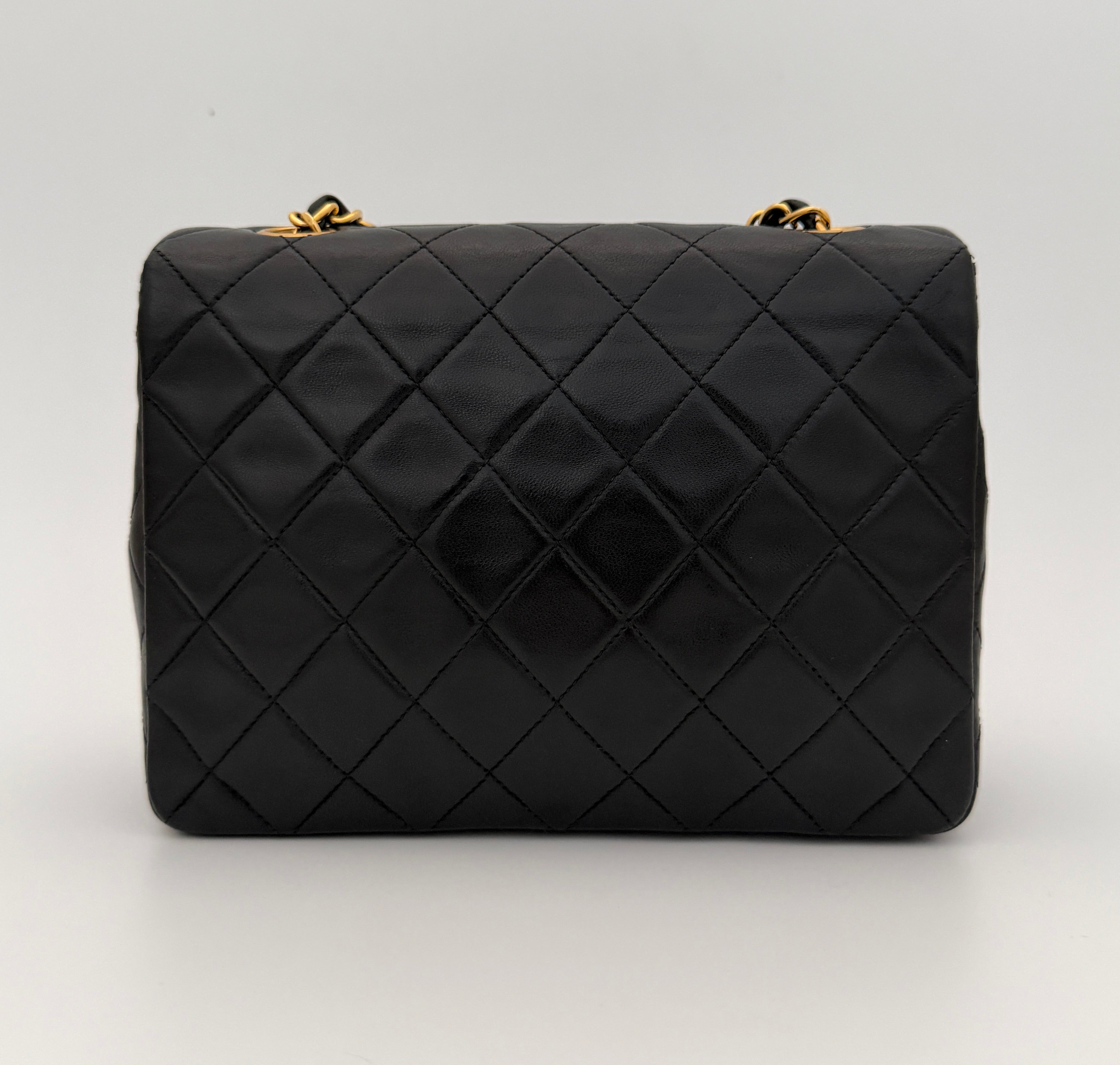 Chanel mid flap bag in black leather with gold-tone metal details.