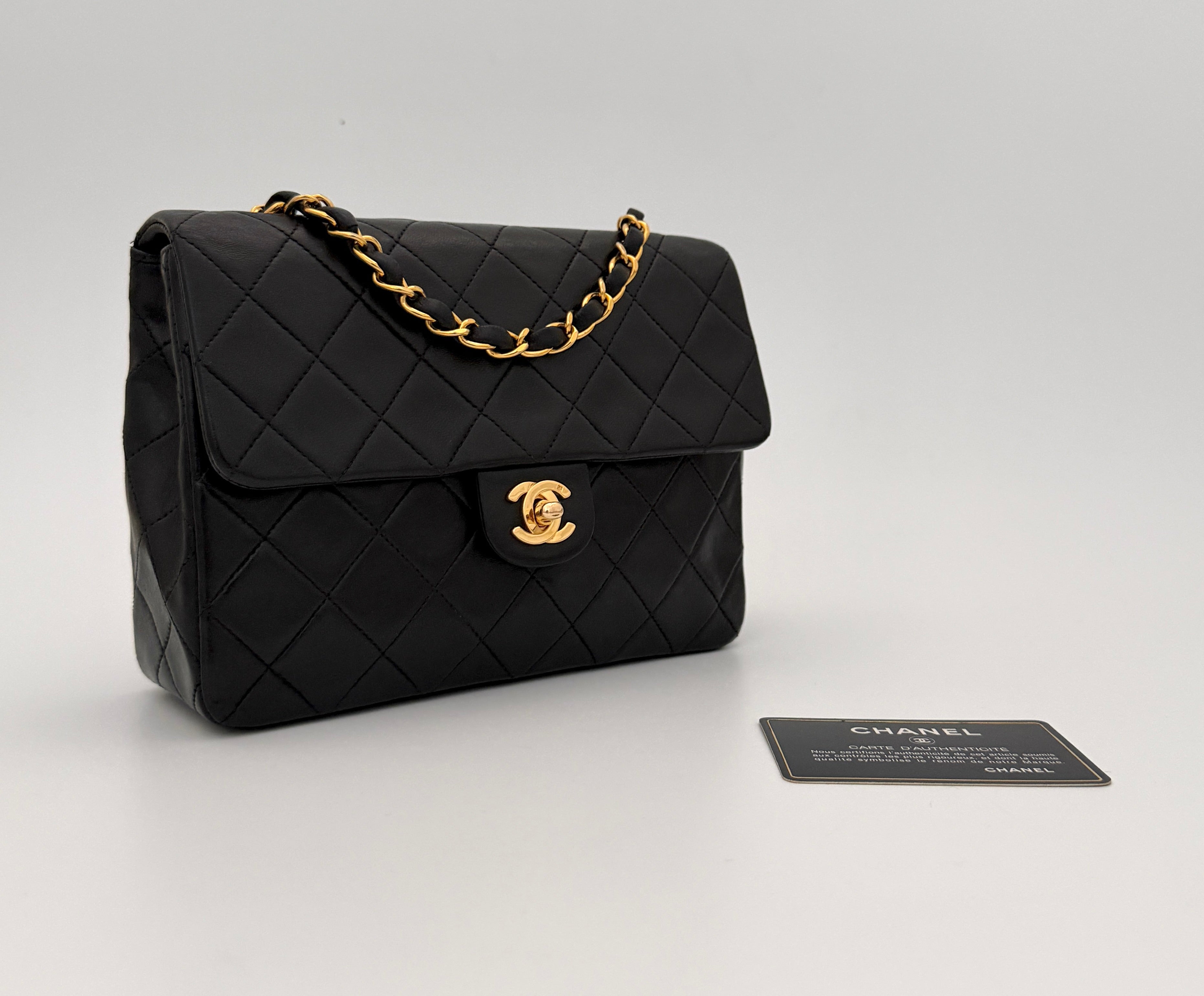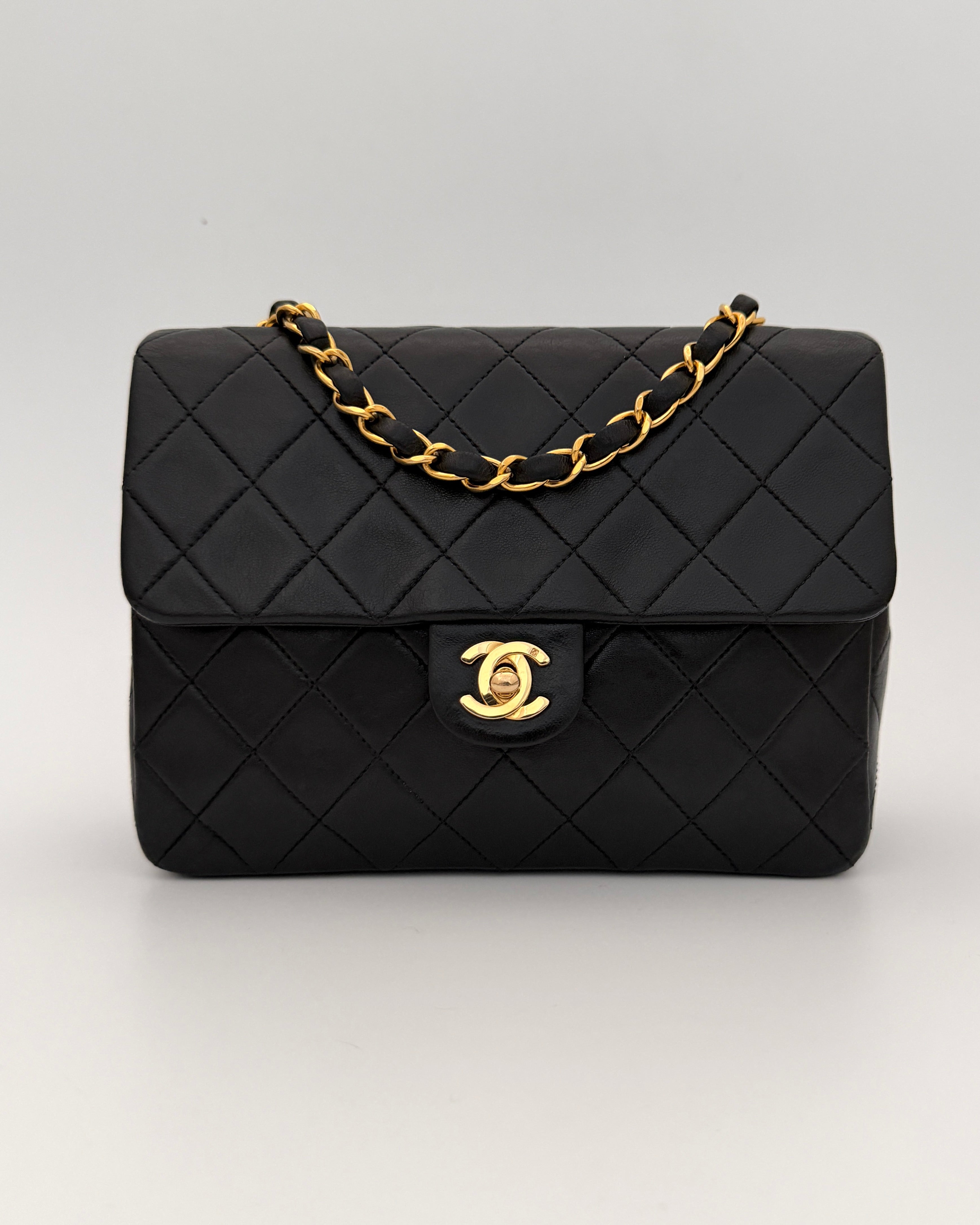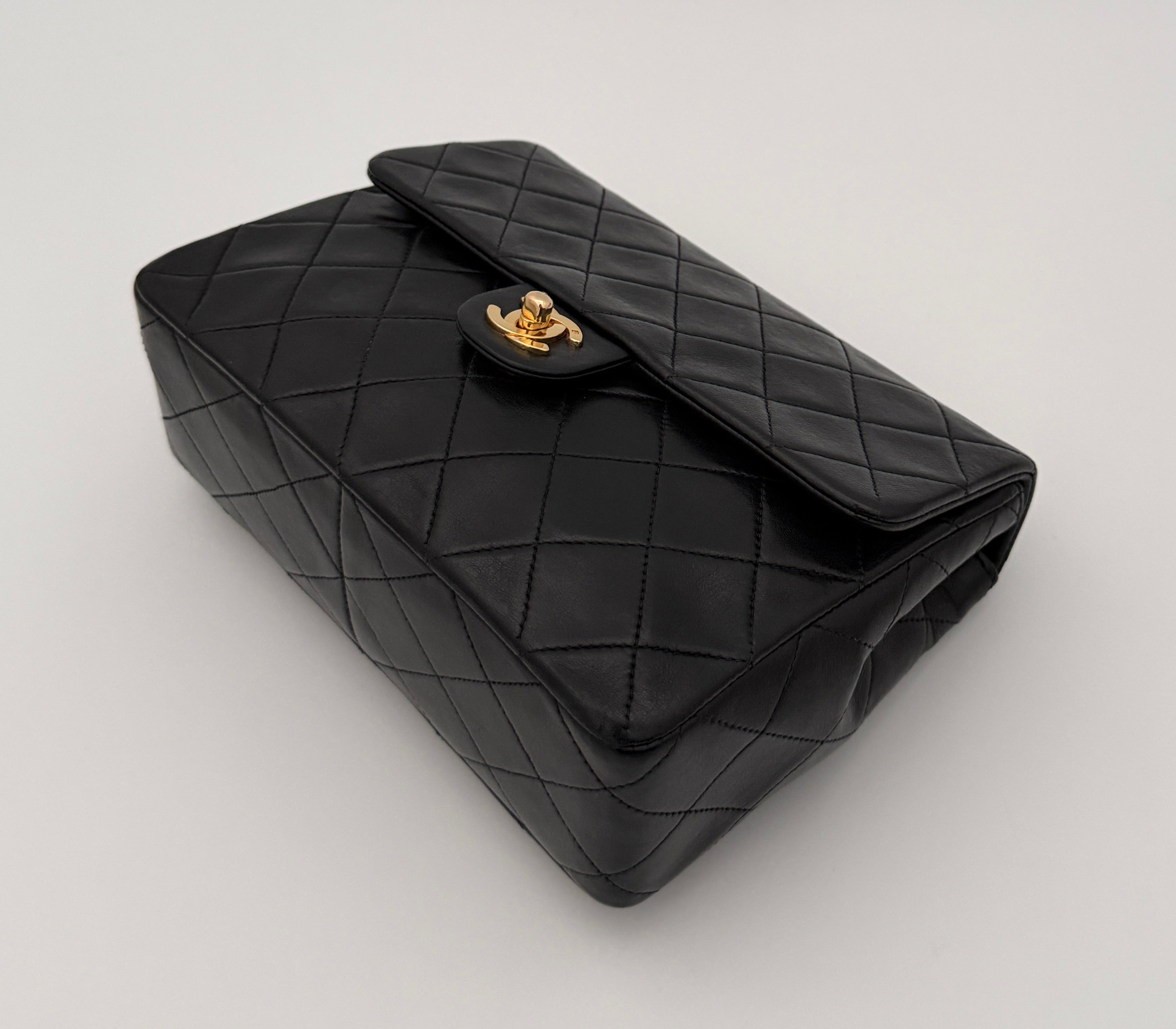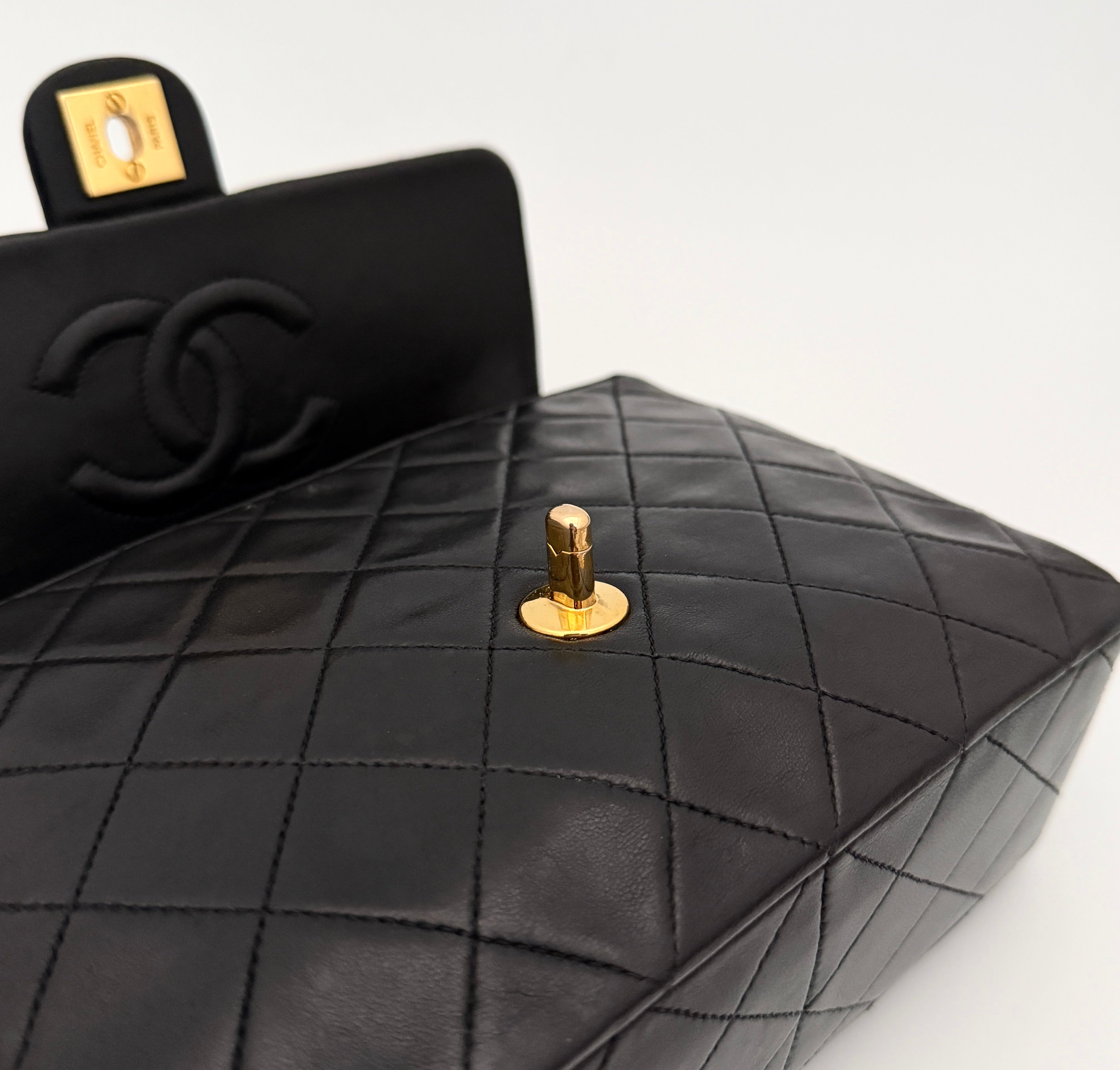 Chanel mid flap bag in black leather with gold-tone metal details.