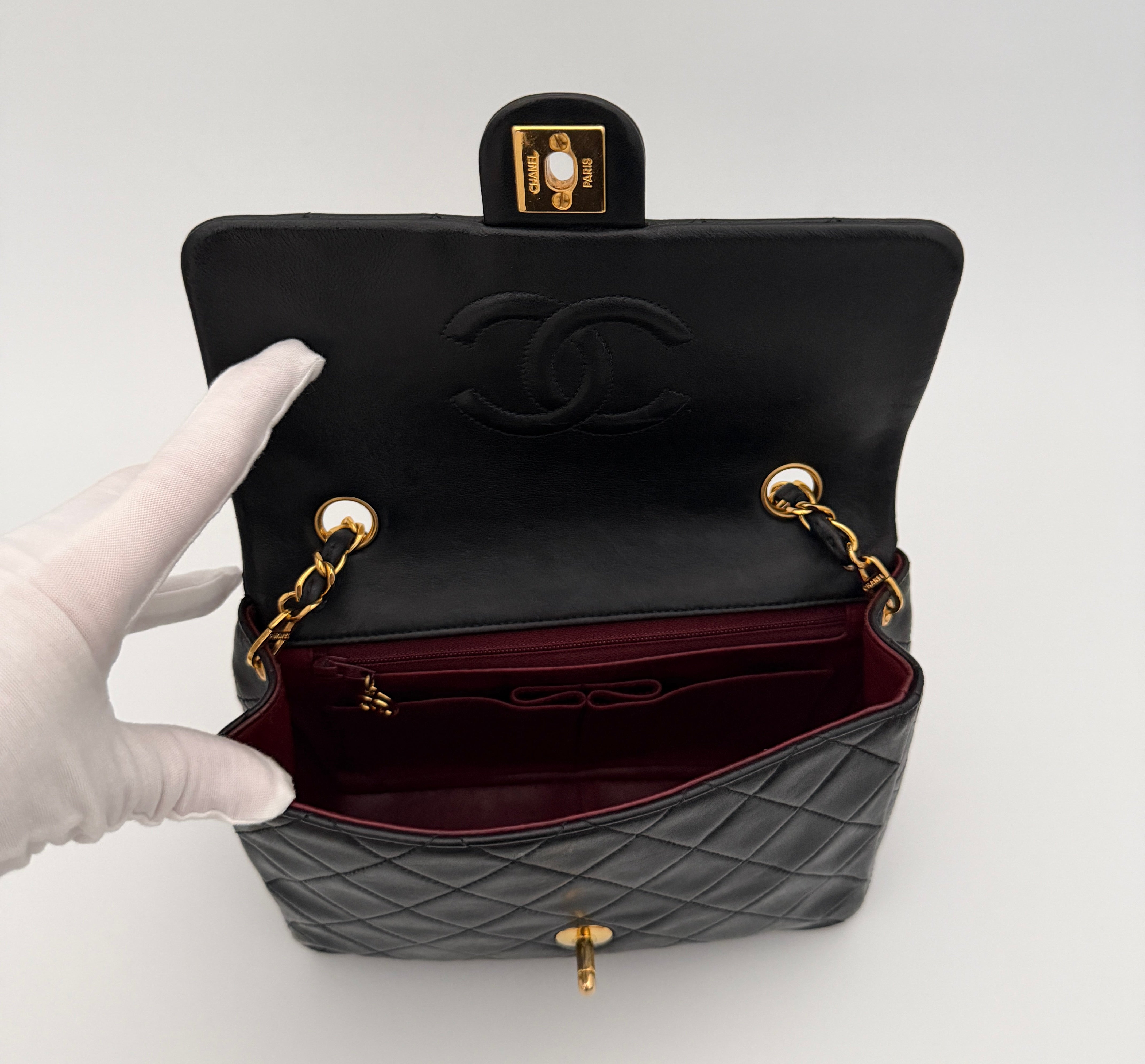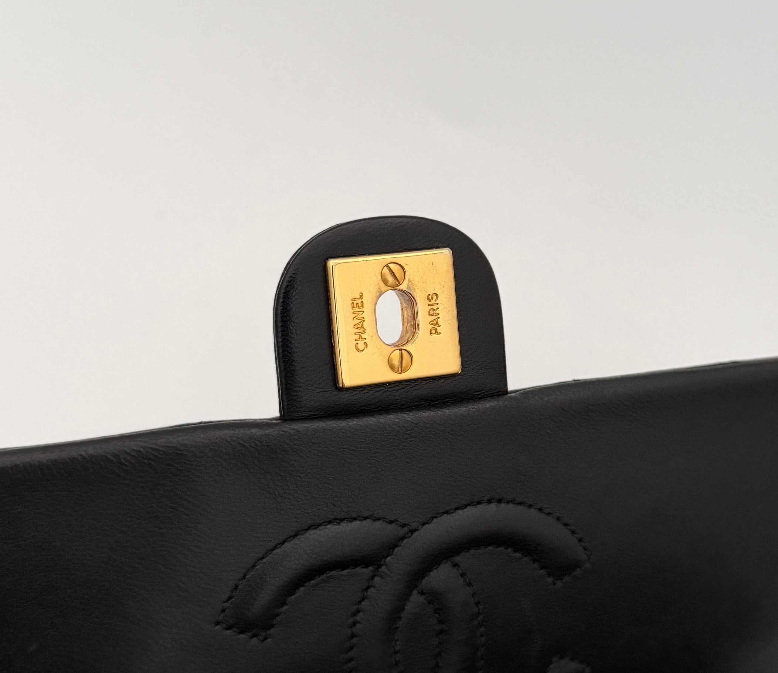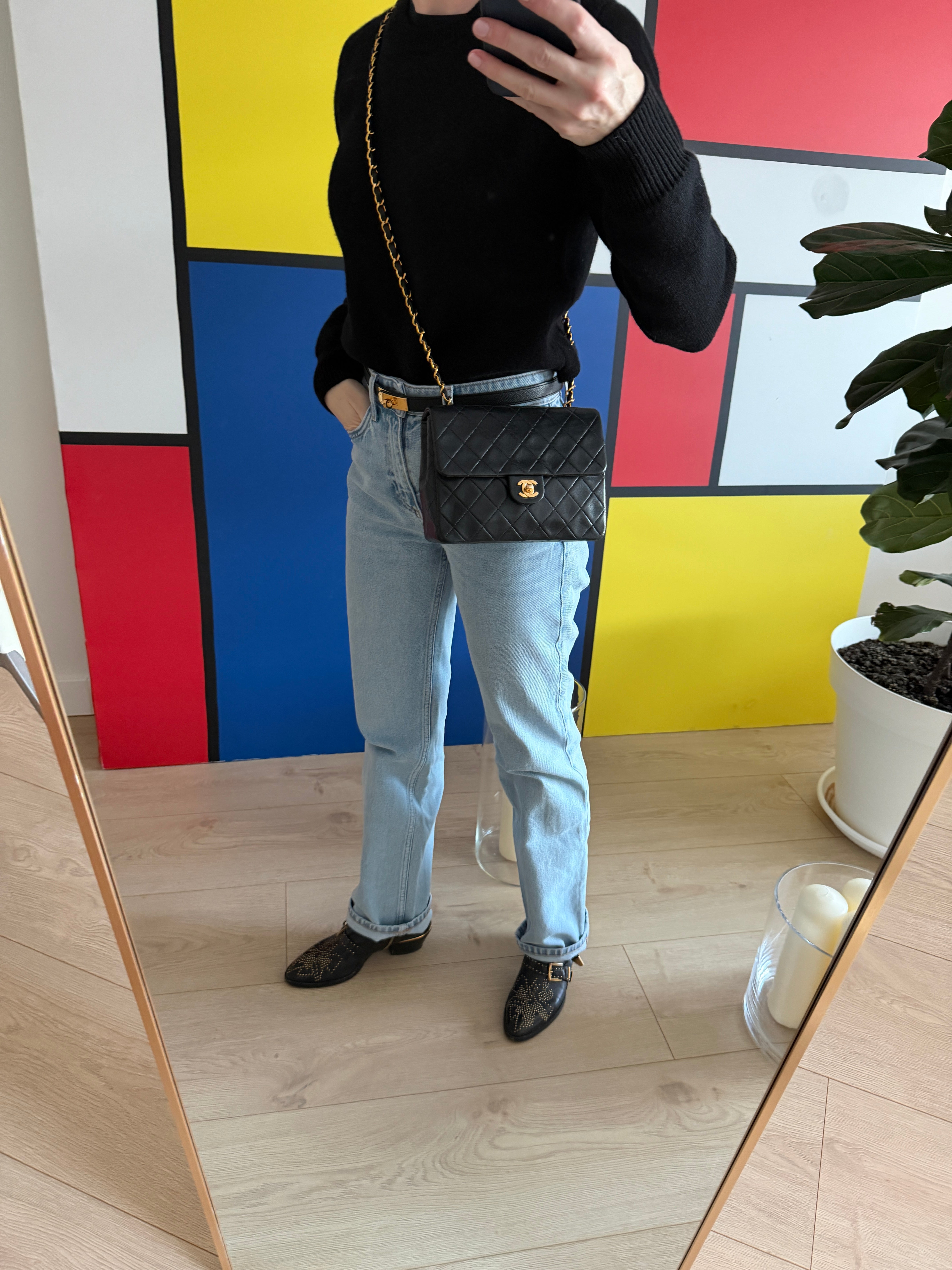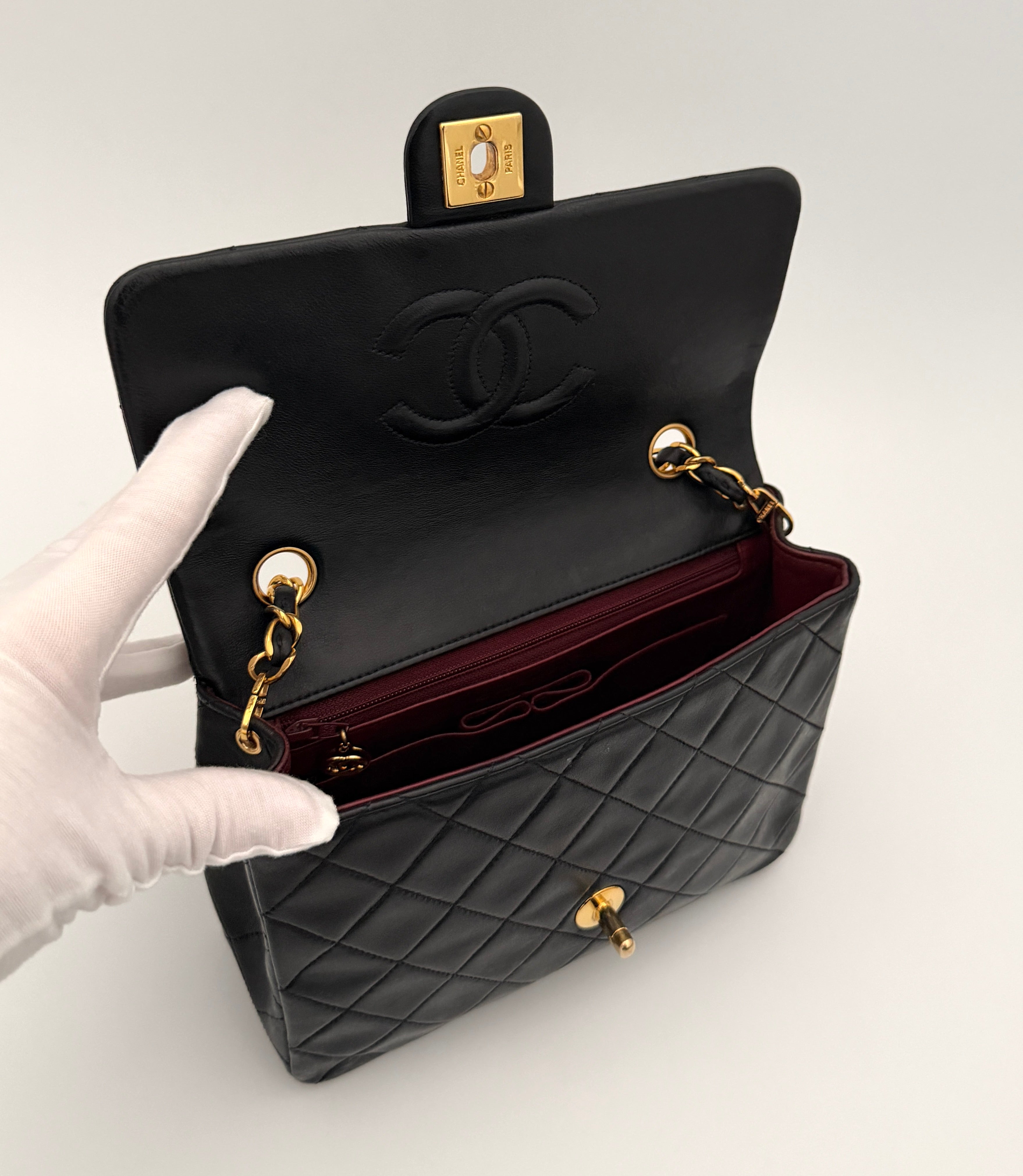 Chanel mid flap bag in black leather with gold-tone metal details.