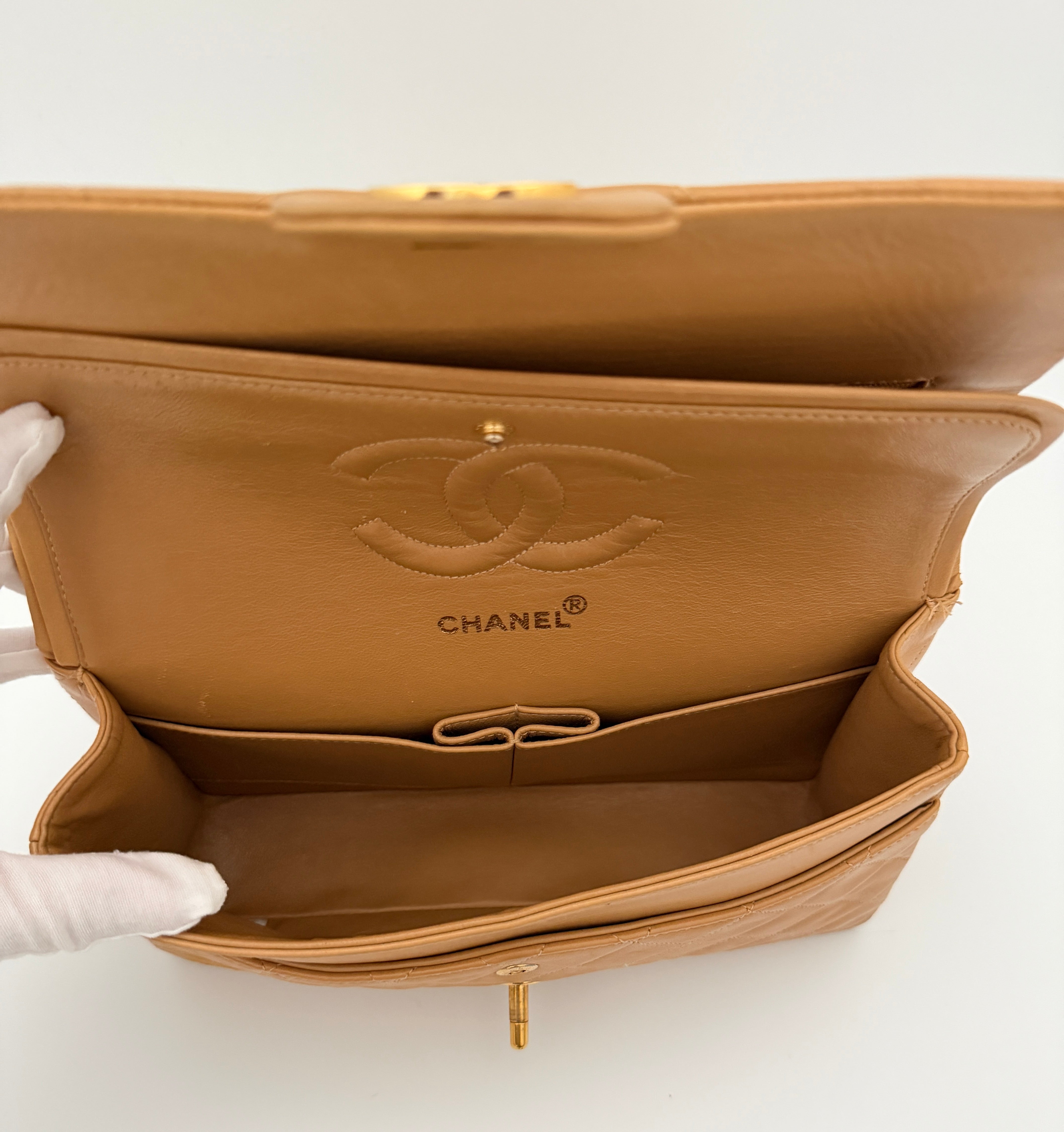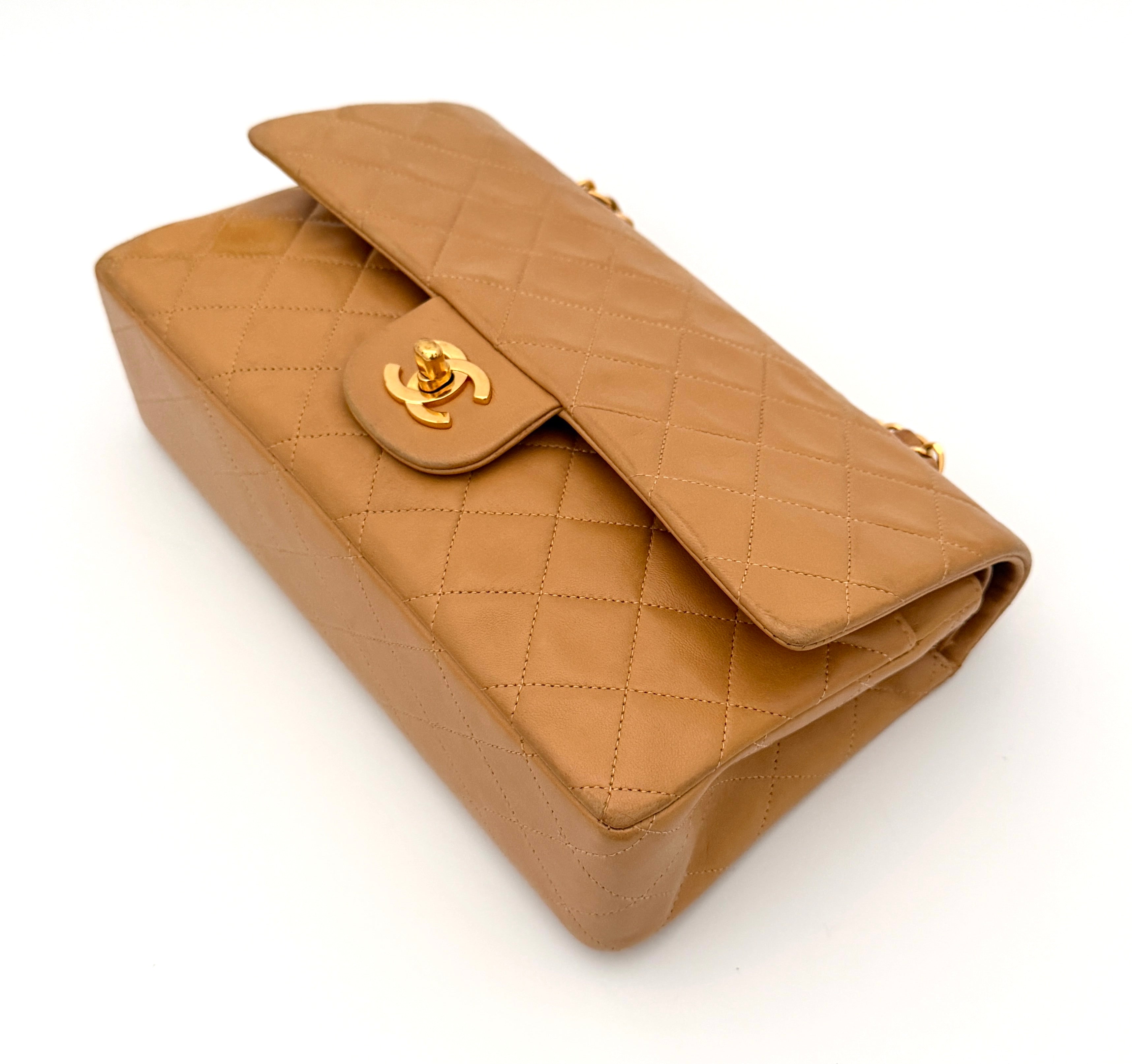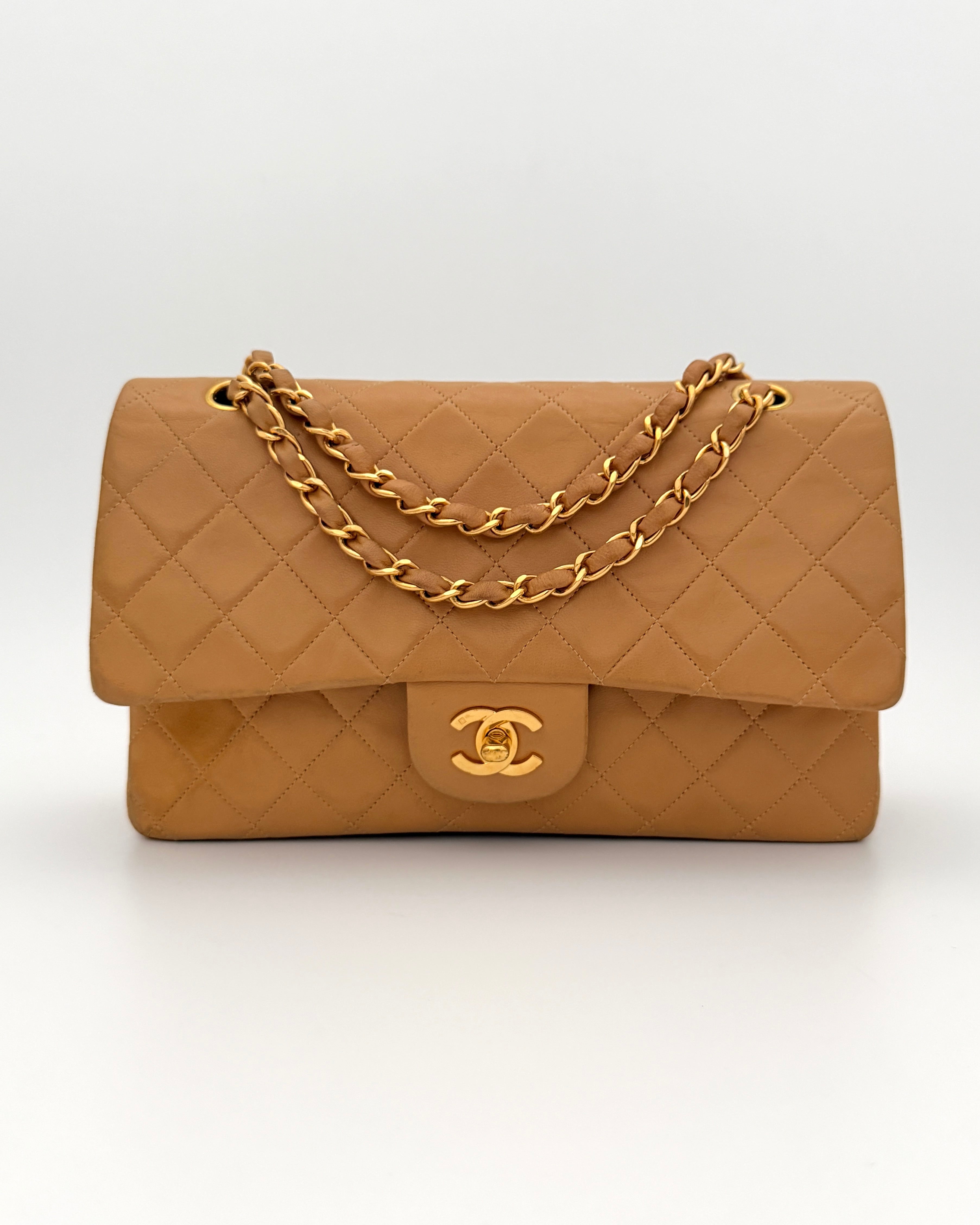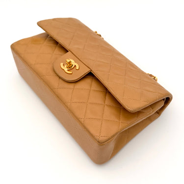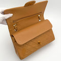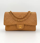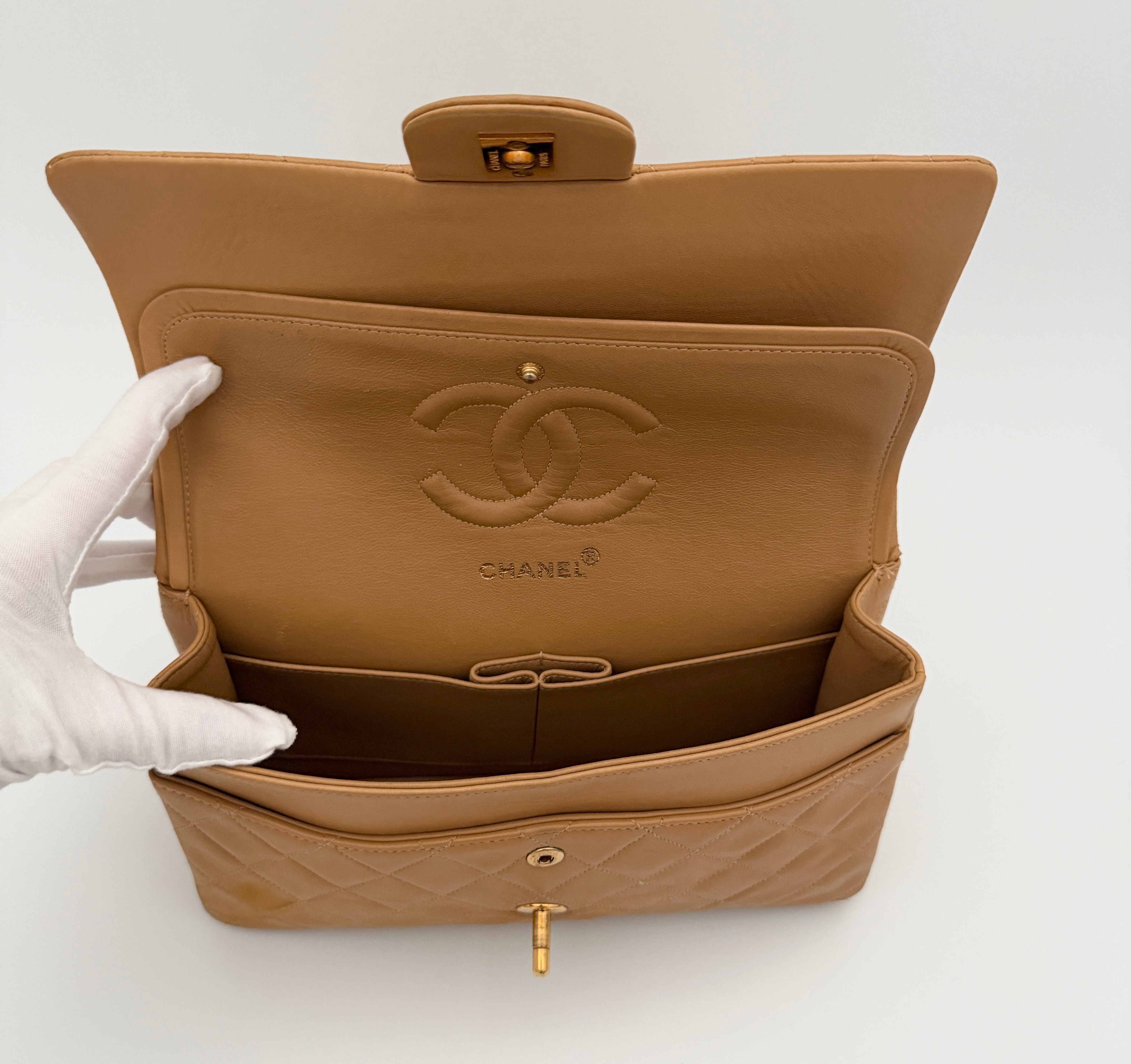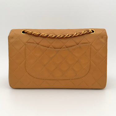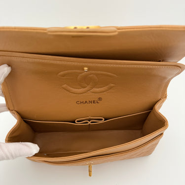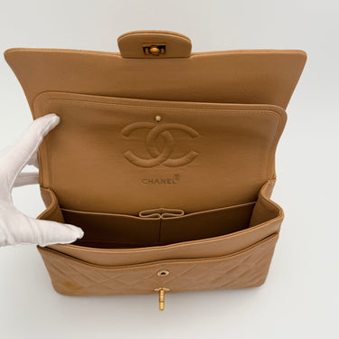Chanel Timeless 25 double flap bag in beige camel / light caramel leather with gold-tone hardware.