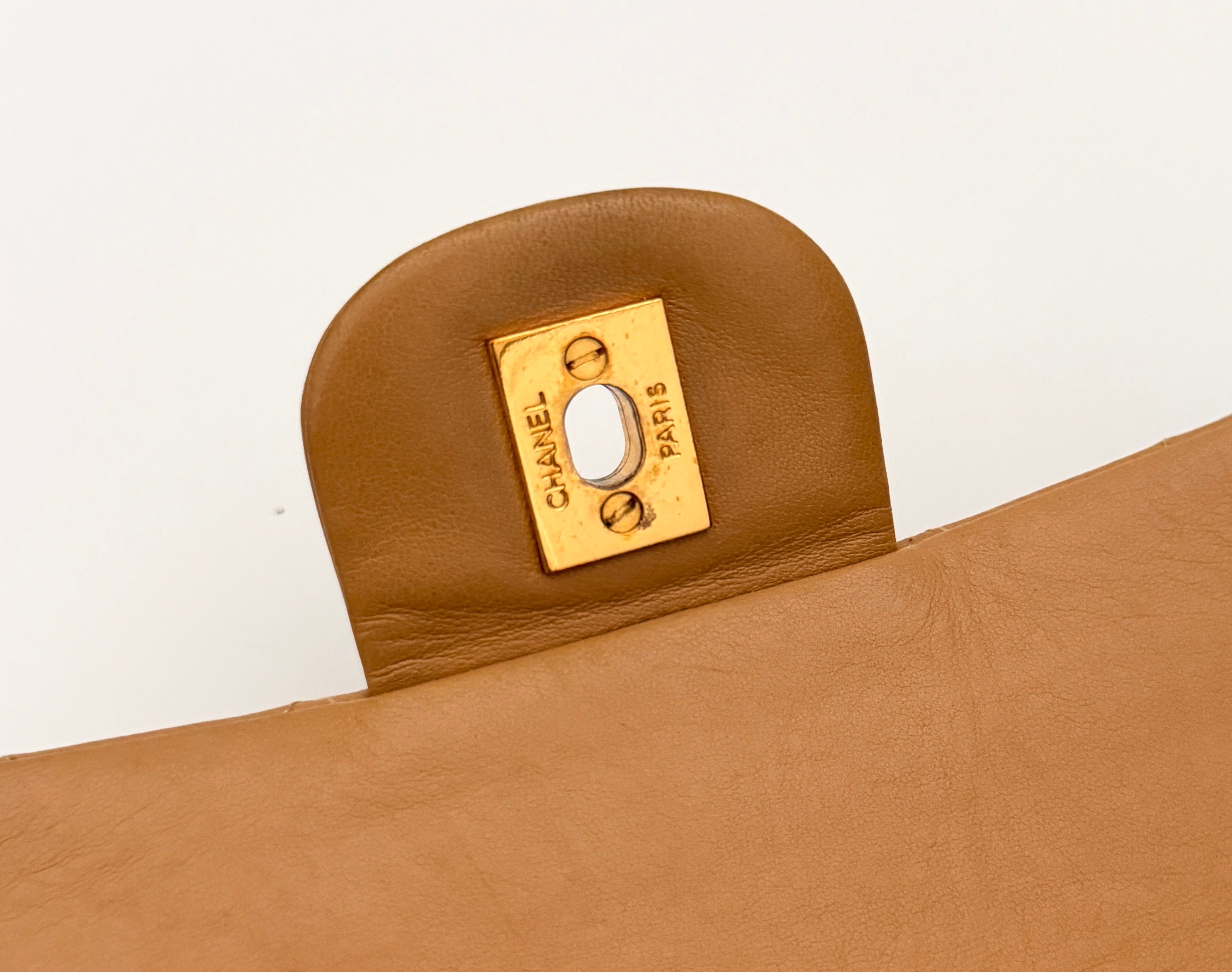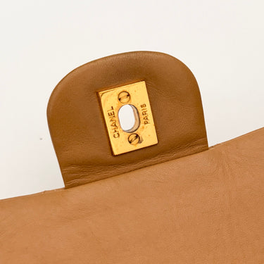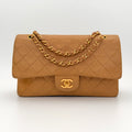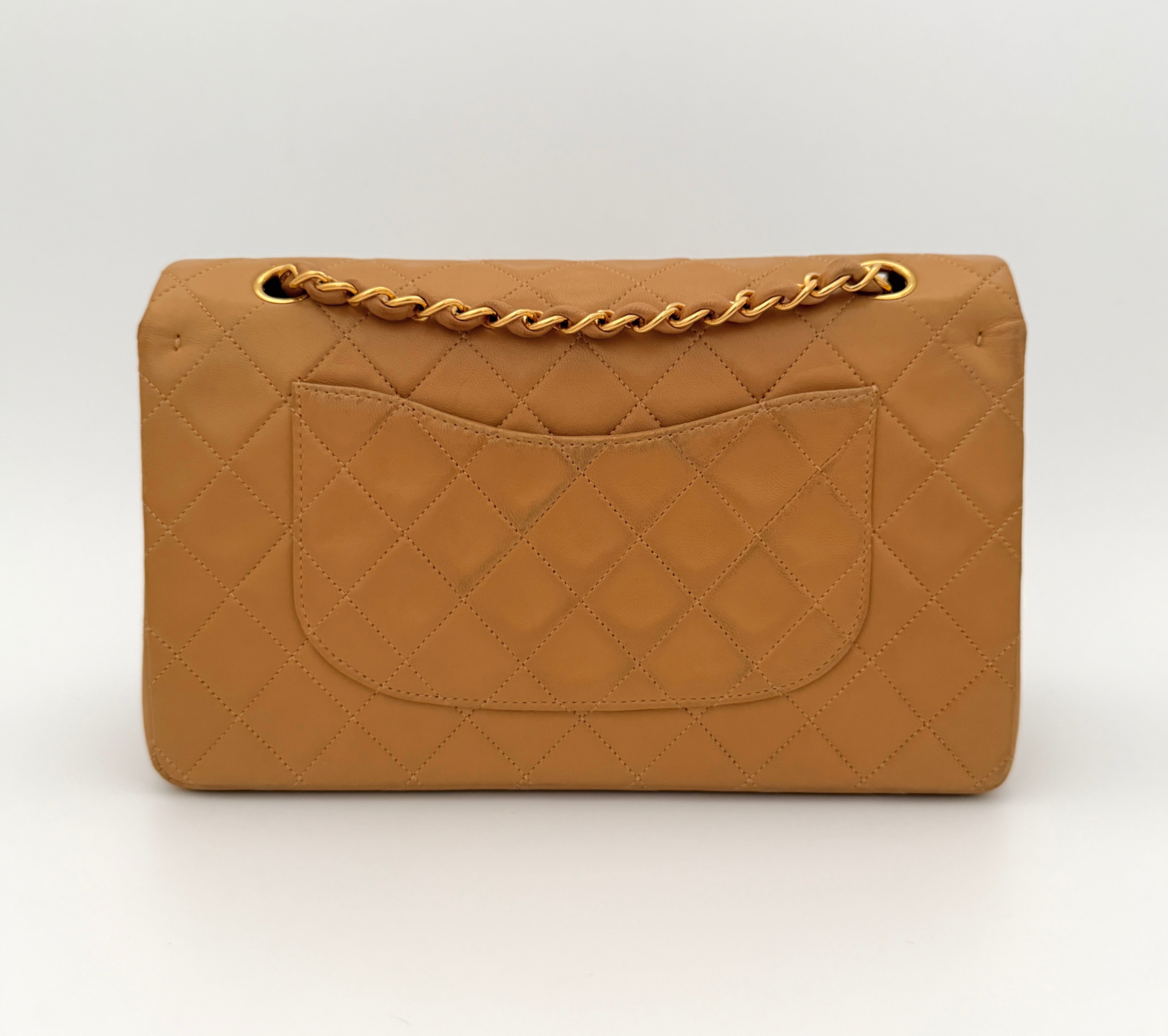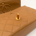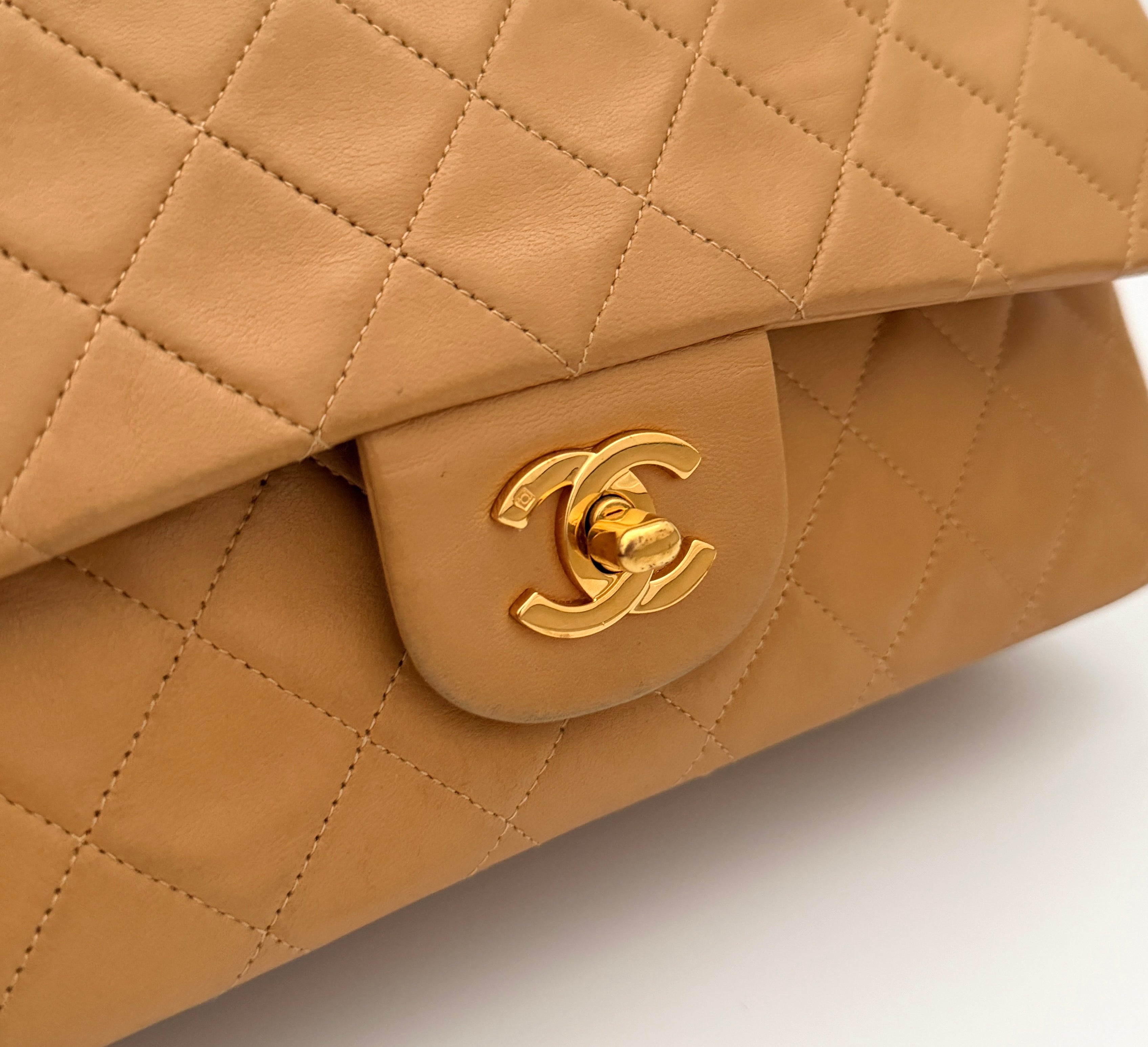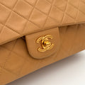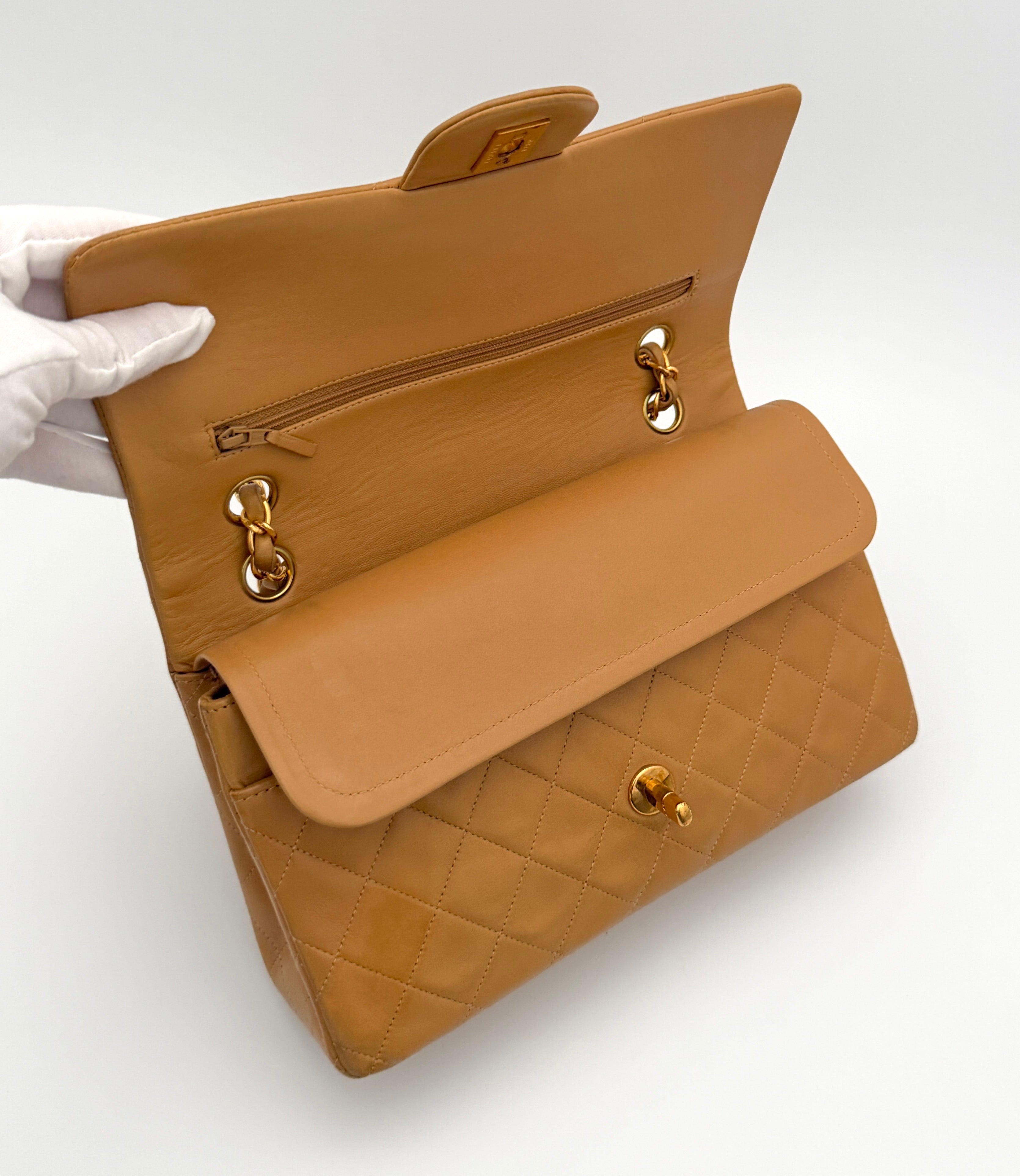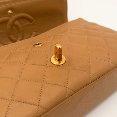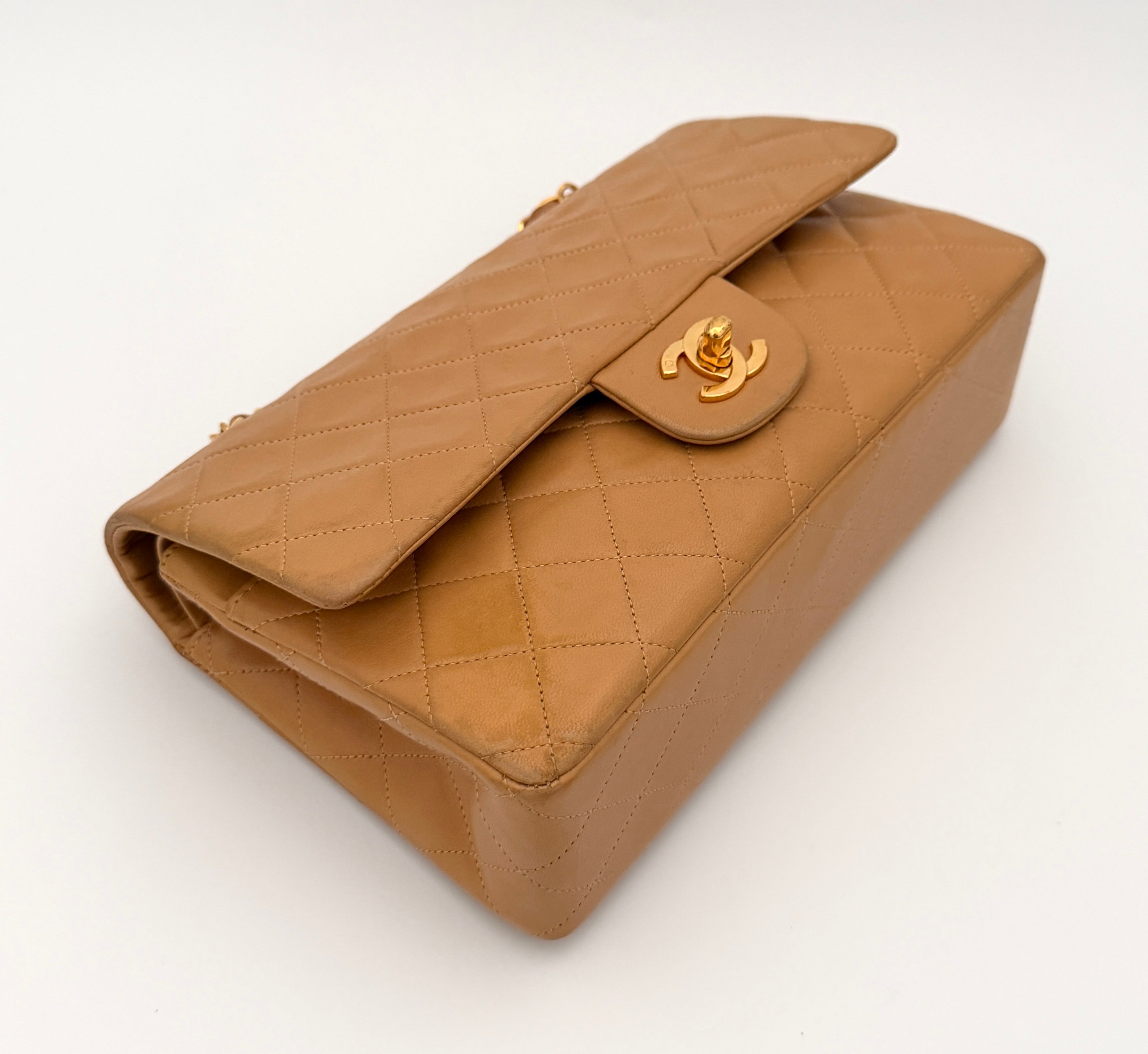 Chanel Timeless 25 double flap bag in beige camel / light caramel leather with gold-tone hardware.