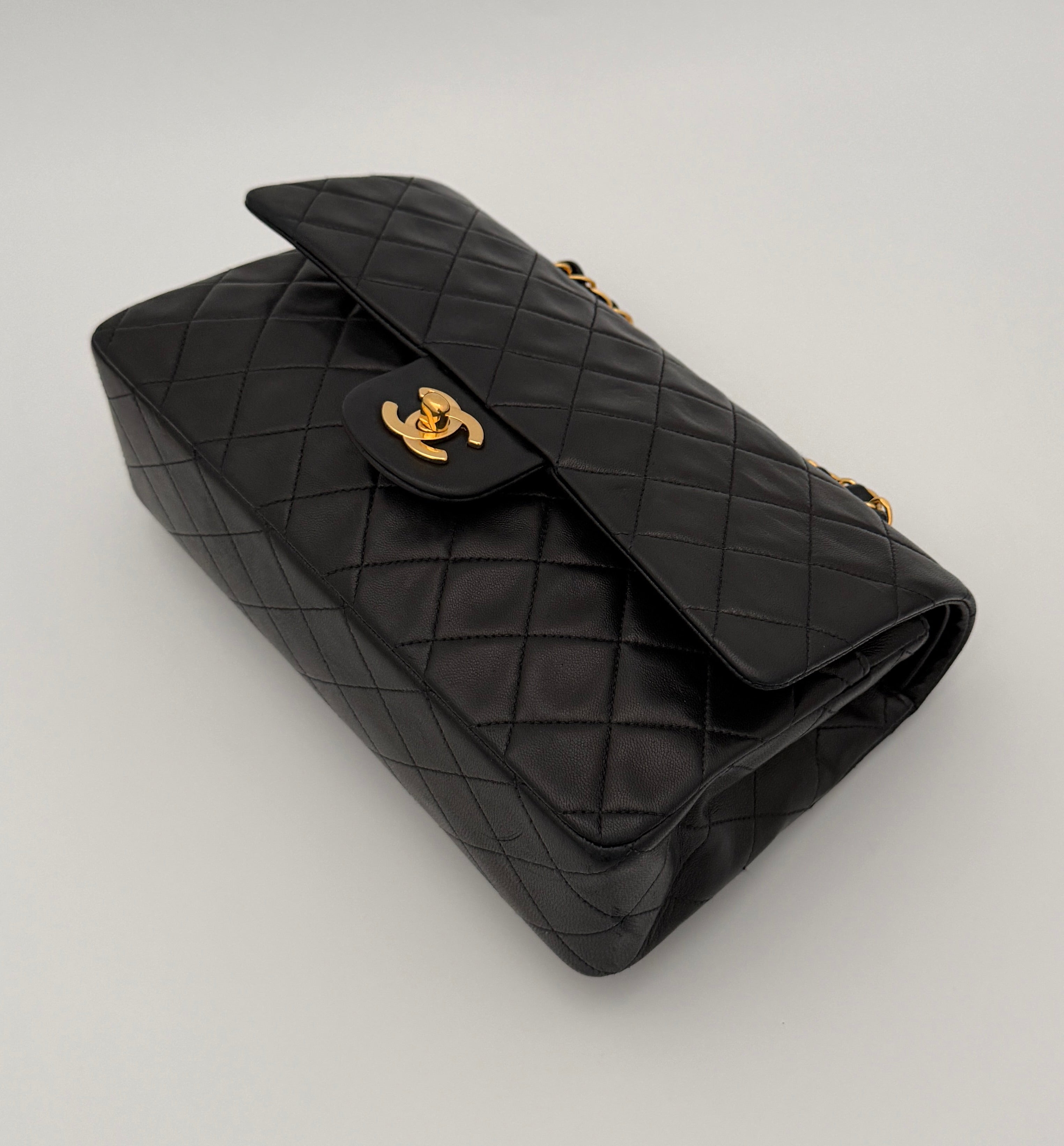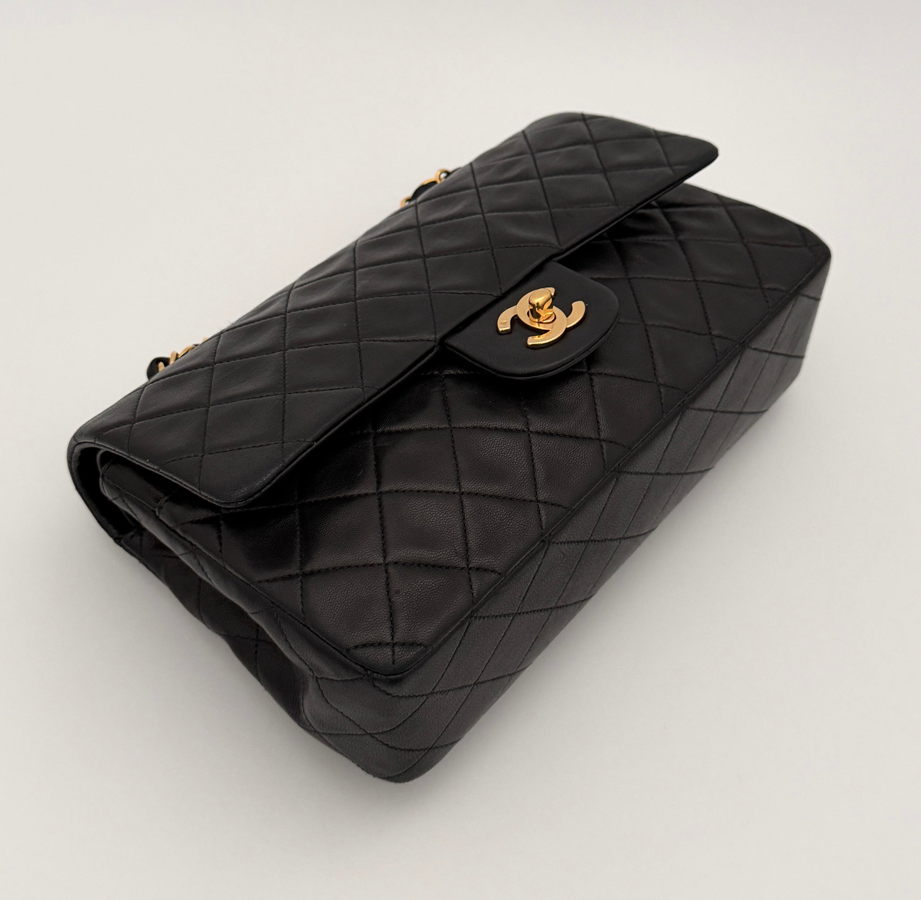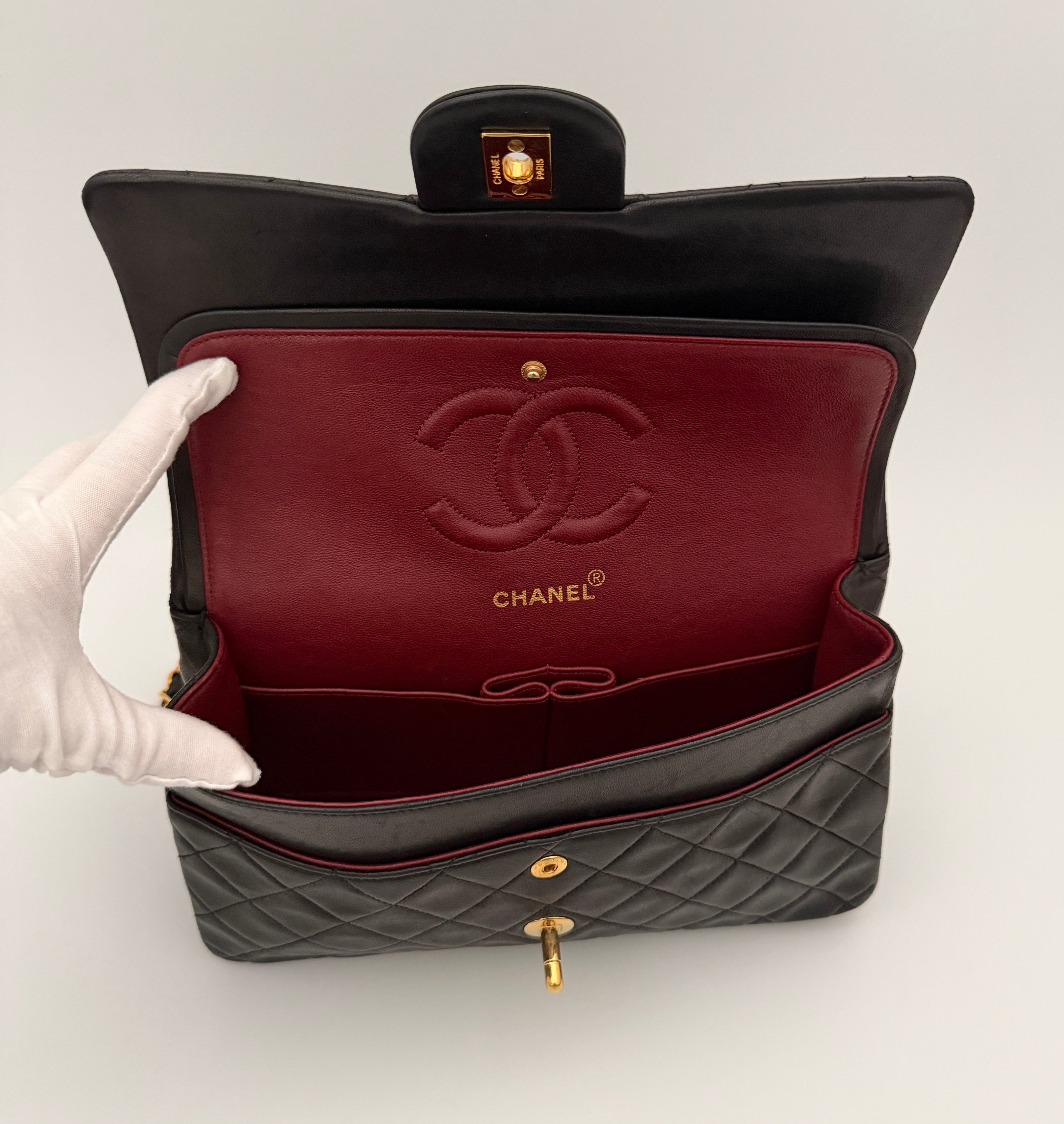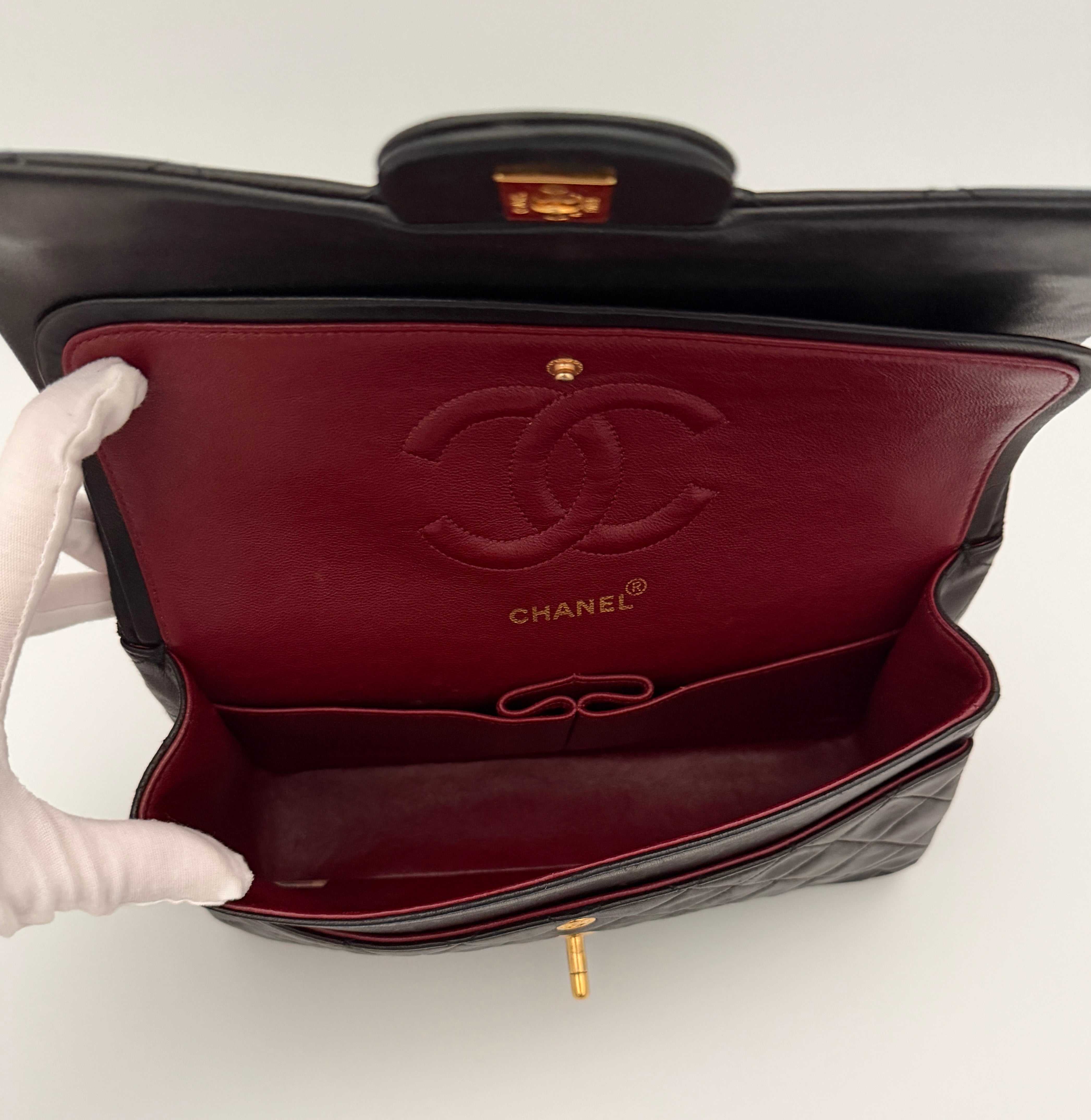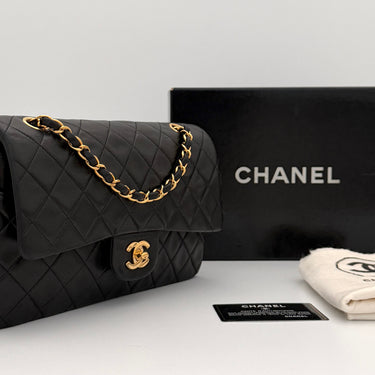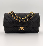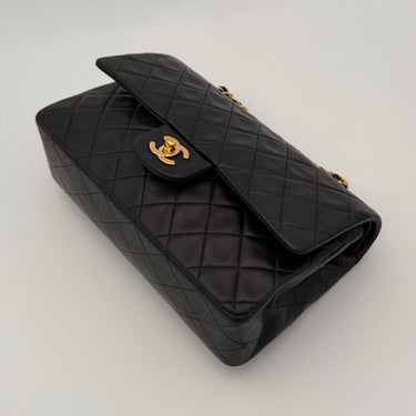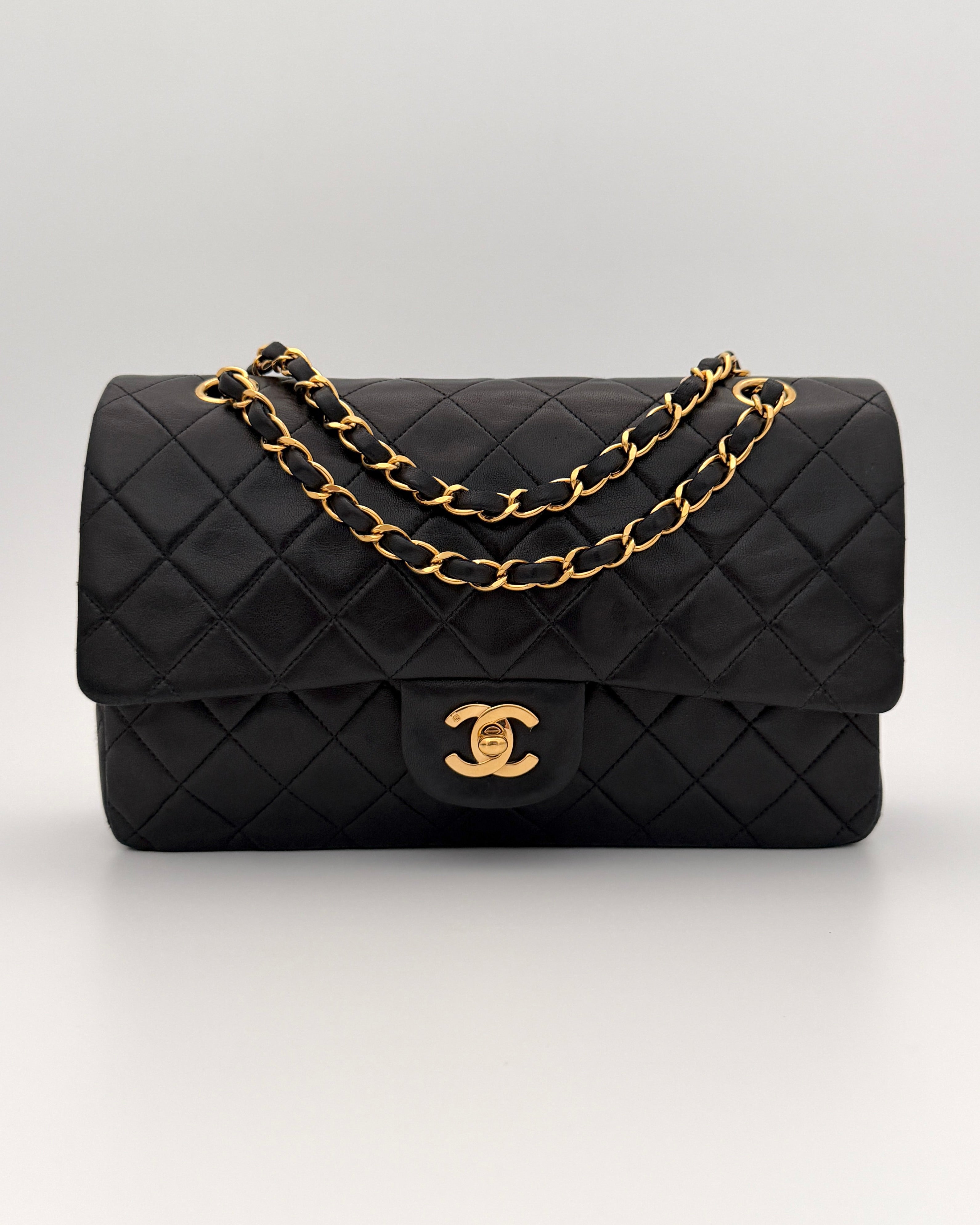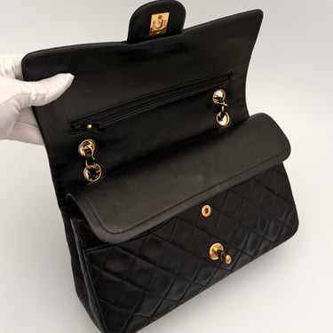 Chanel Timeless 25 double-flap bag in black leather with gold-tone hardware.
