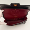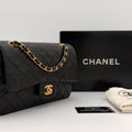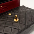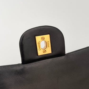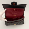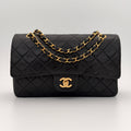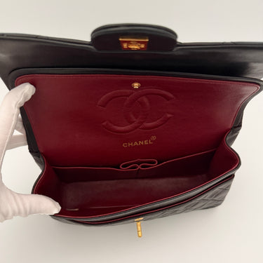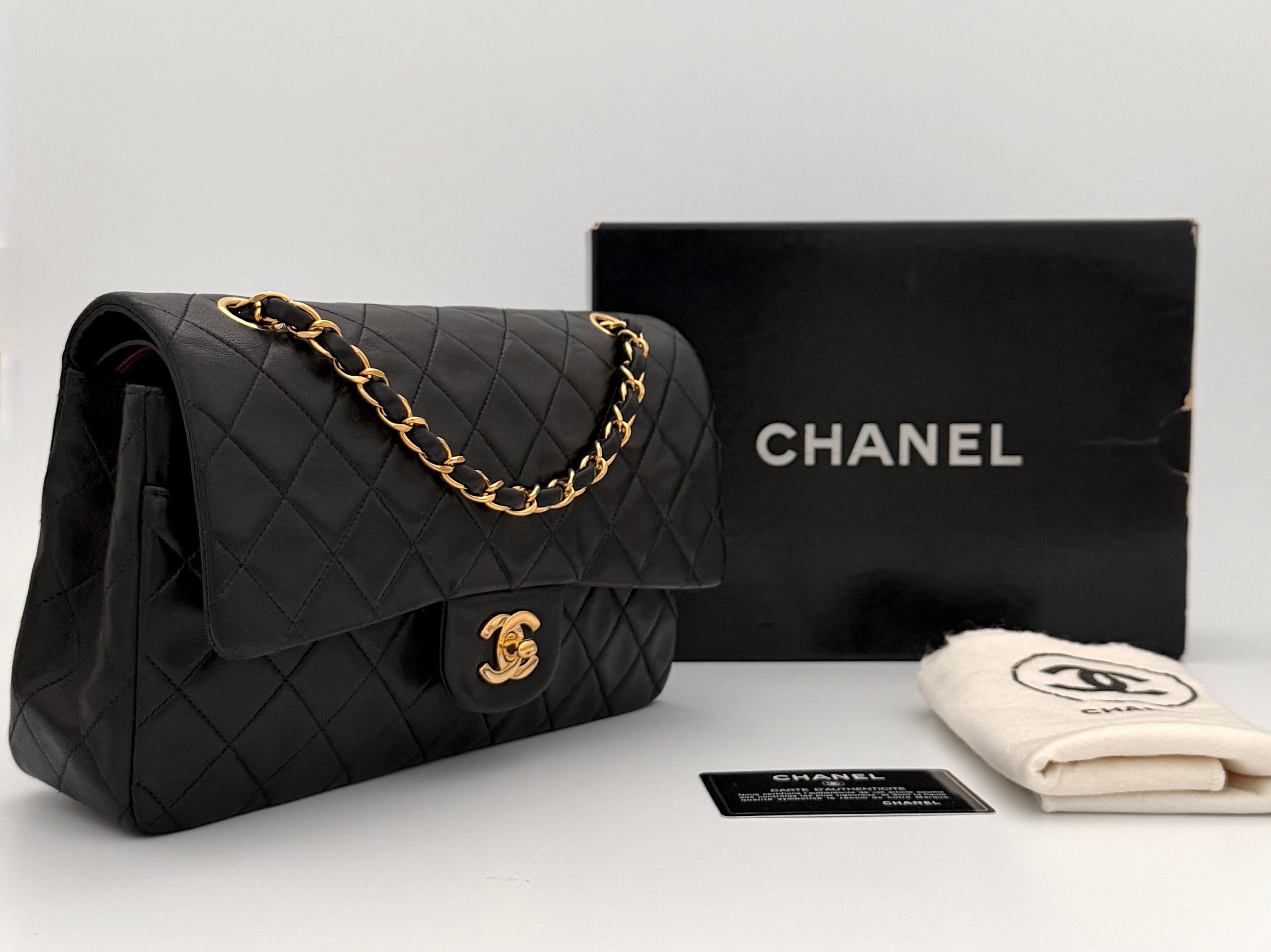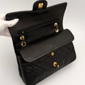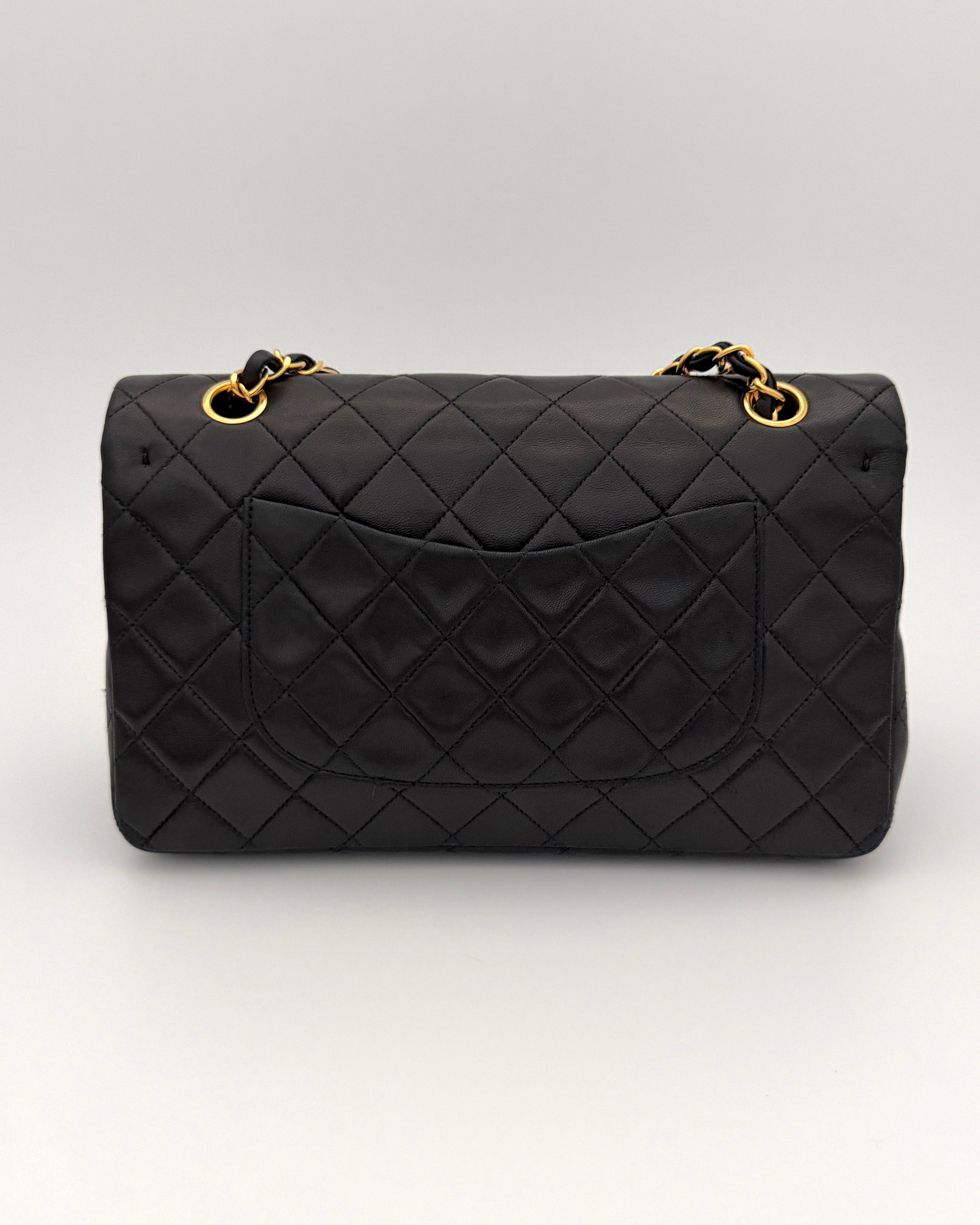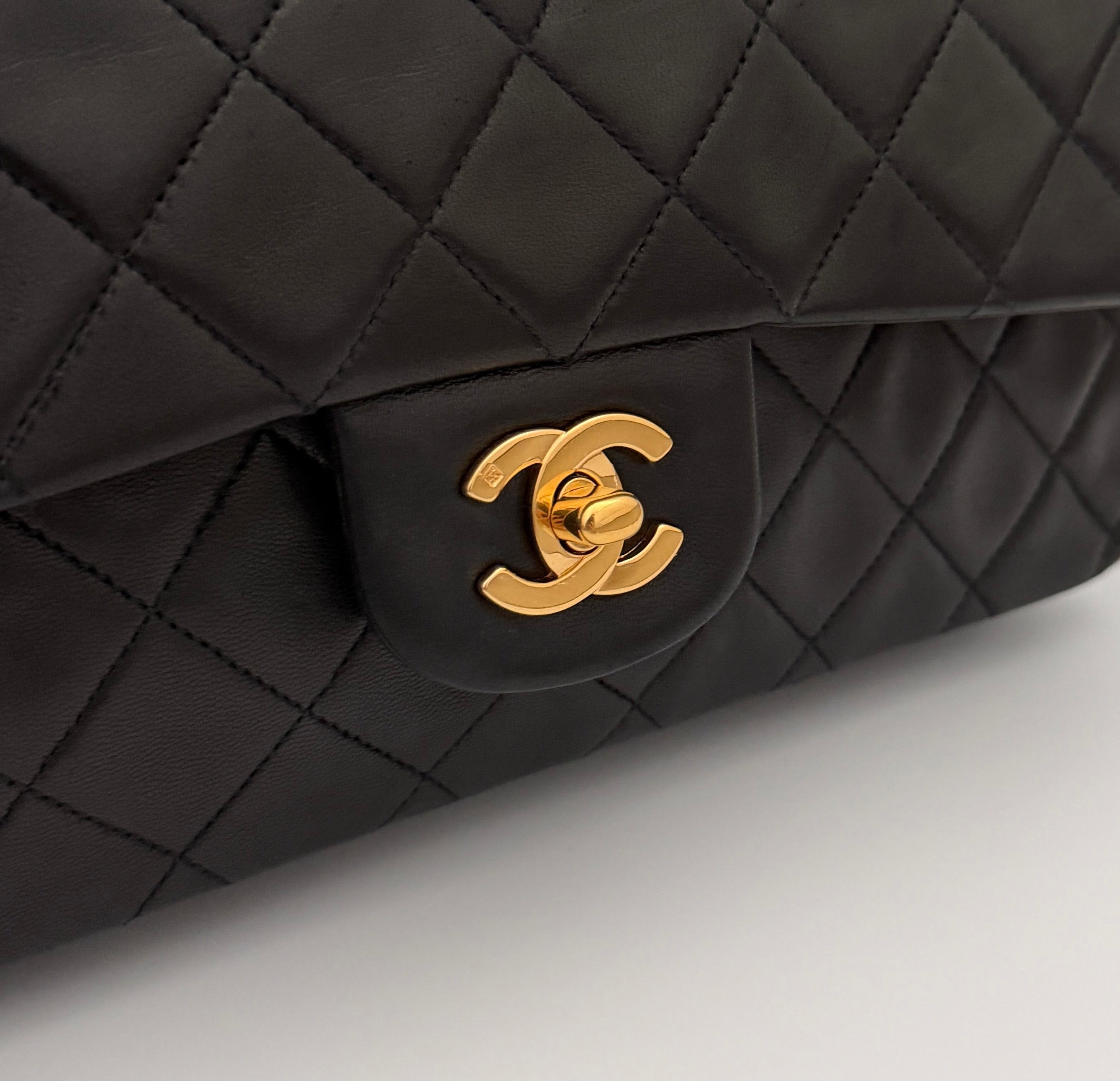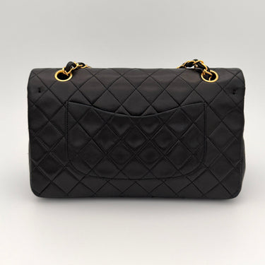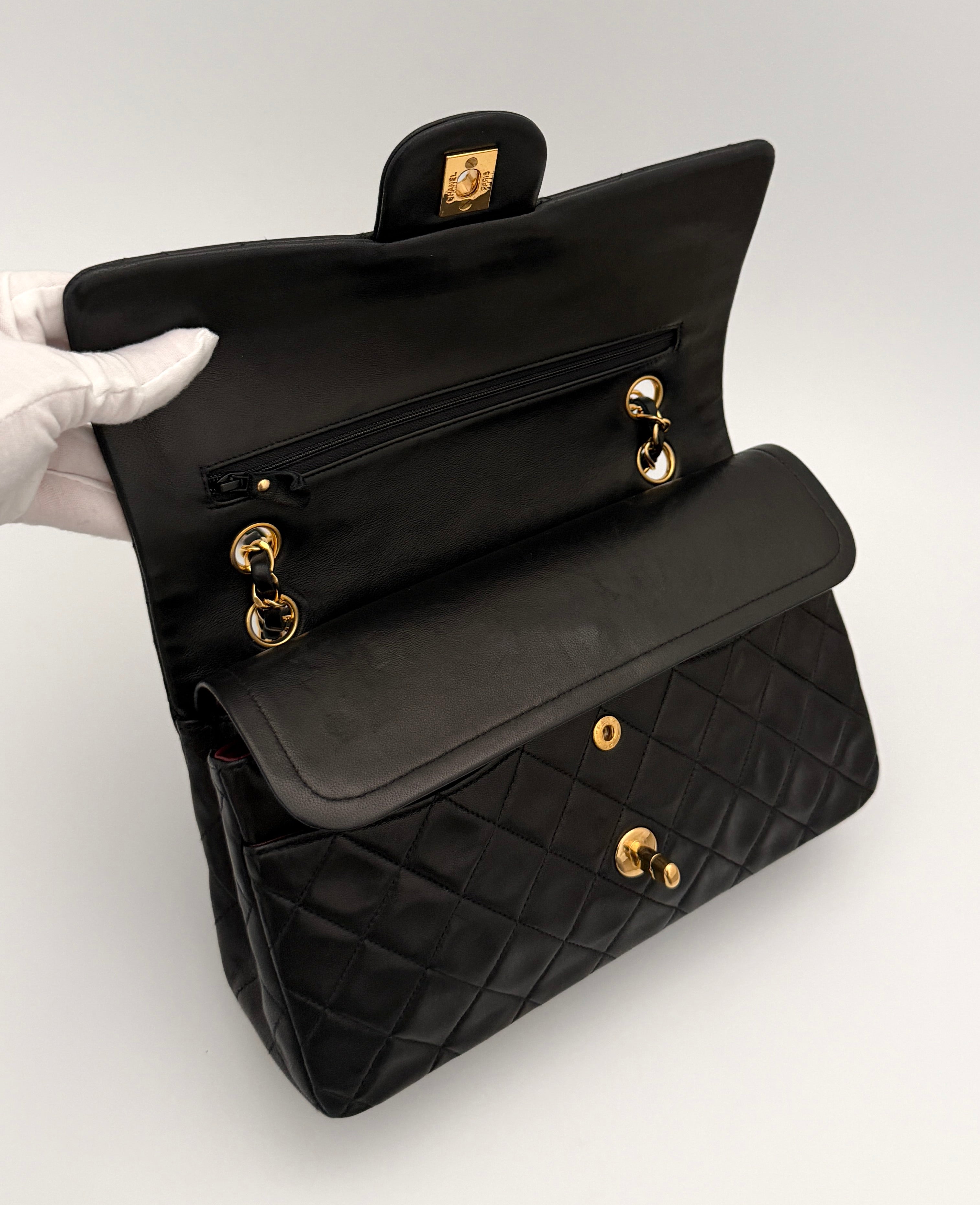 Chanel Timeless 25 double-flap bag in black leather with gold-tone hardware.