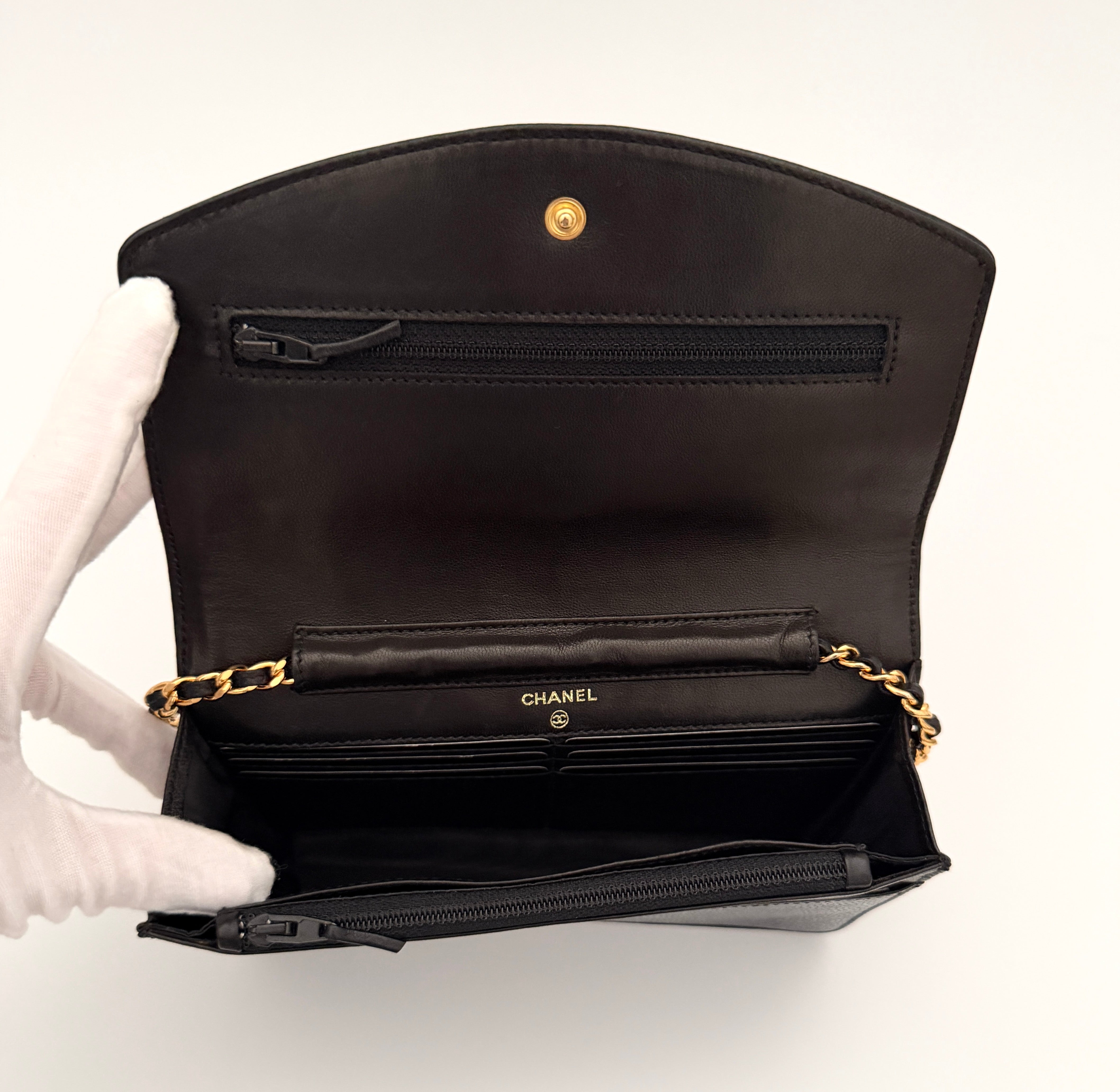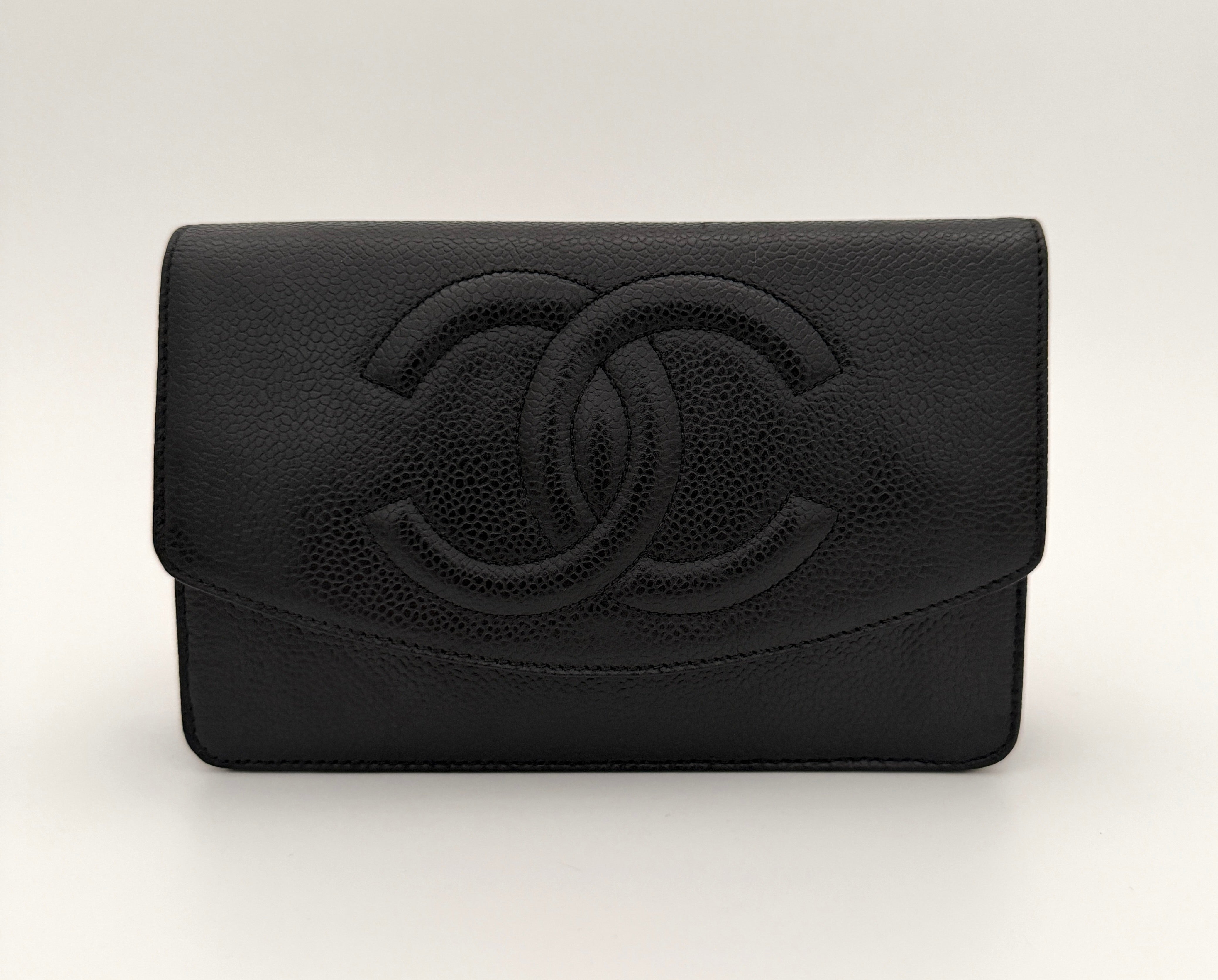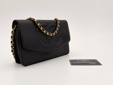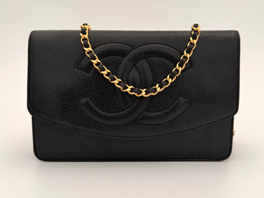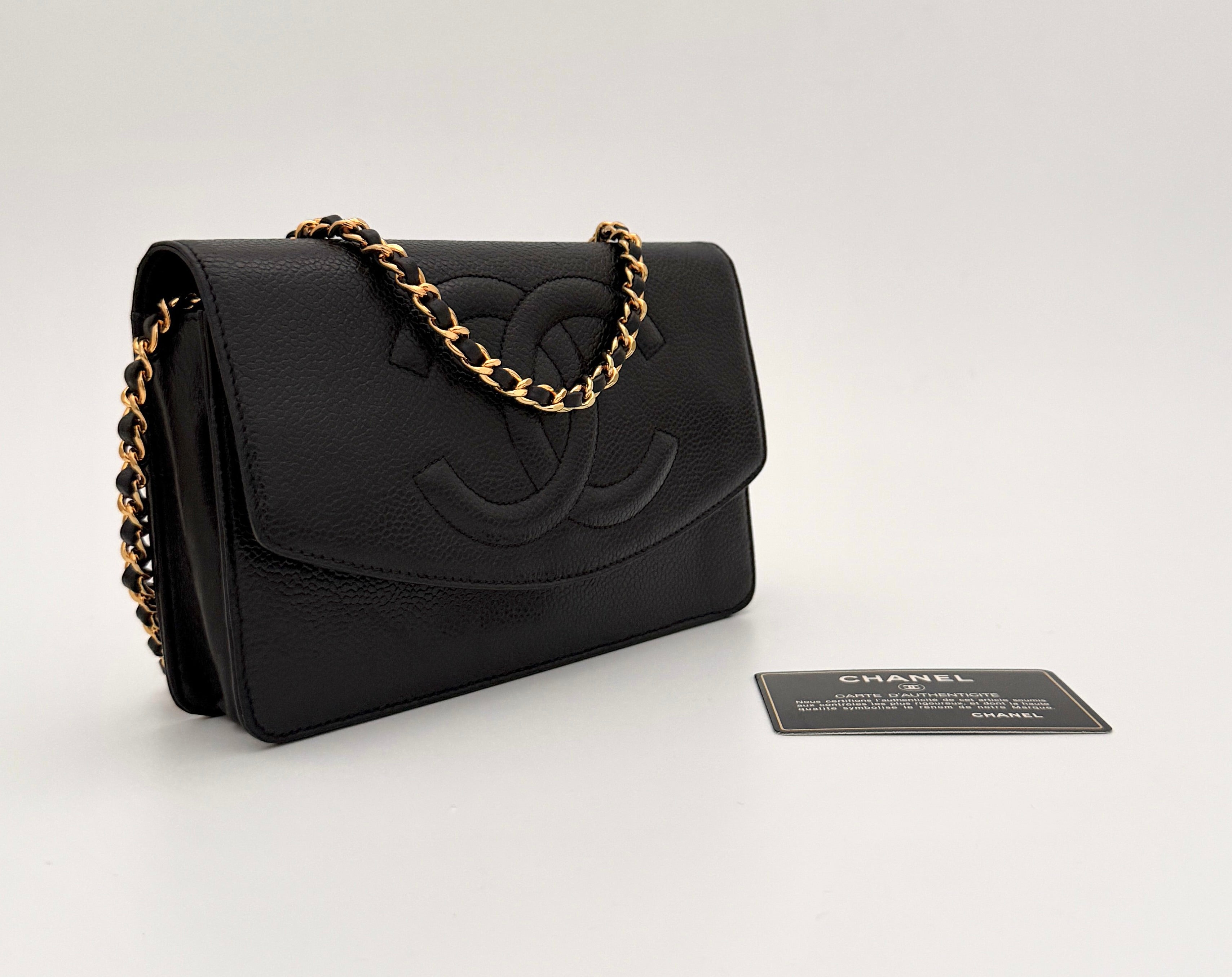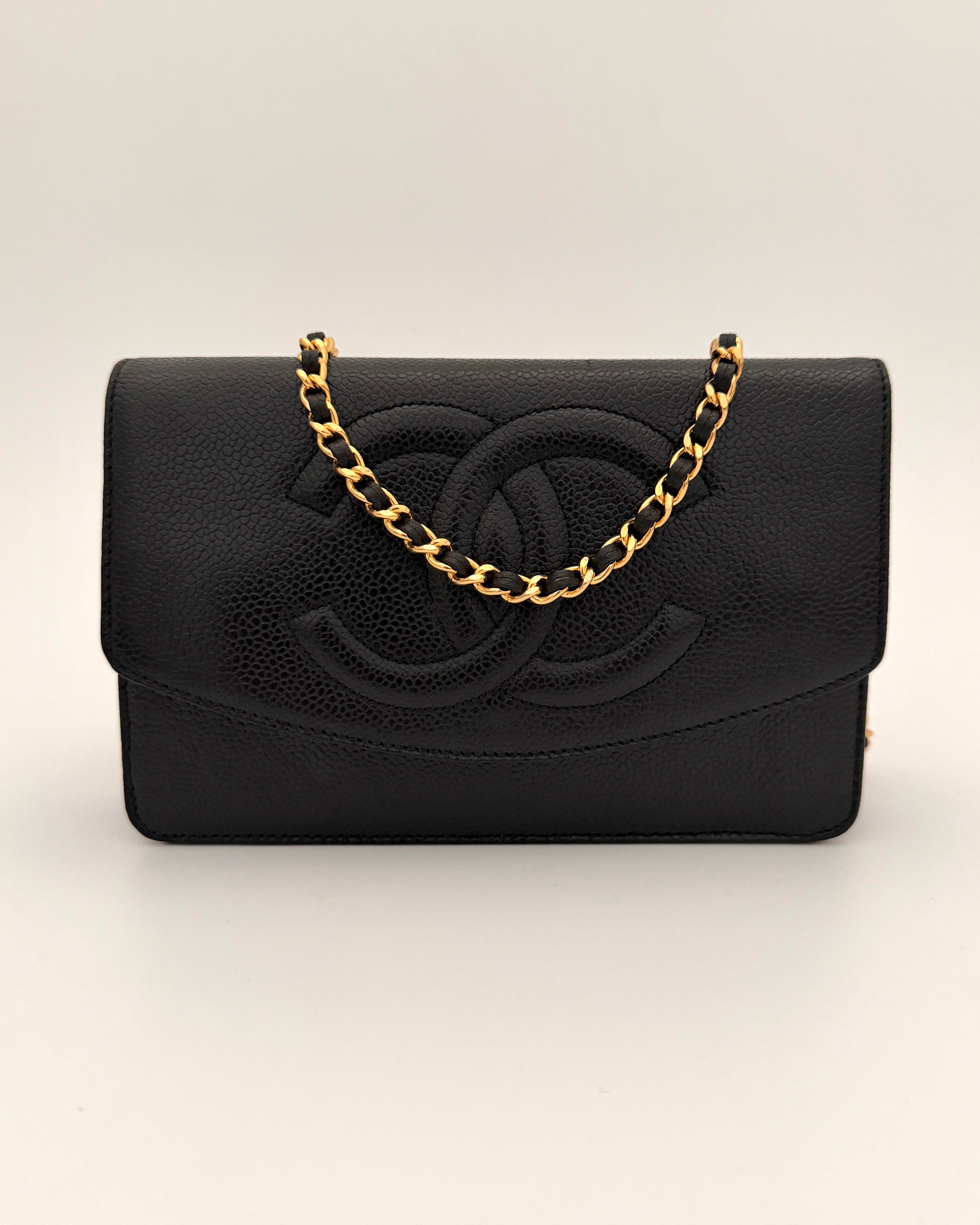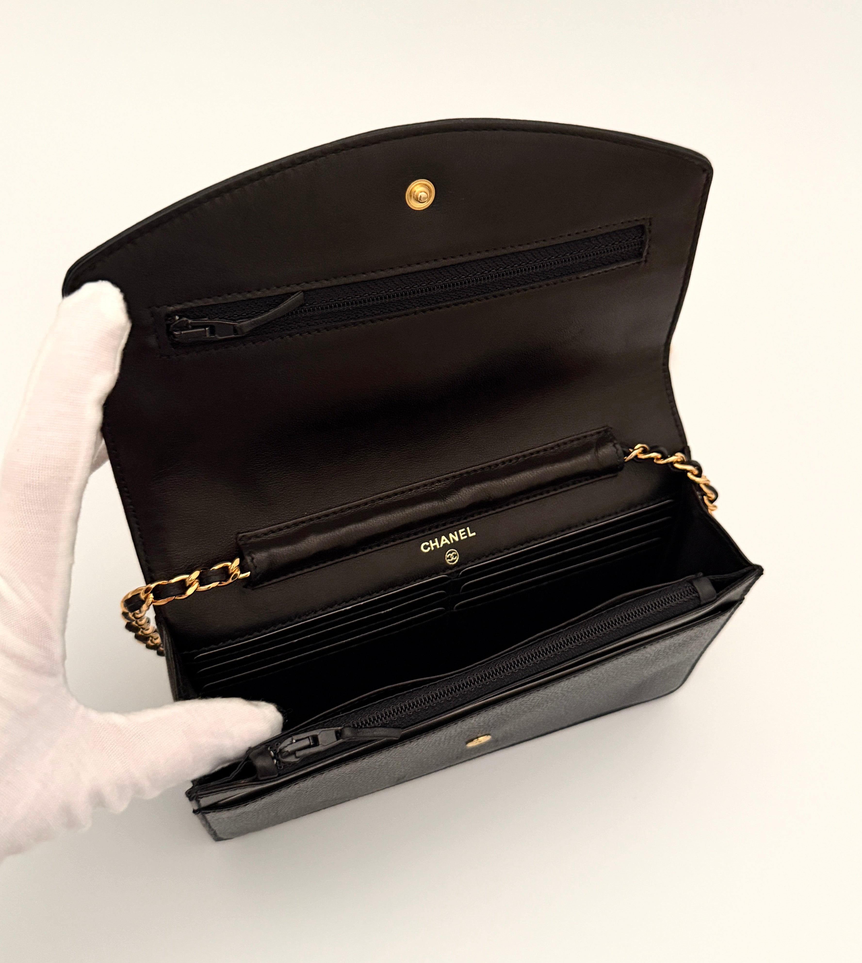 Chanel WOC bag in black caviar leather with gold-tone metal details.
