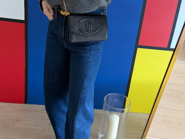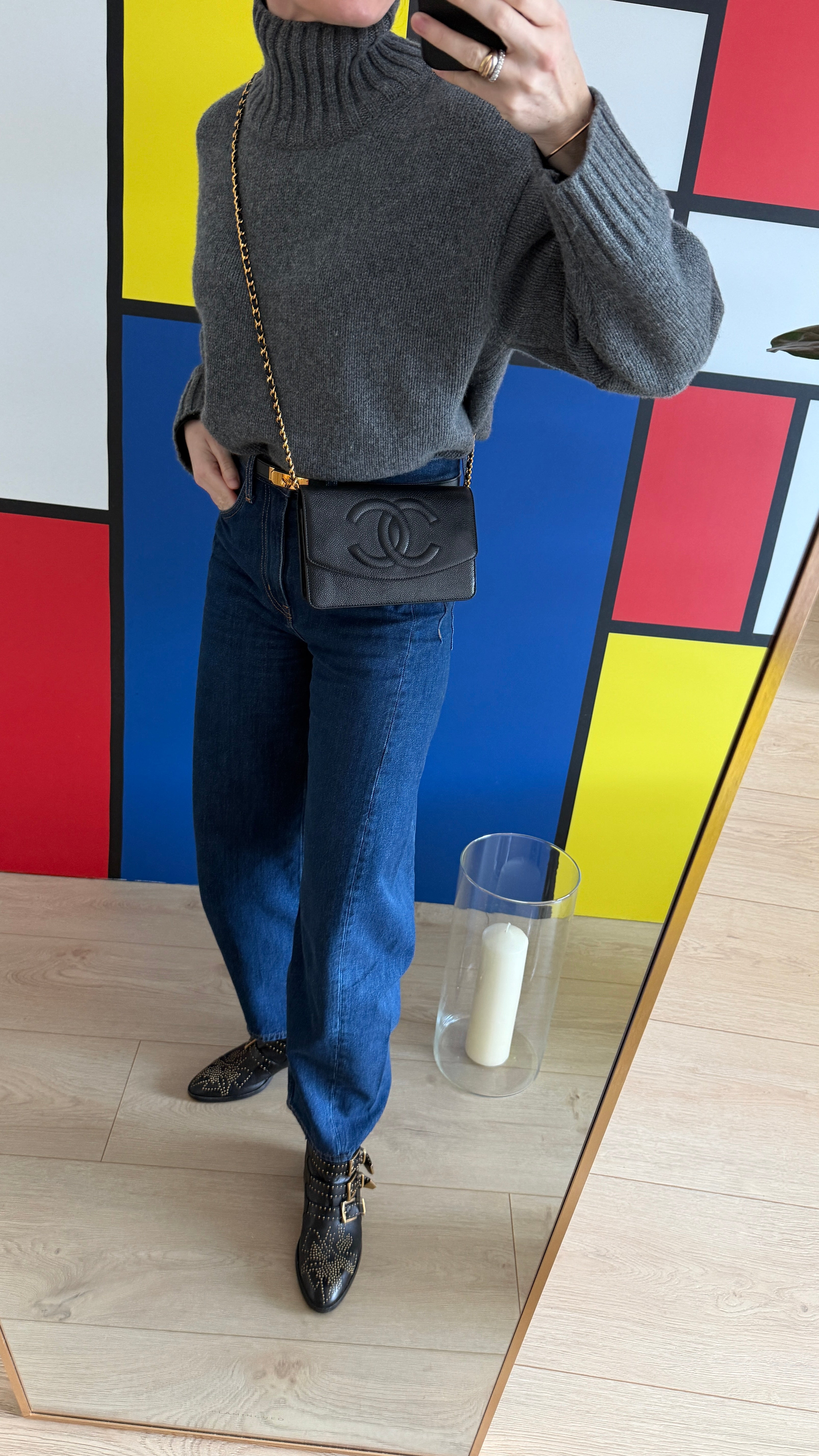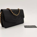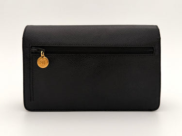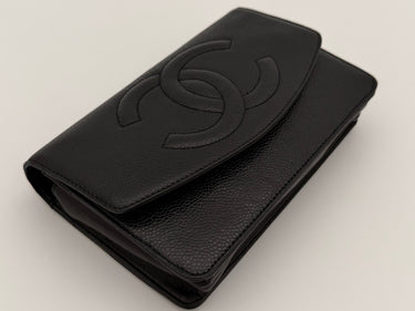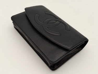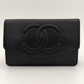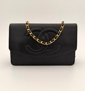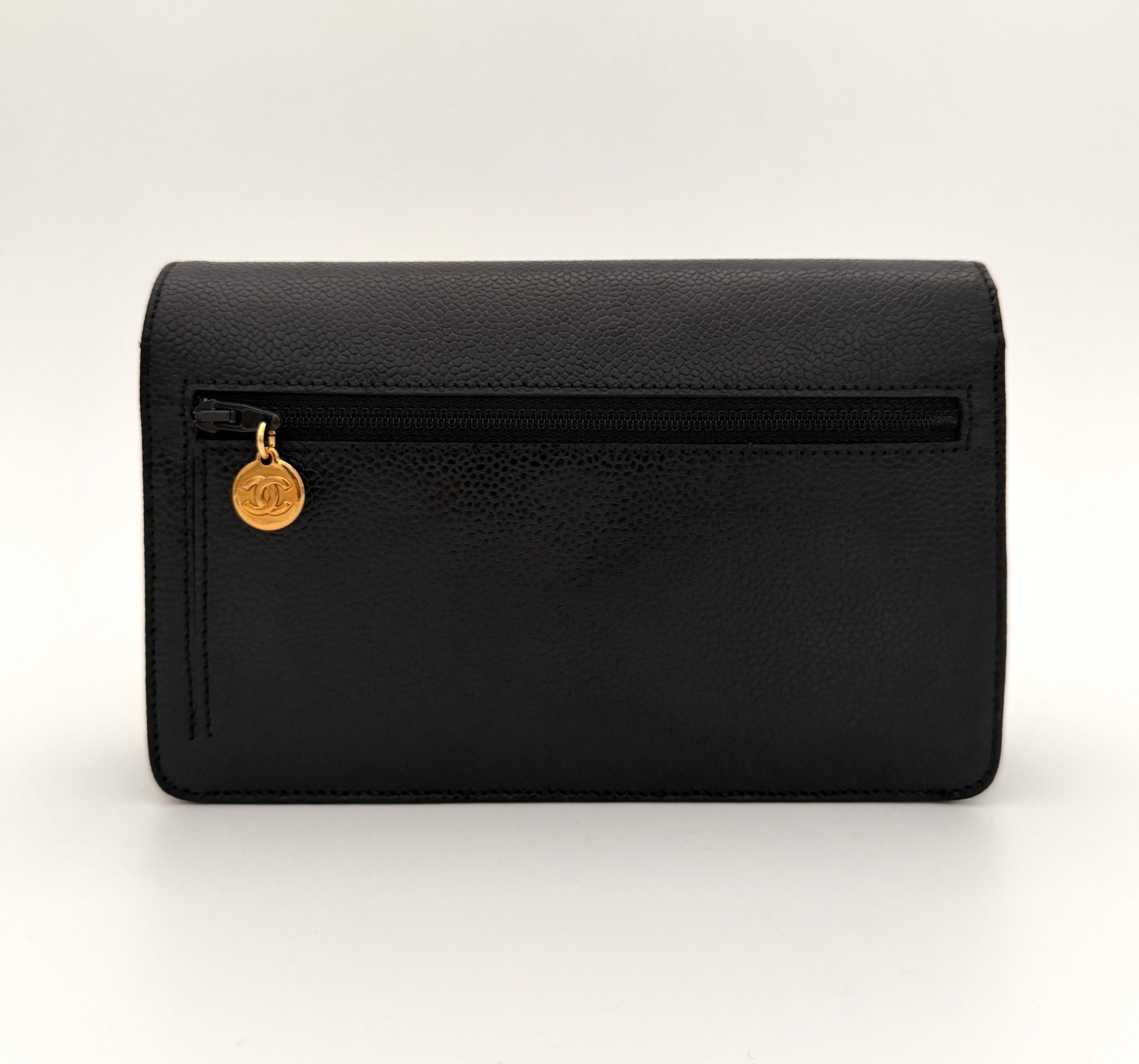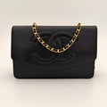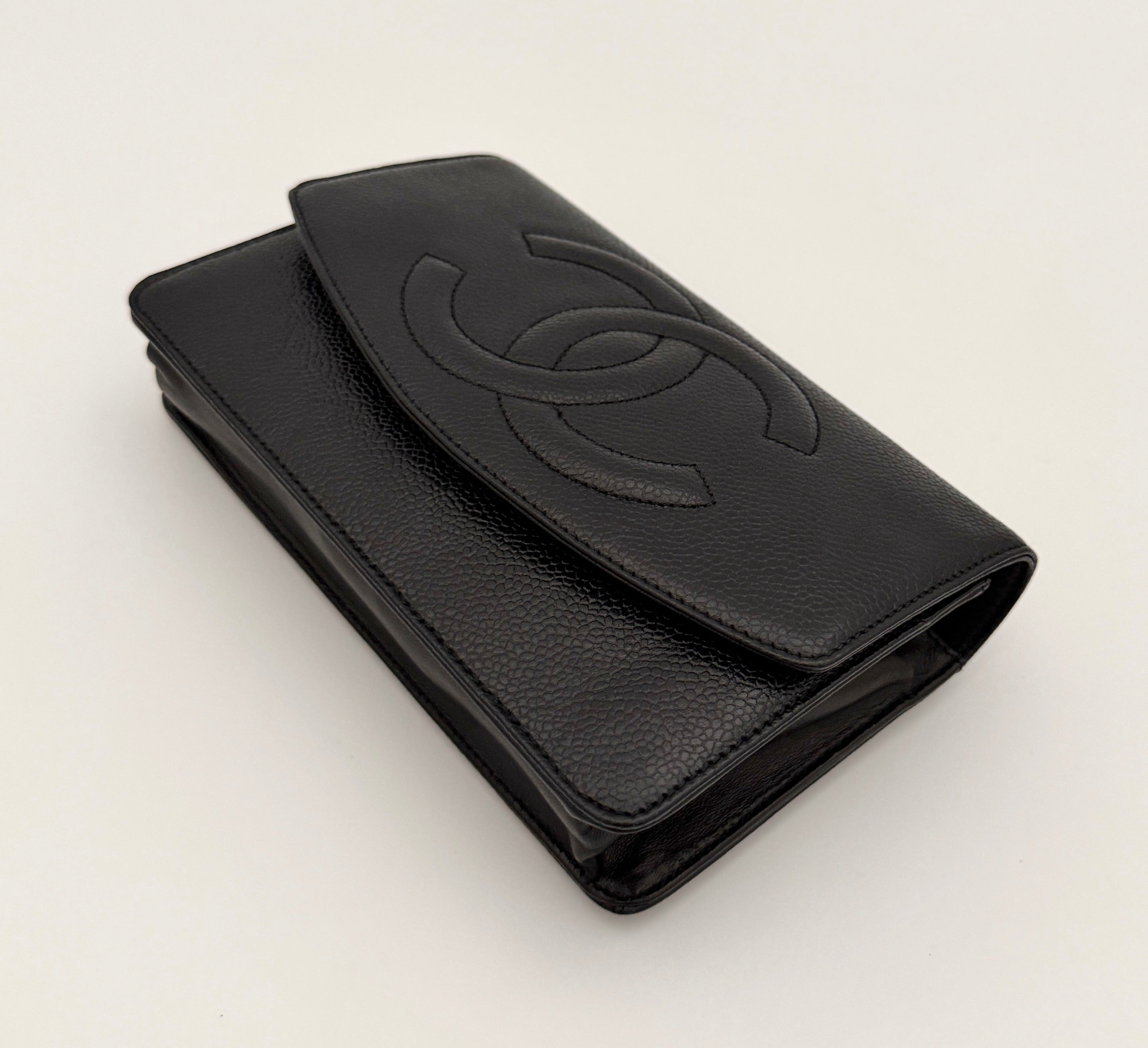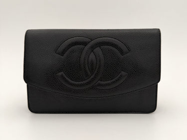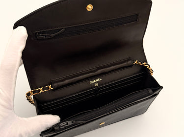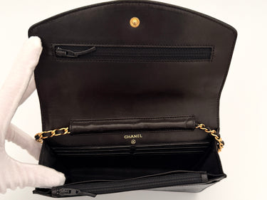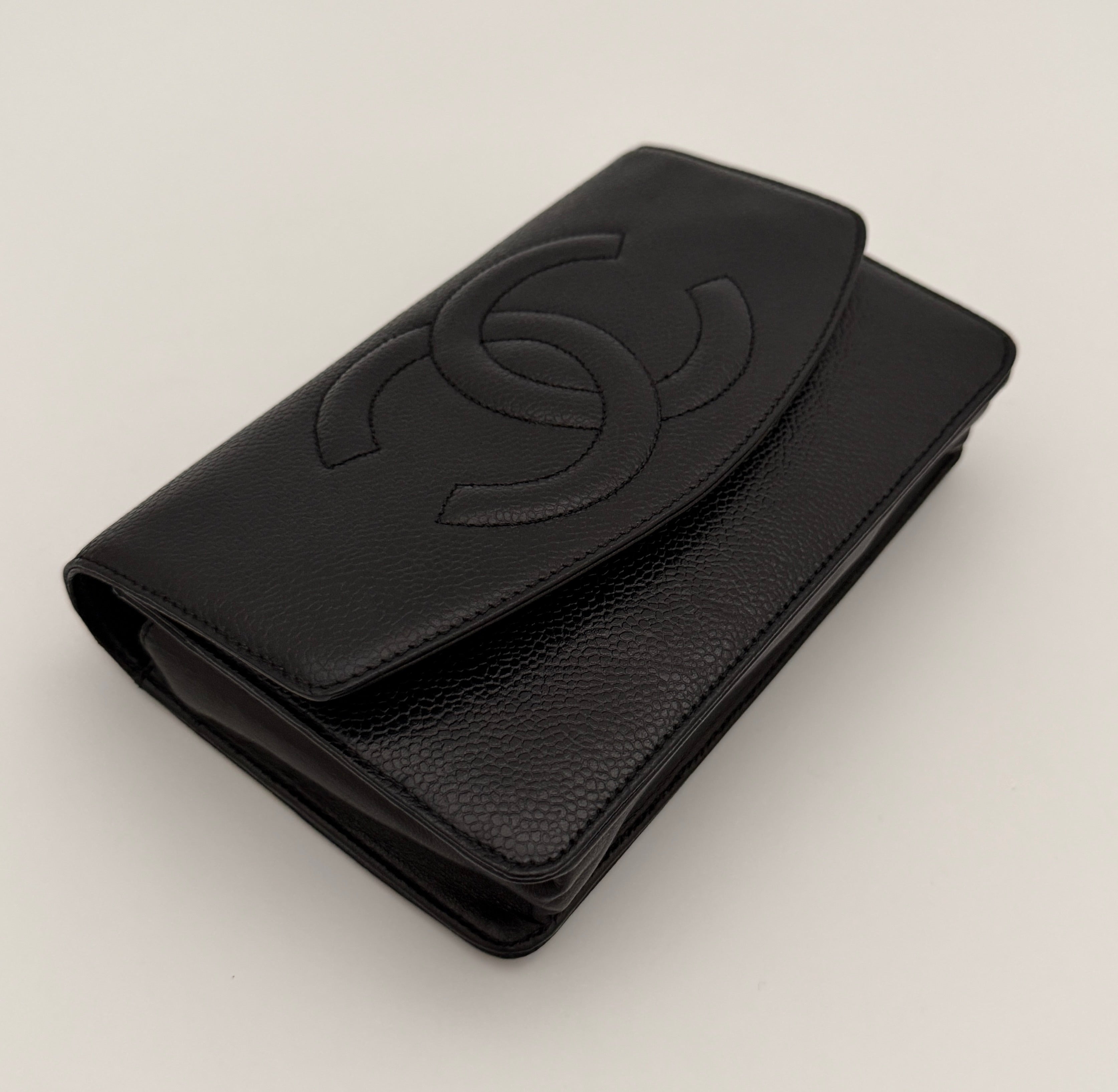 Chanel WOC bag in black caviar leather with gold-tone metal details.