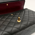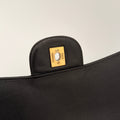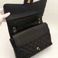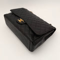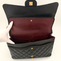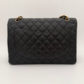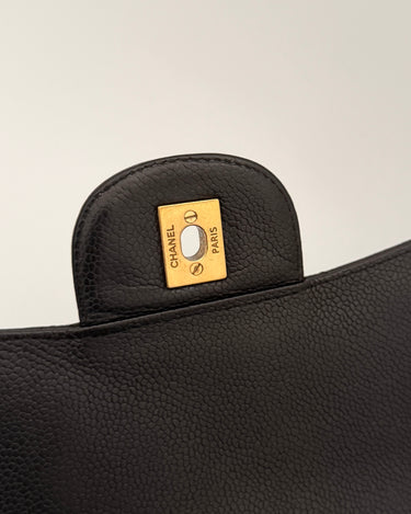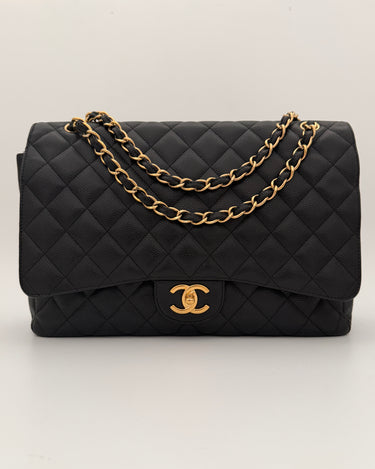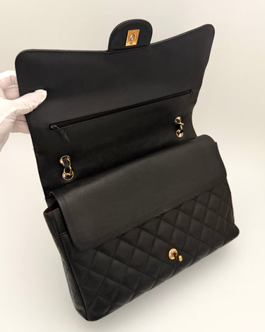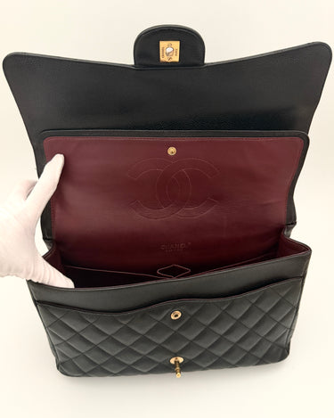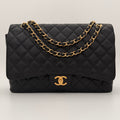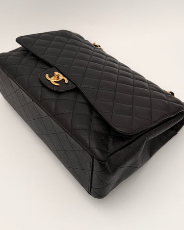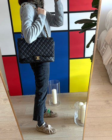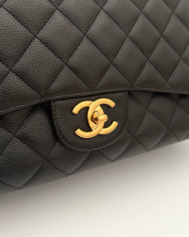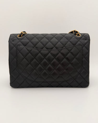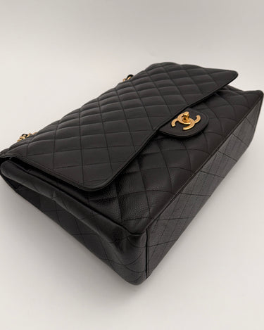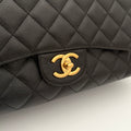 Chanel maxi jumbo double flap bag in black caviar leather with gold-tone metal details.