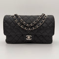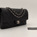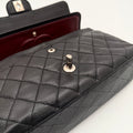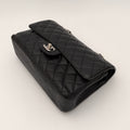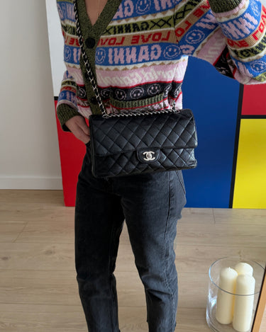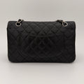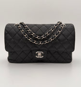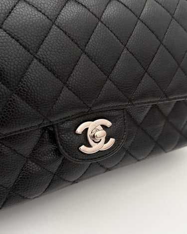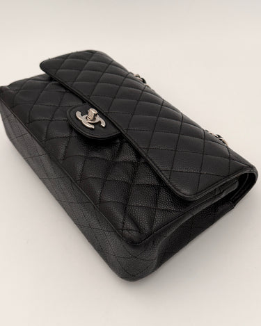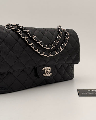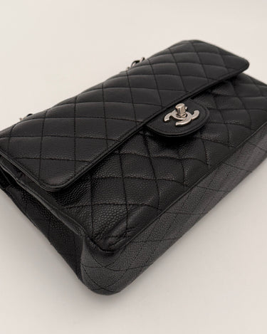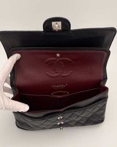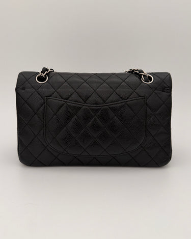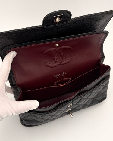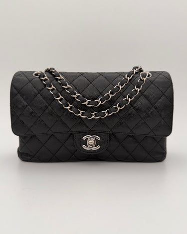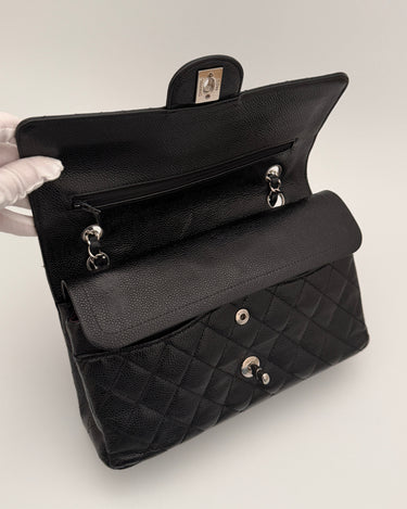 Chanel Timeless 25 double flap bag in black caviar leather with silver-tone hardware.