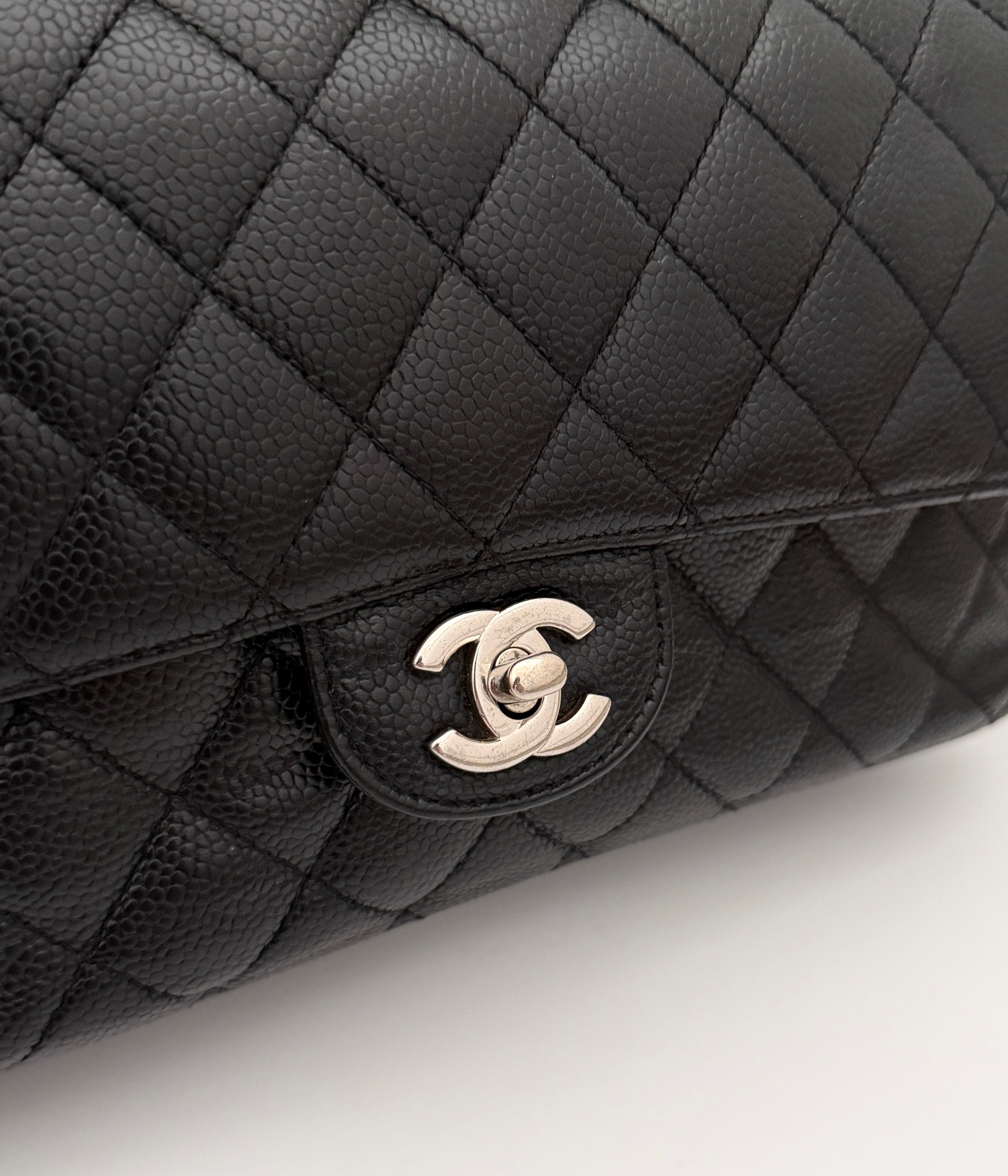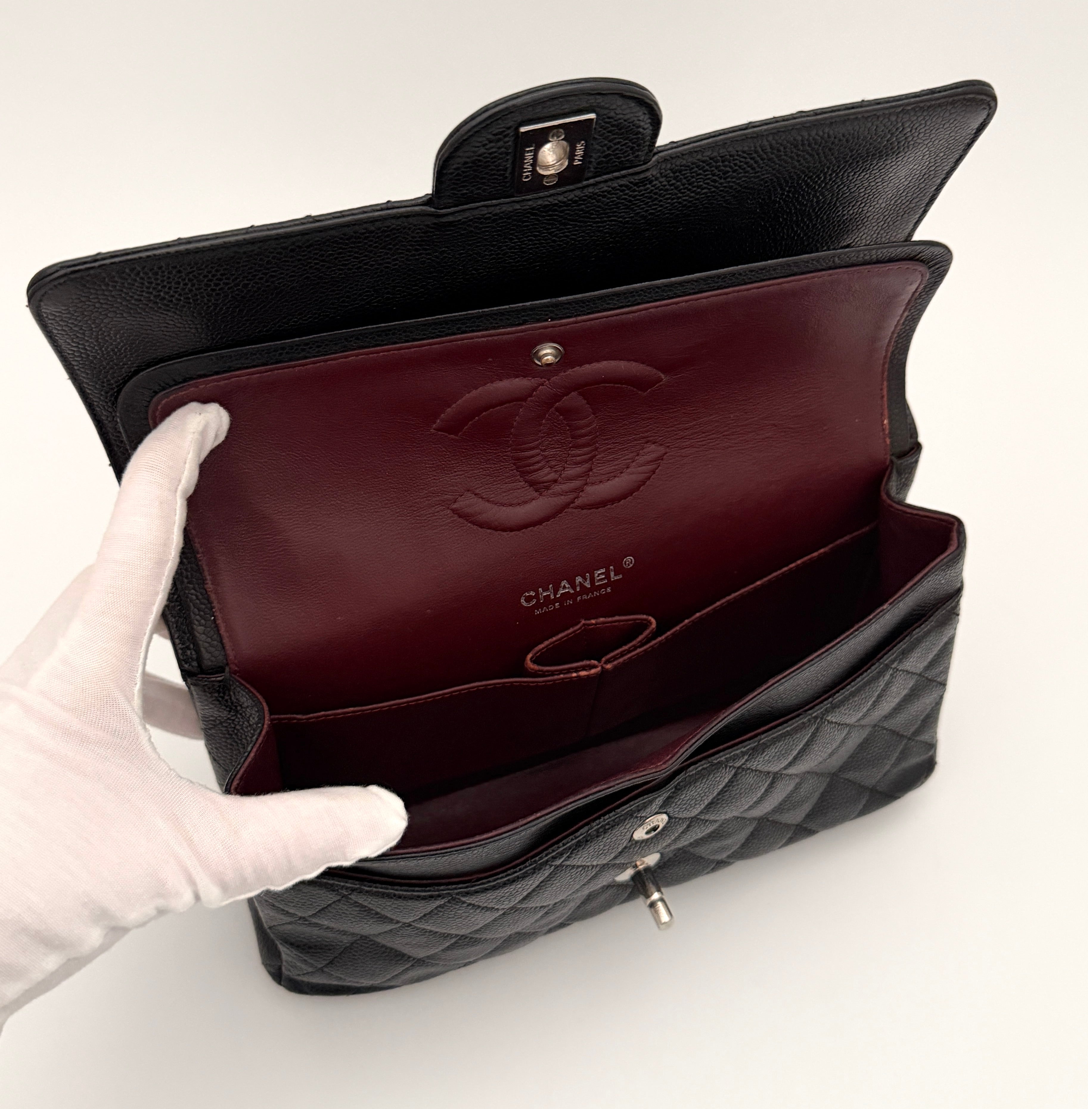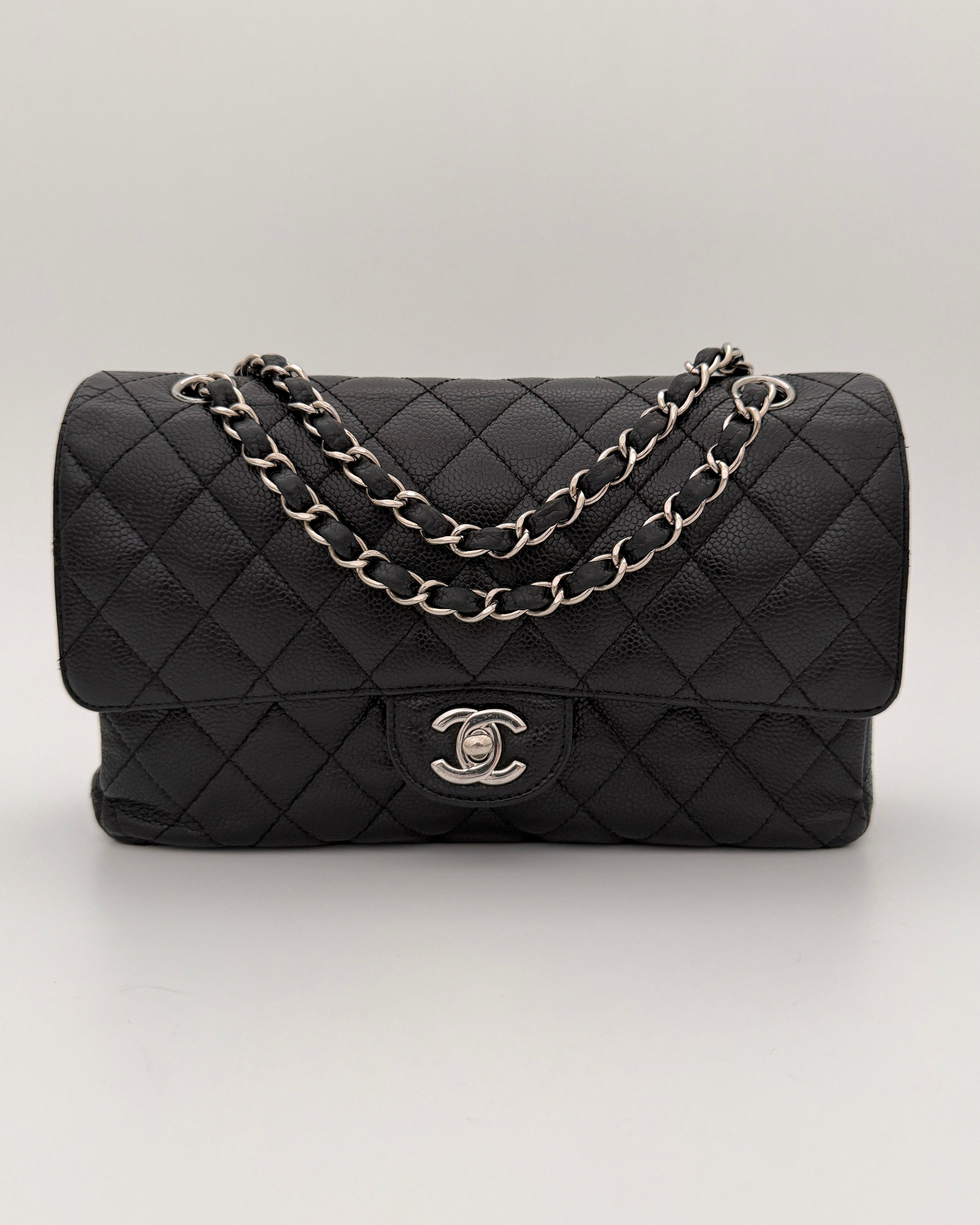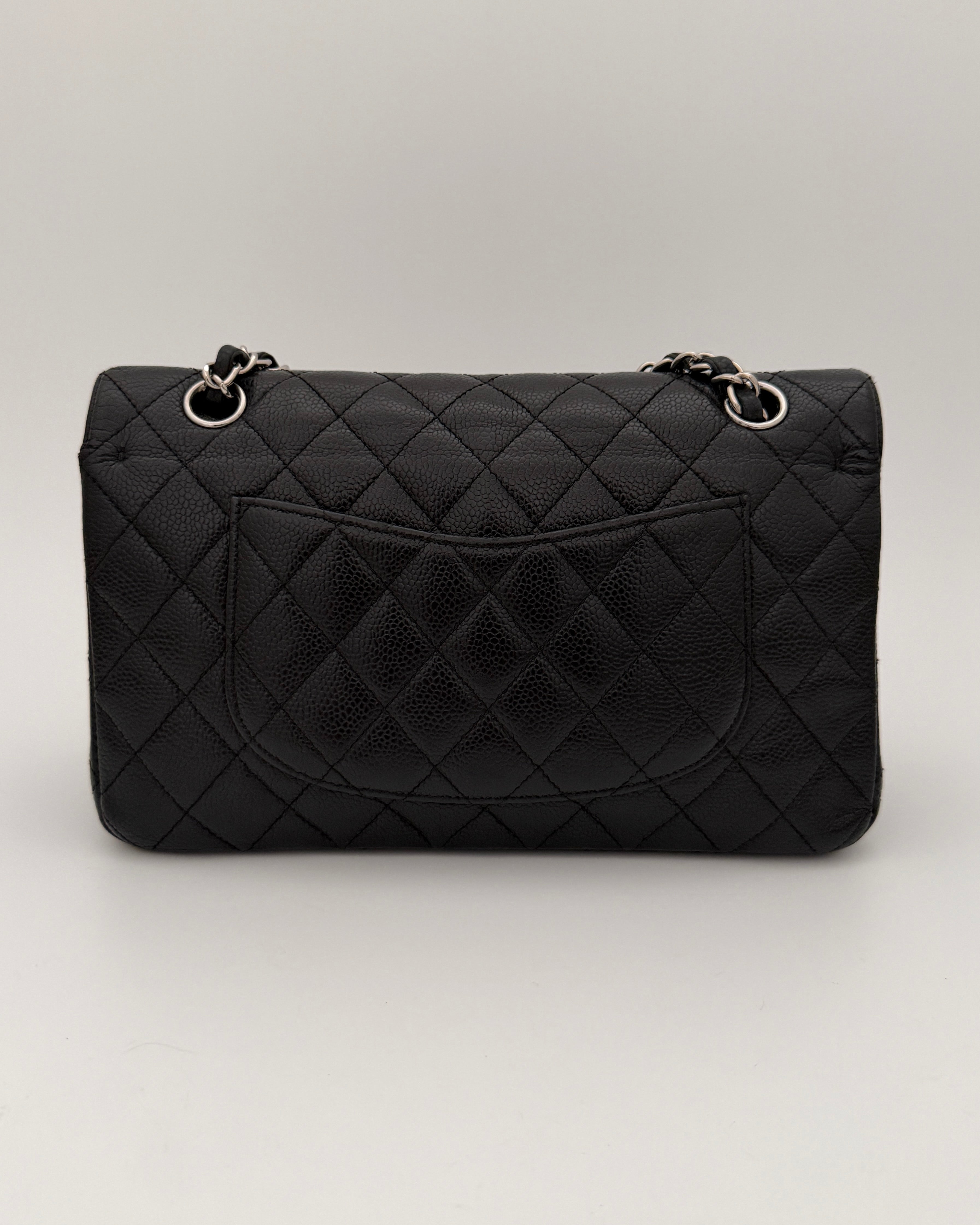 Bolso Chanel Timeless 25 de doble solapa en cuero caviar negro con detalles metálicos en plateado.