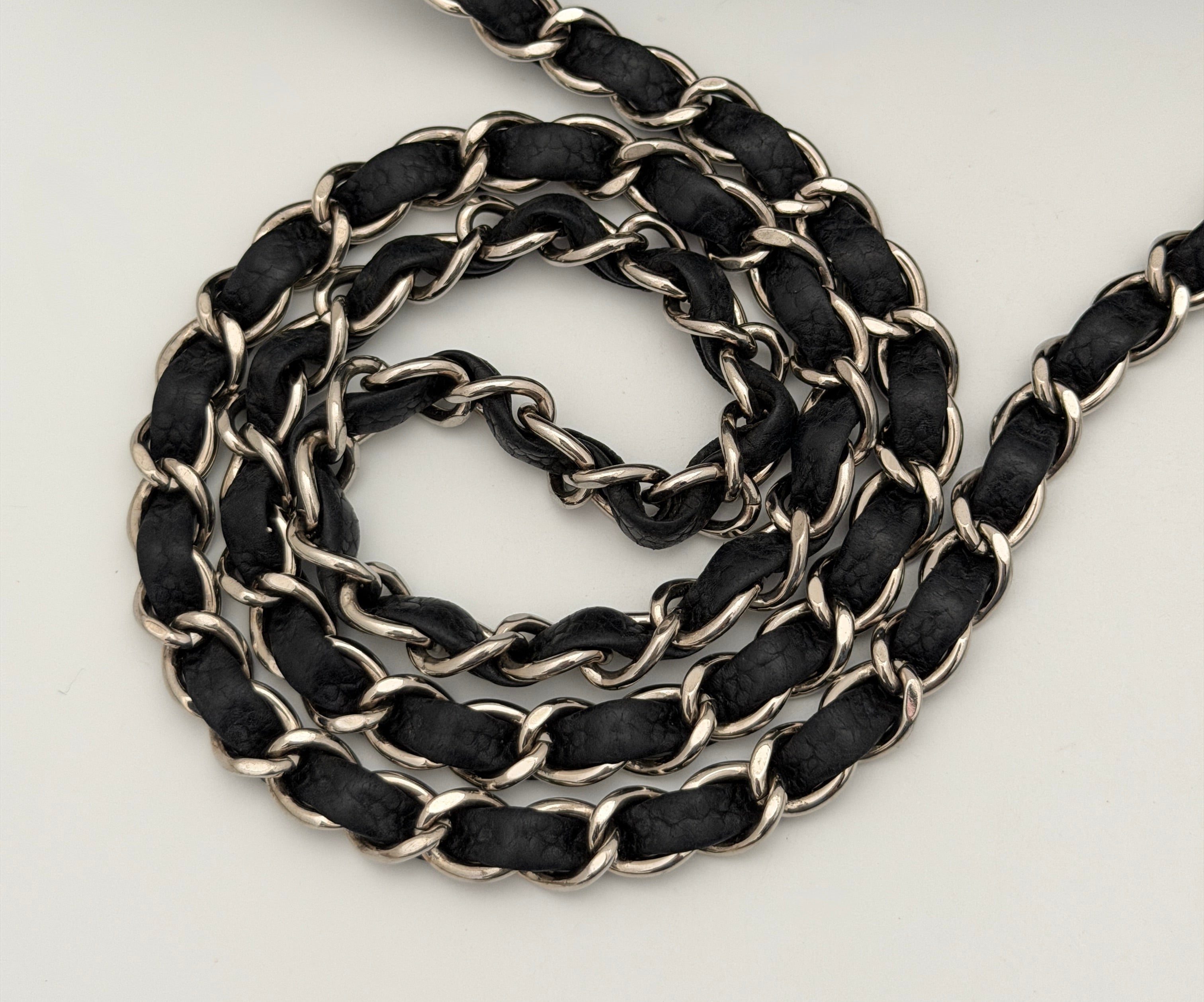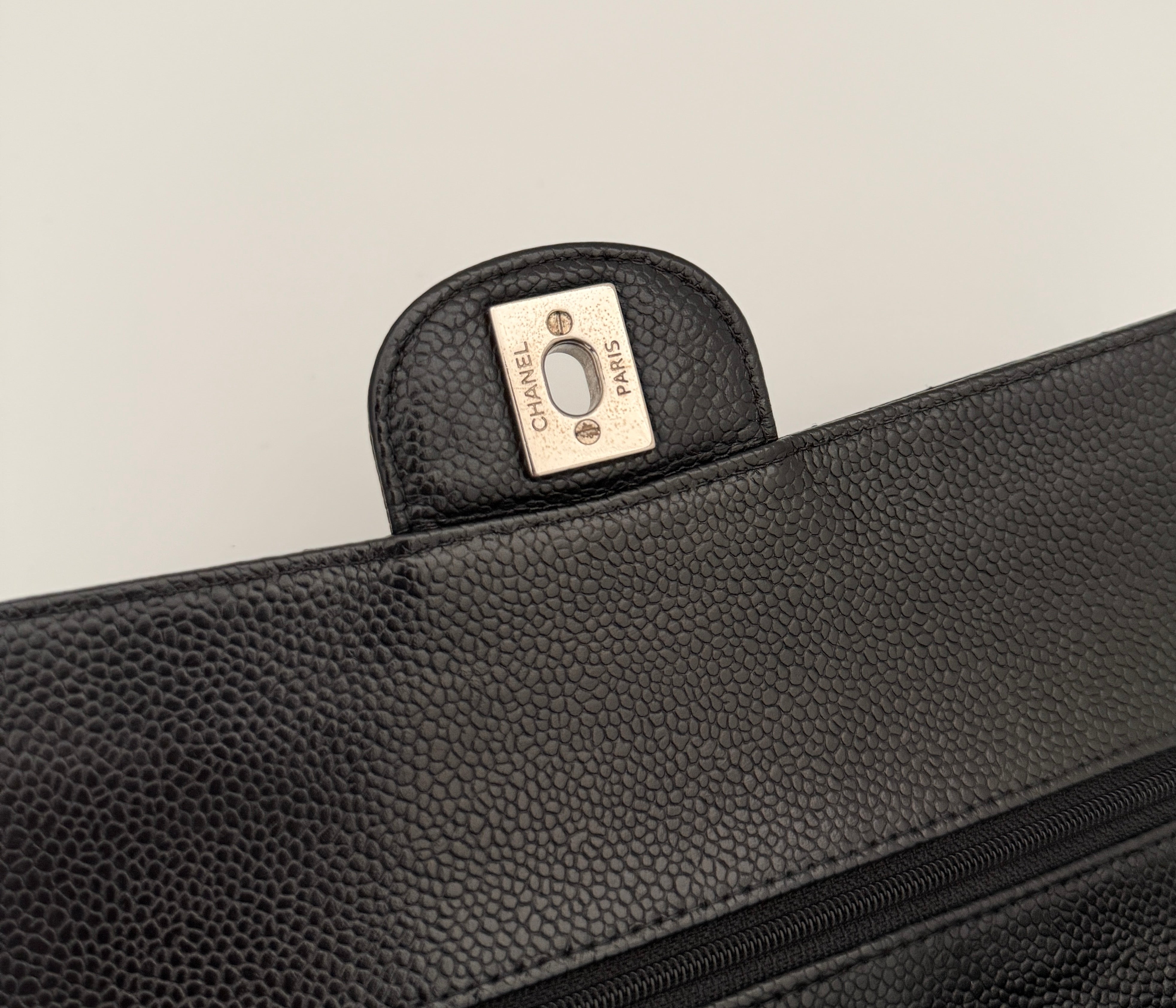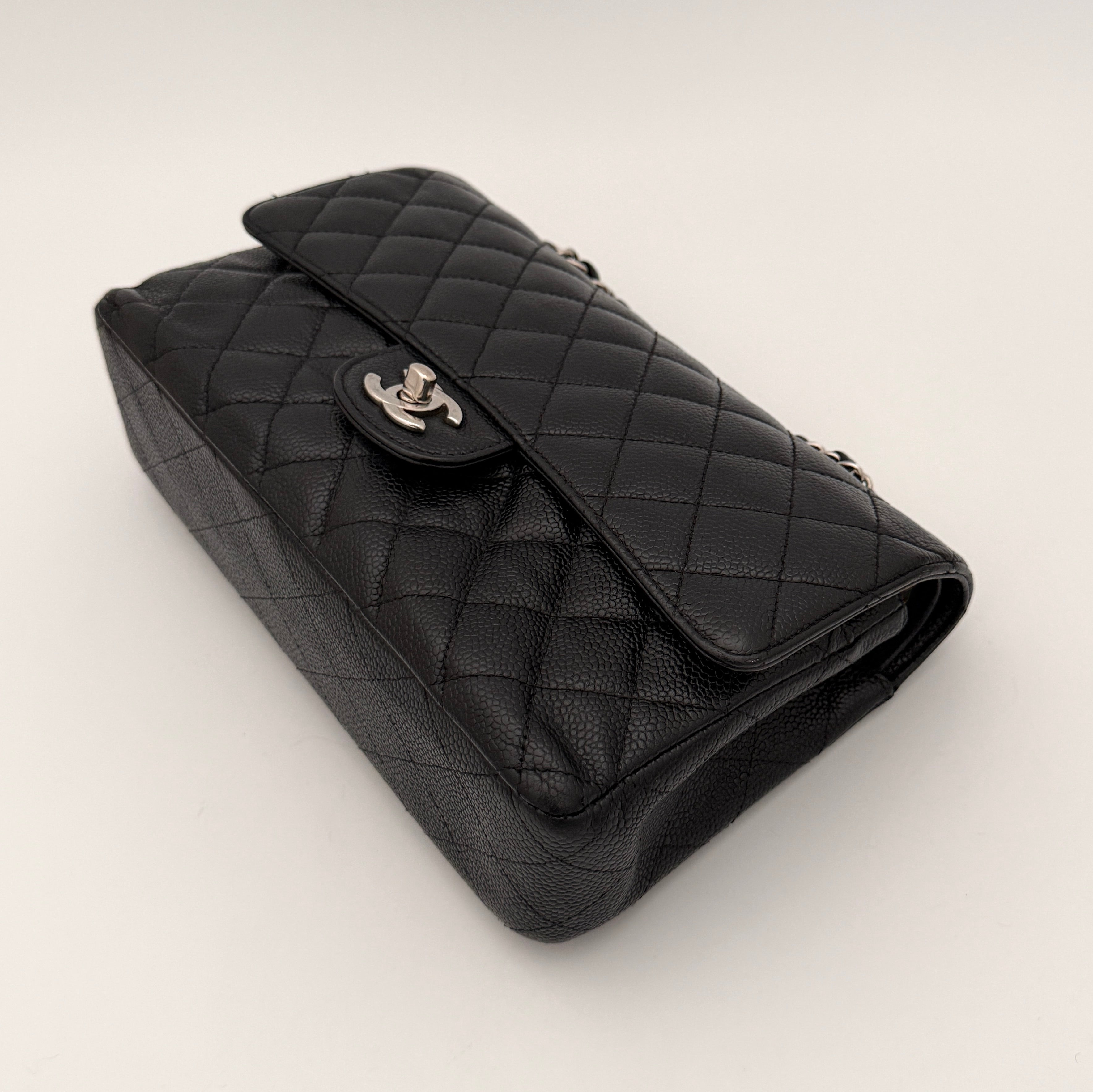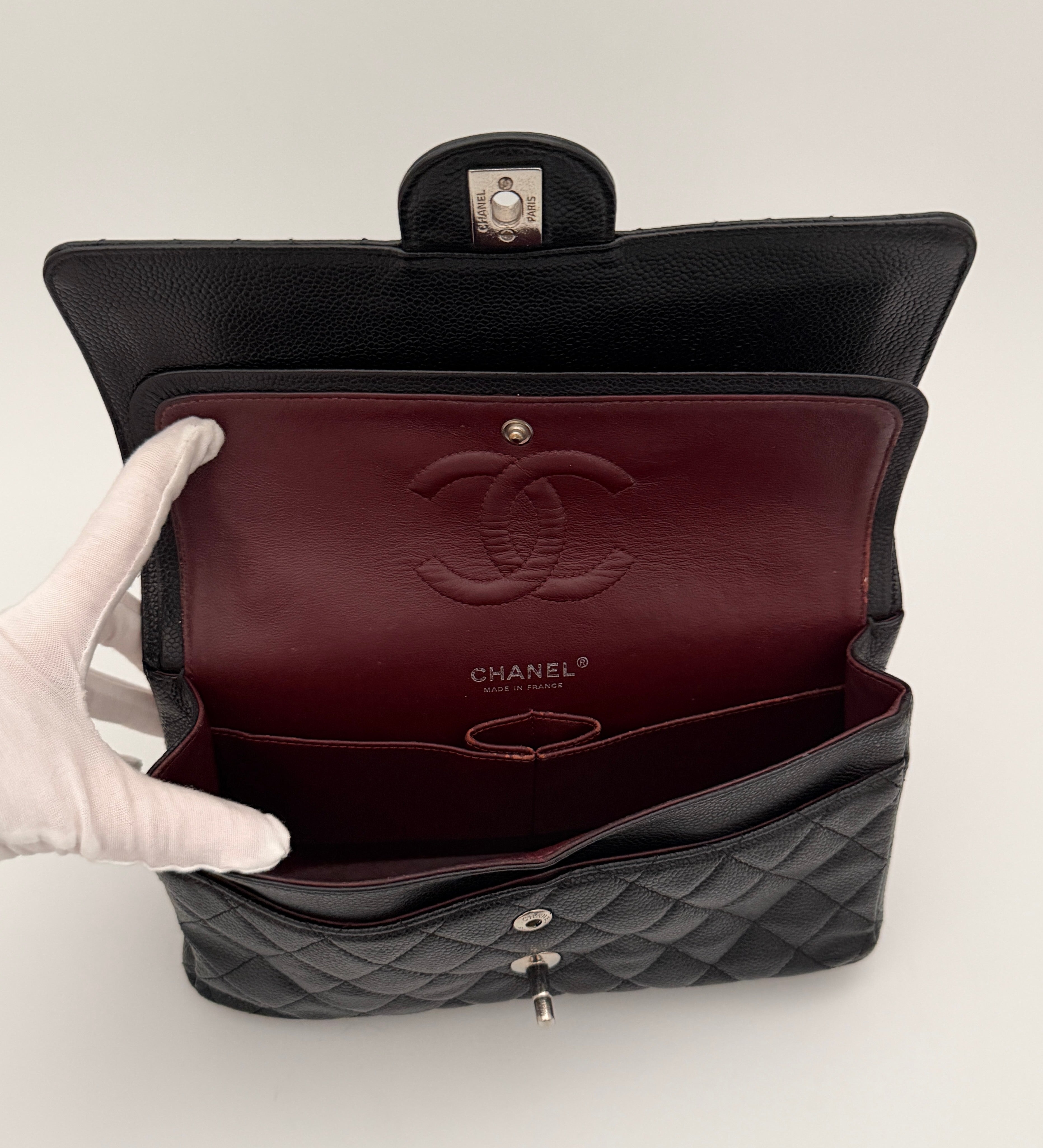 Bolso Chanel Timeless 25 de doble solapa en cuero caviar negro con detalles metálicos en plateado.
