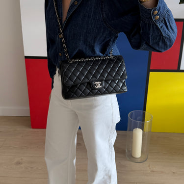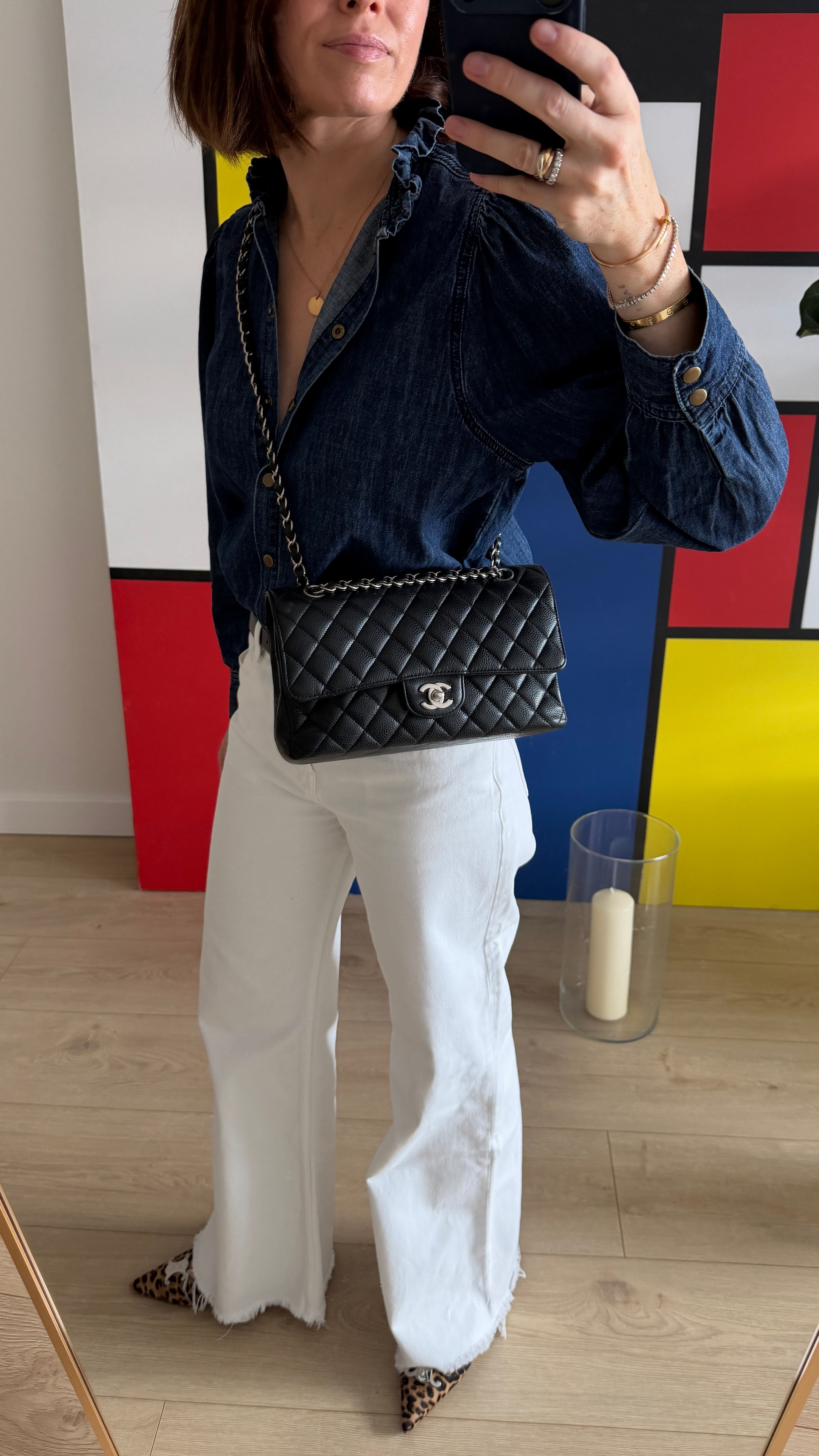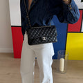 Bolso Chanel Timeless 25 de doble solapa en cuero caviar con detalles metálicos en plateado.