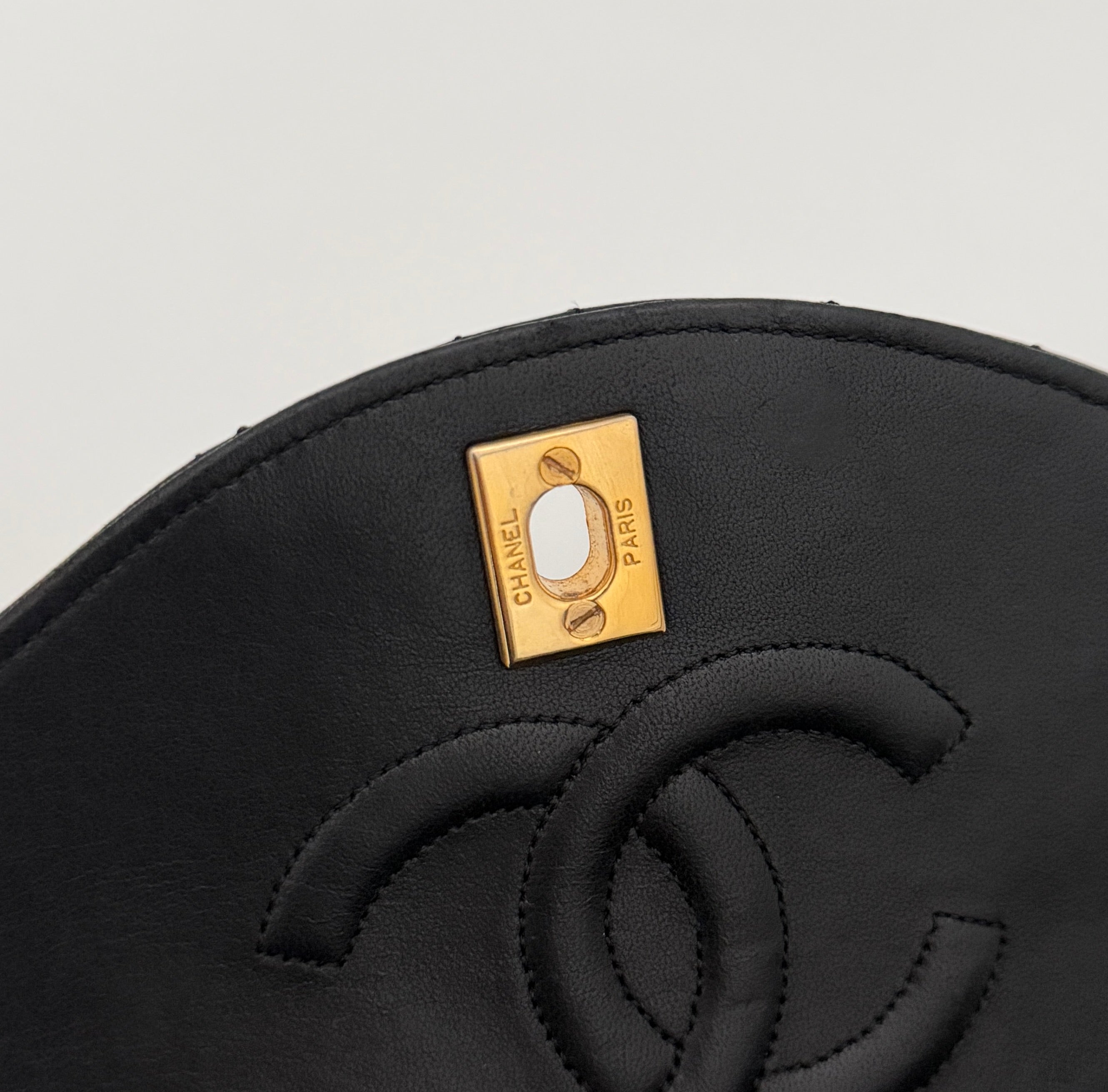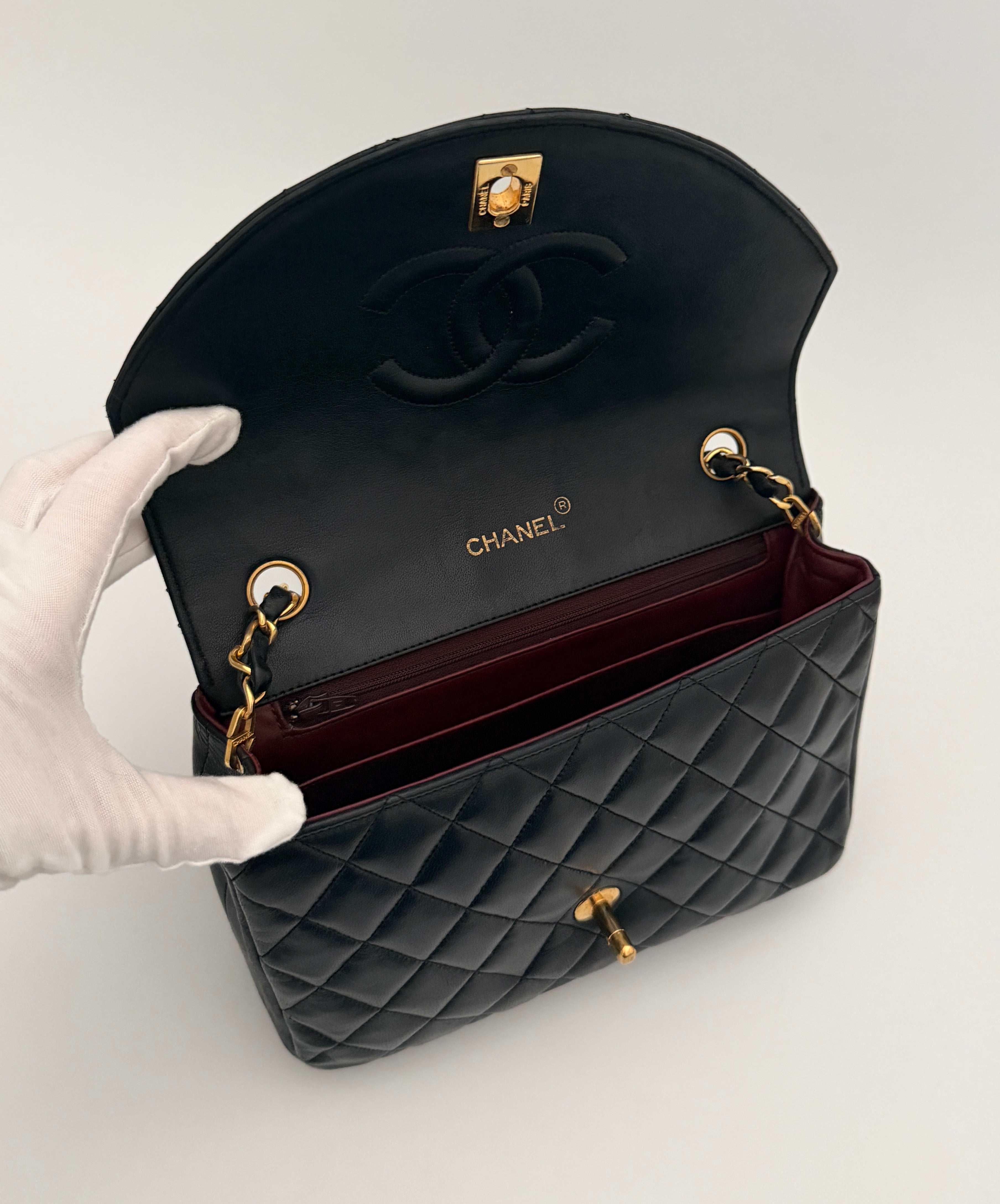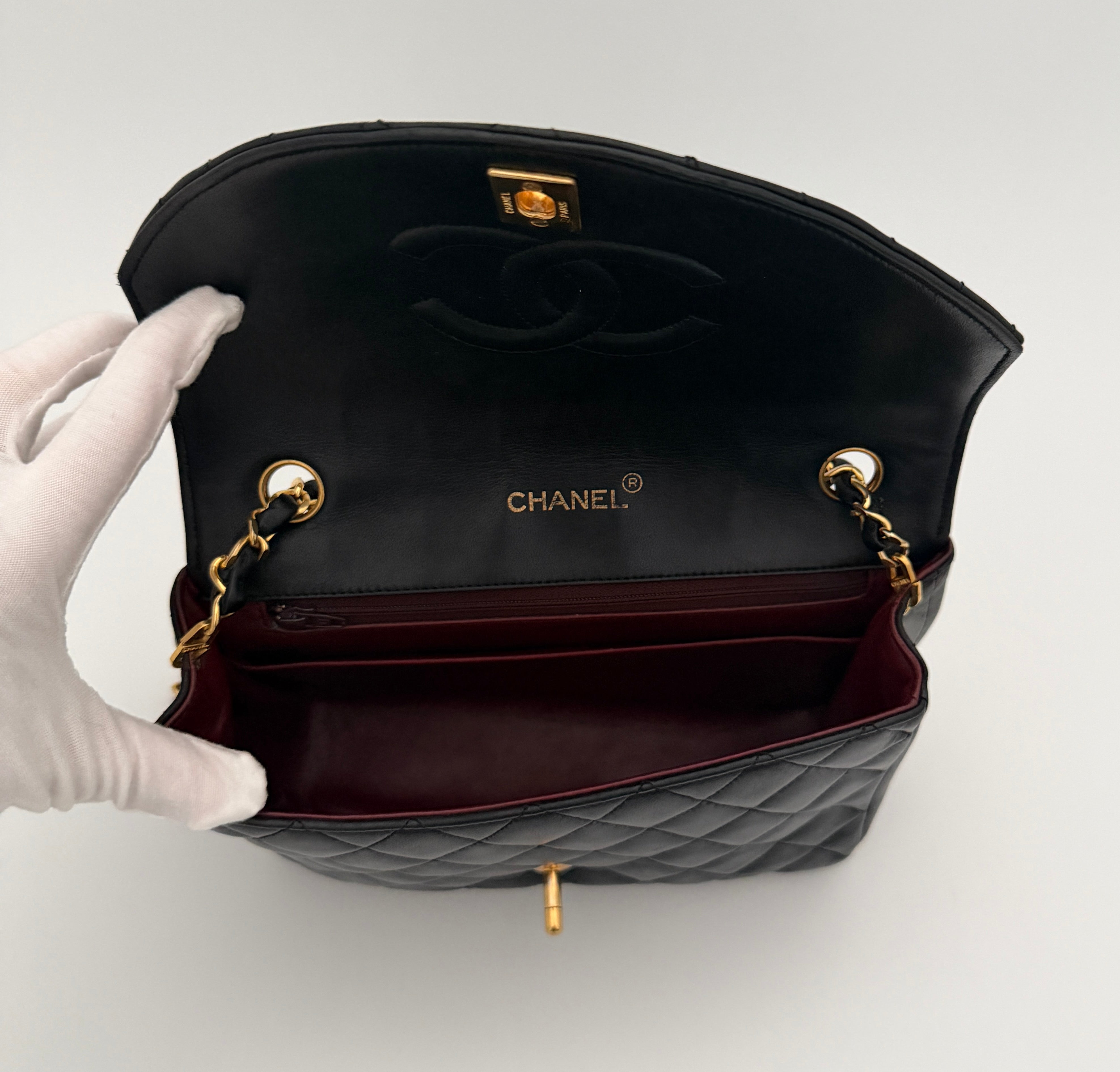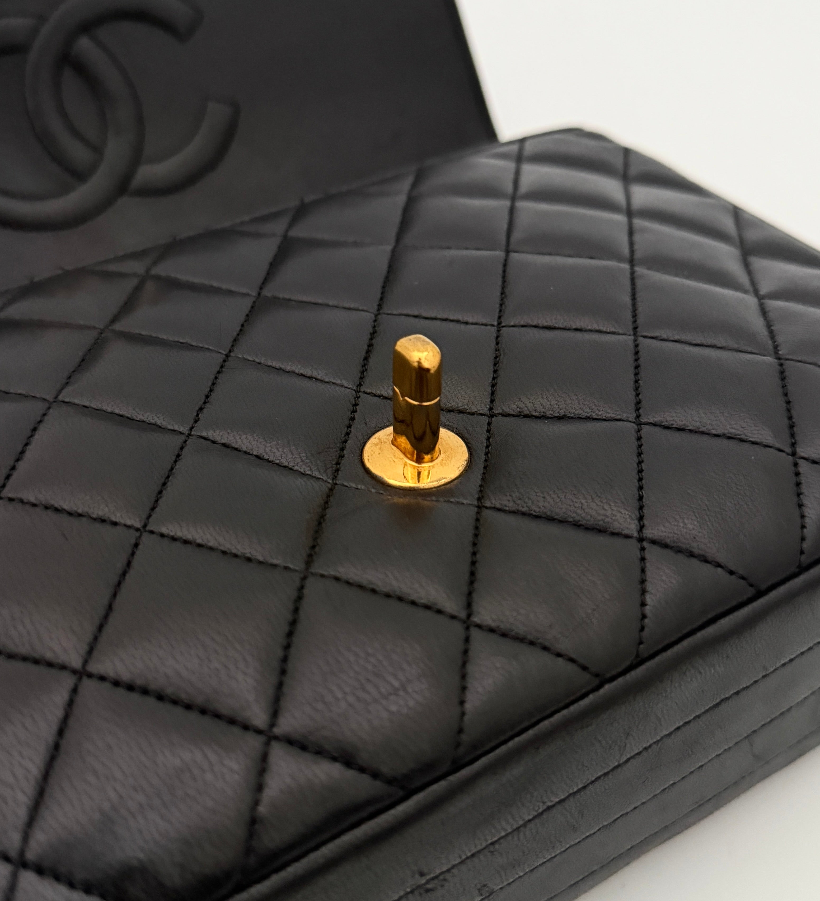 Bolso Chanel en cuero negro con detalles metálicos en dorado.
