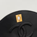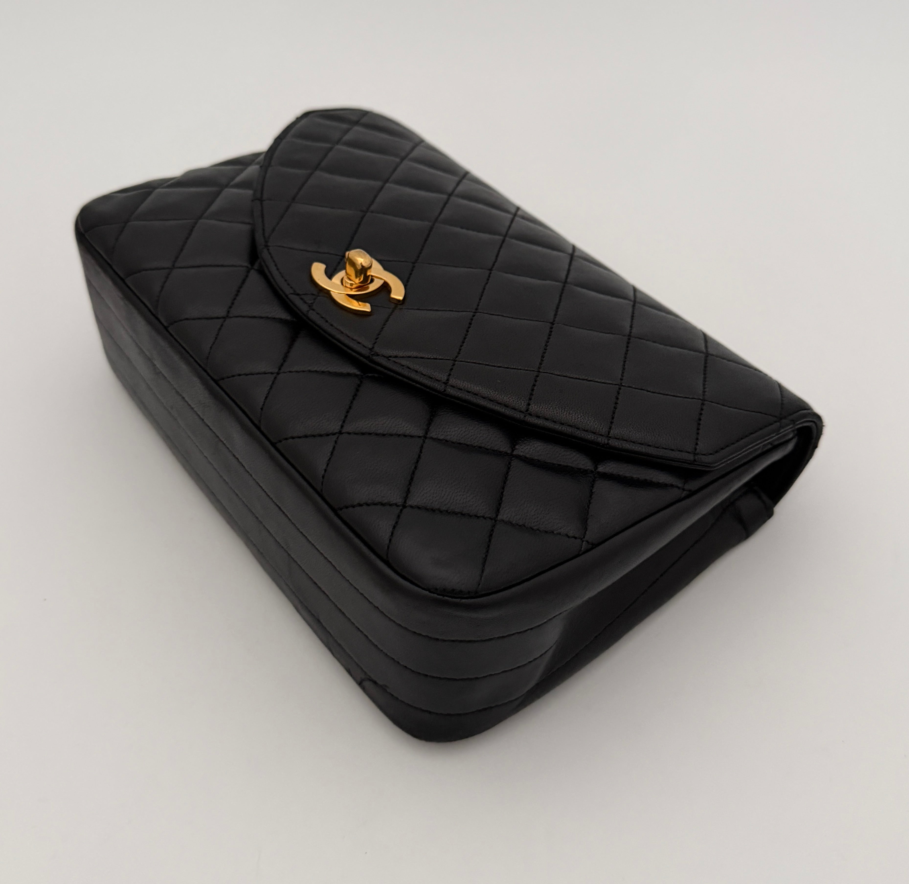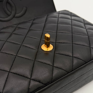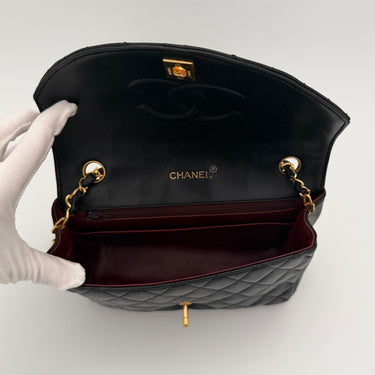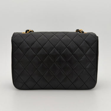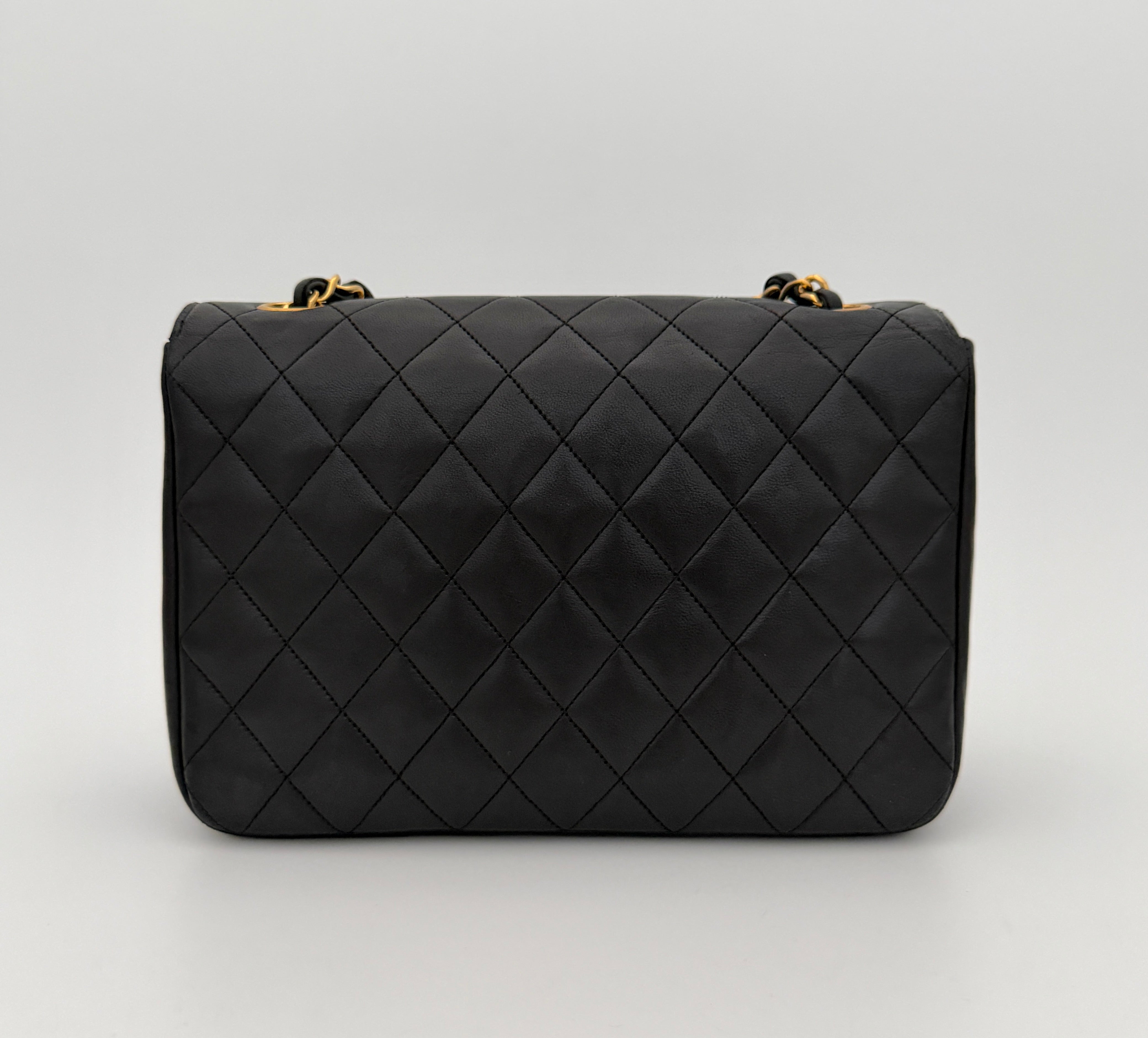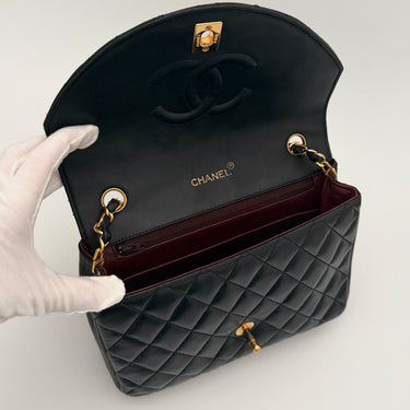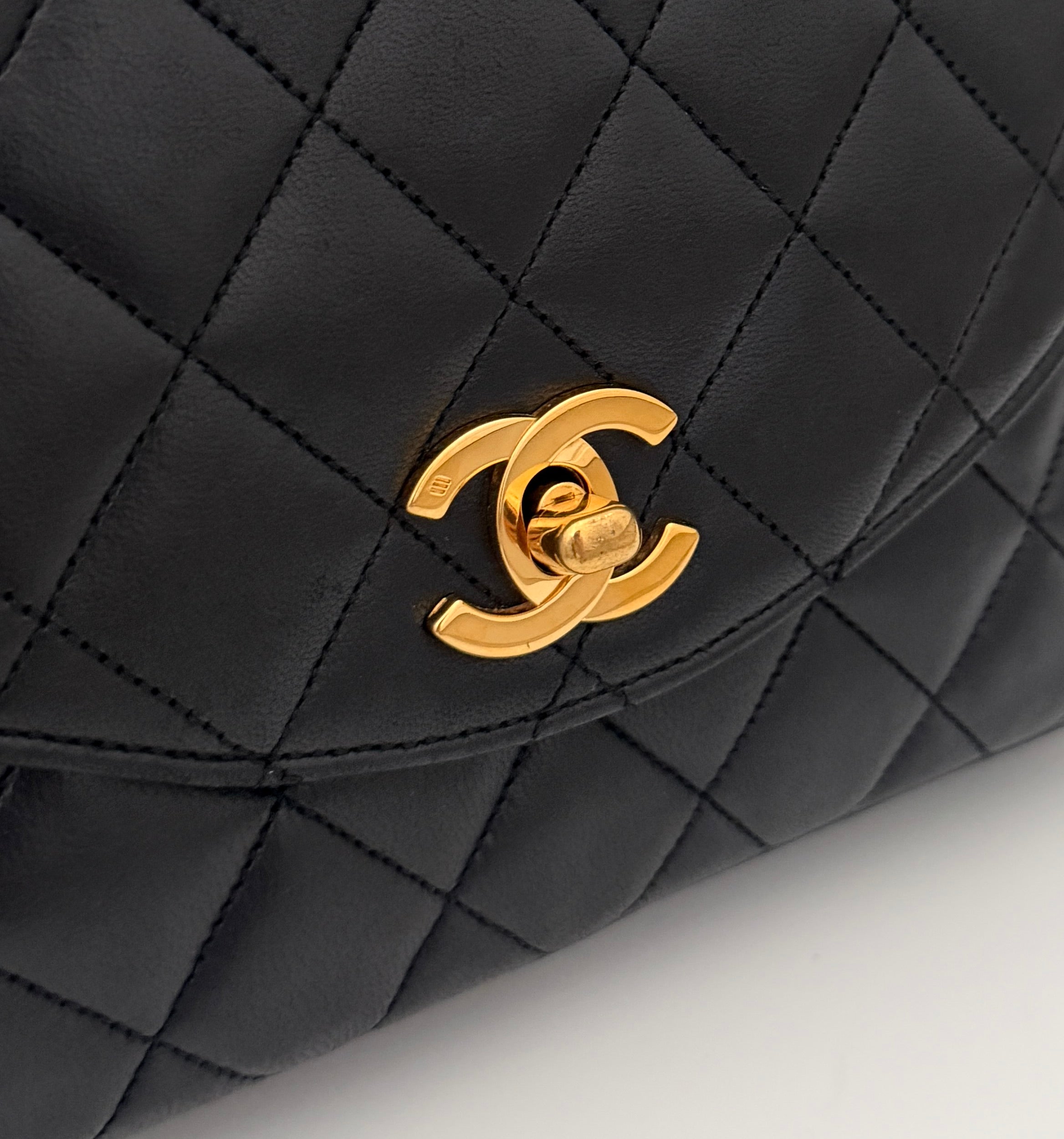 Bolso Chanel en cuero negro con detalles metálicos en dorado.