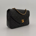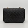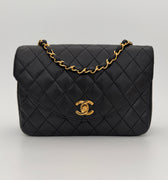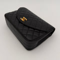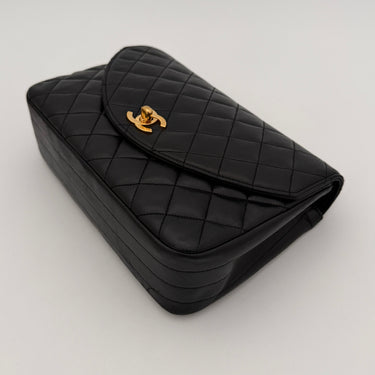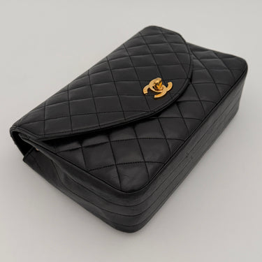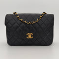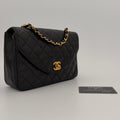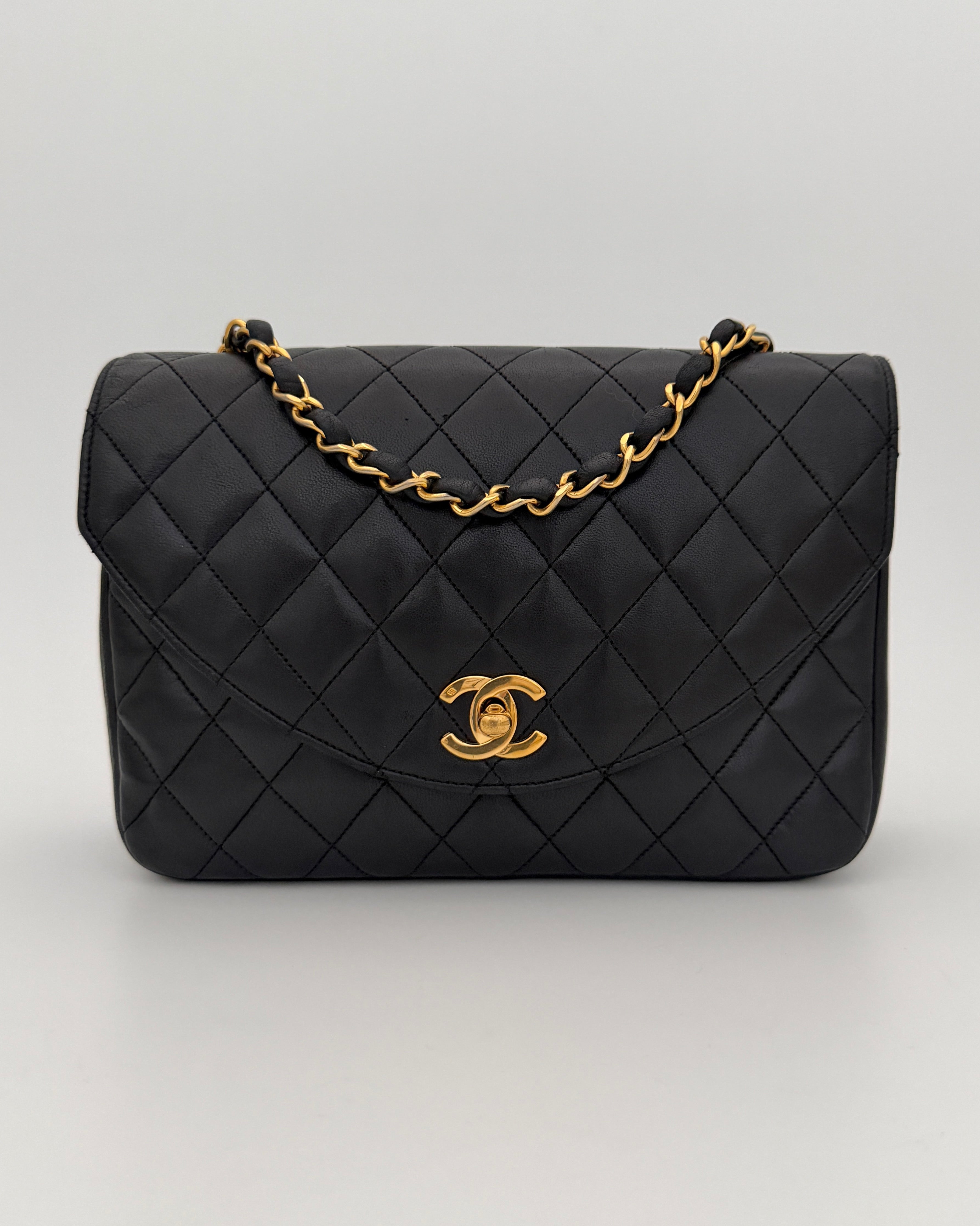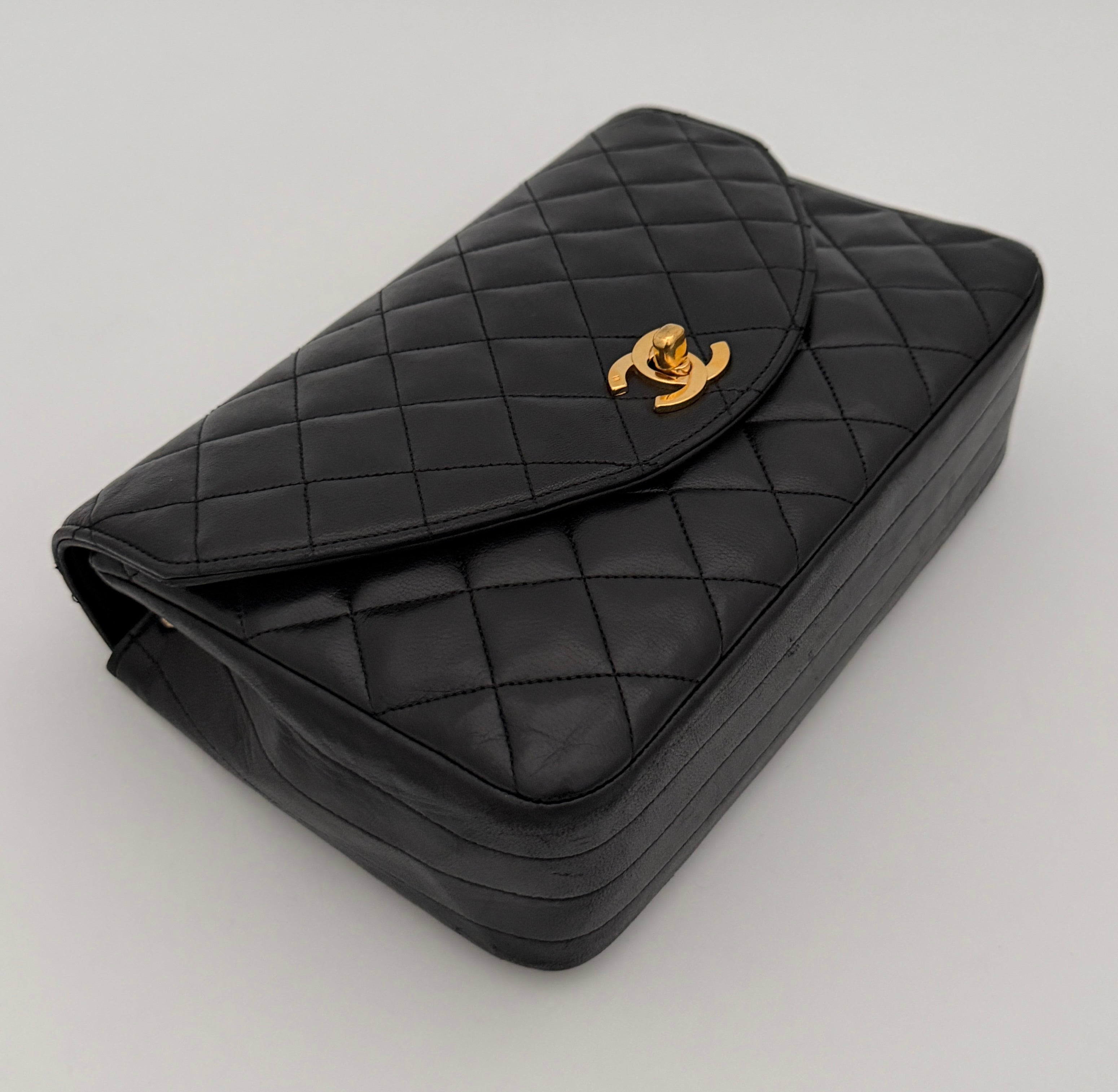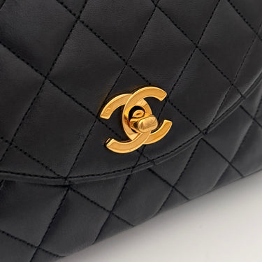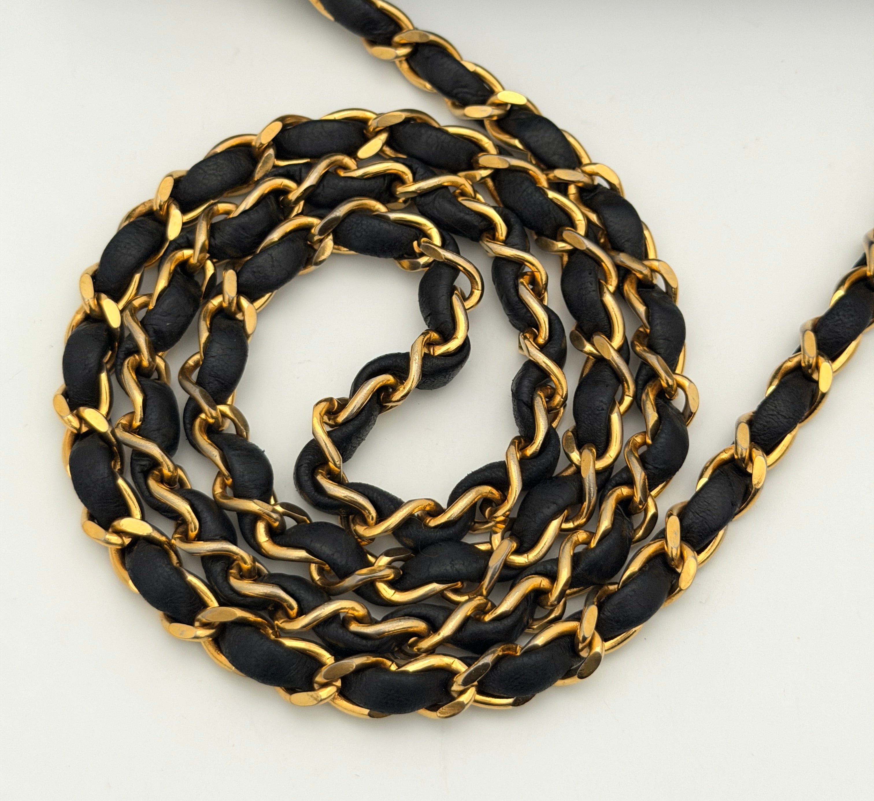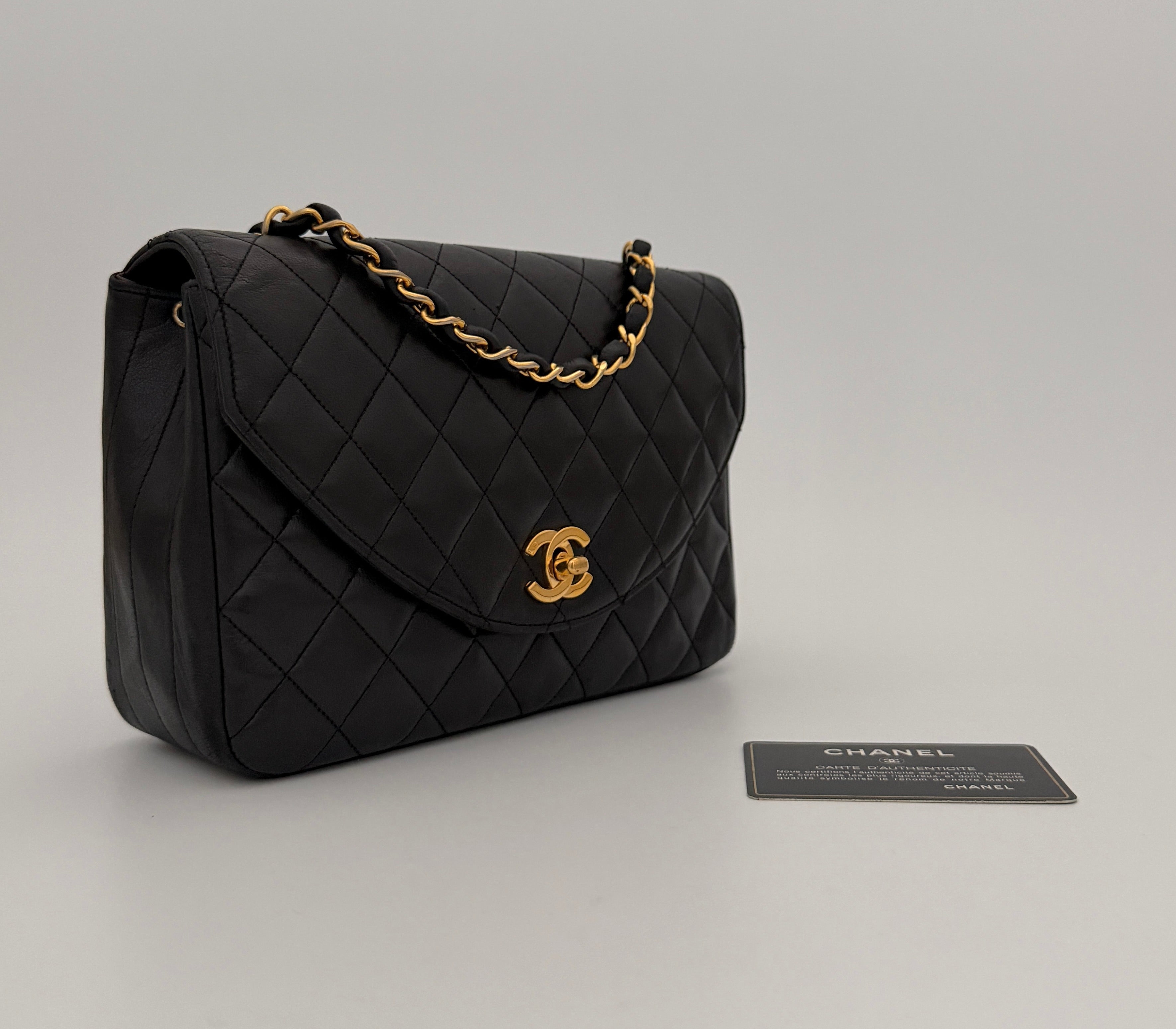 Bolso Chanel en cuero negro con detalles metálicos en dorado.