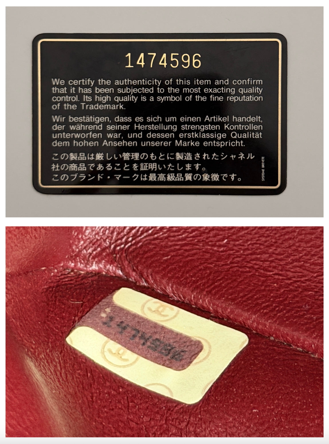 Includes: Serial number sticker inside, authentication card, dust bag and coin purse.