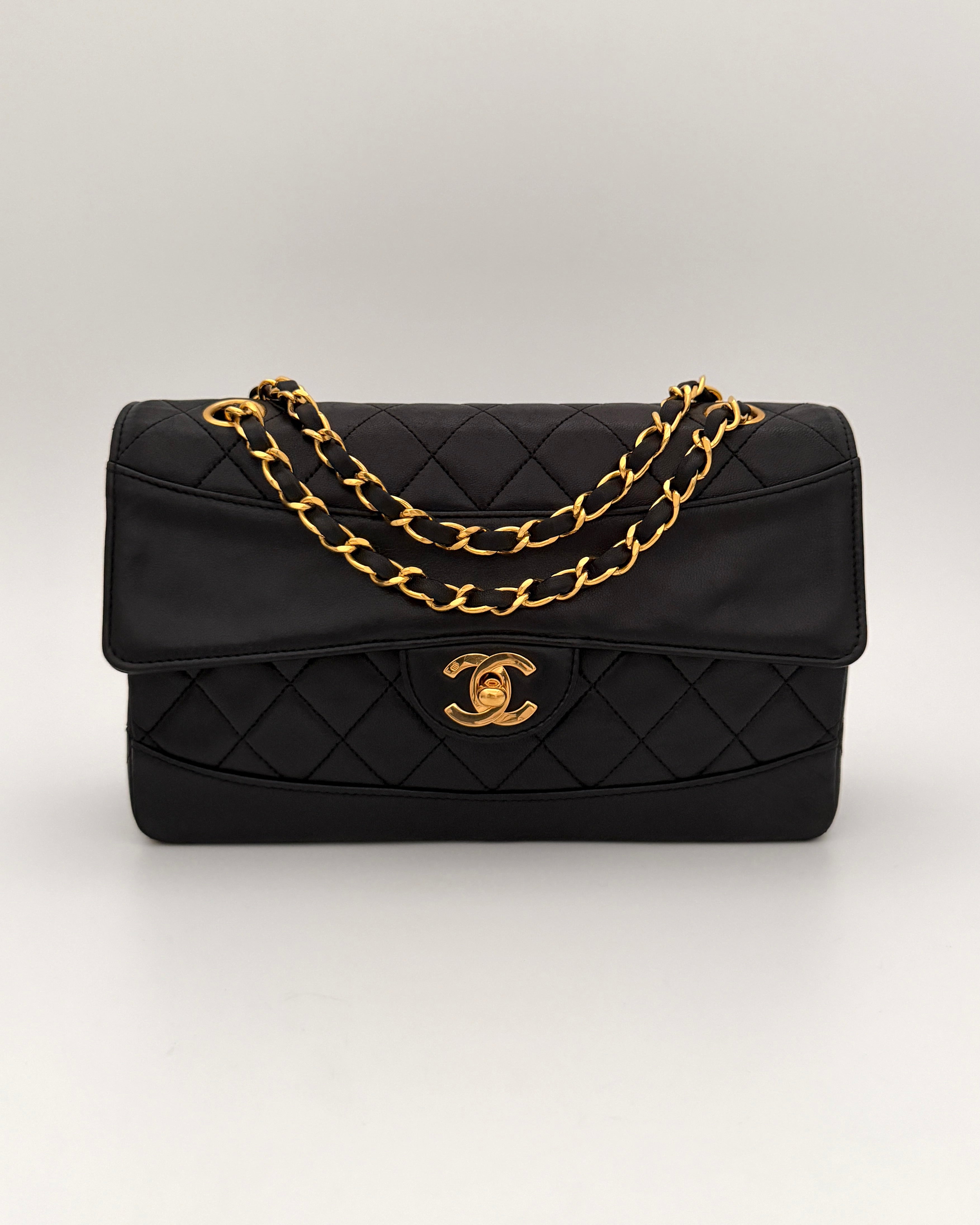 Chanel bag with coin purse in black leather with gold-tone metal details.