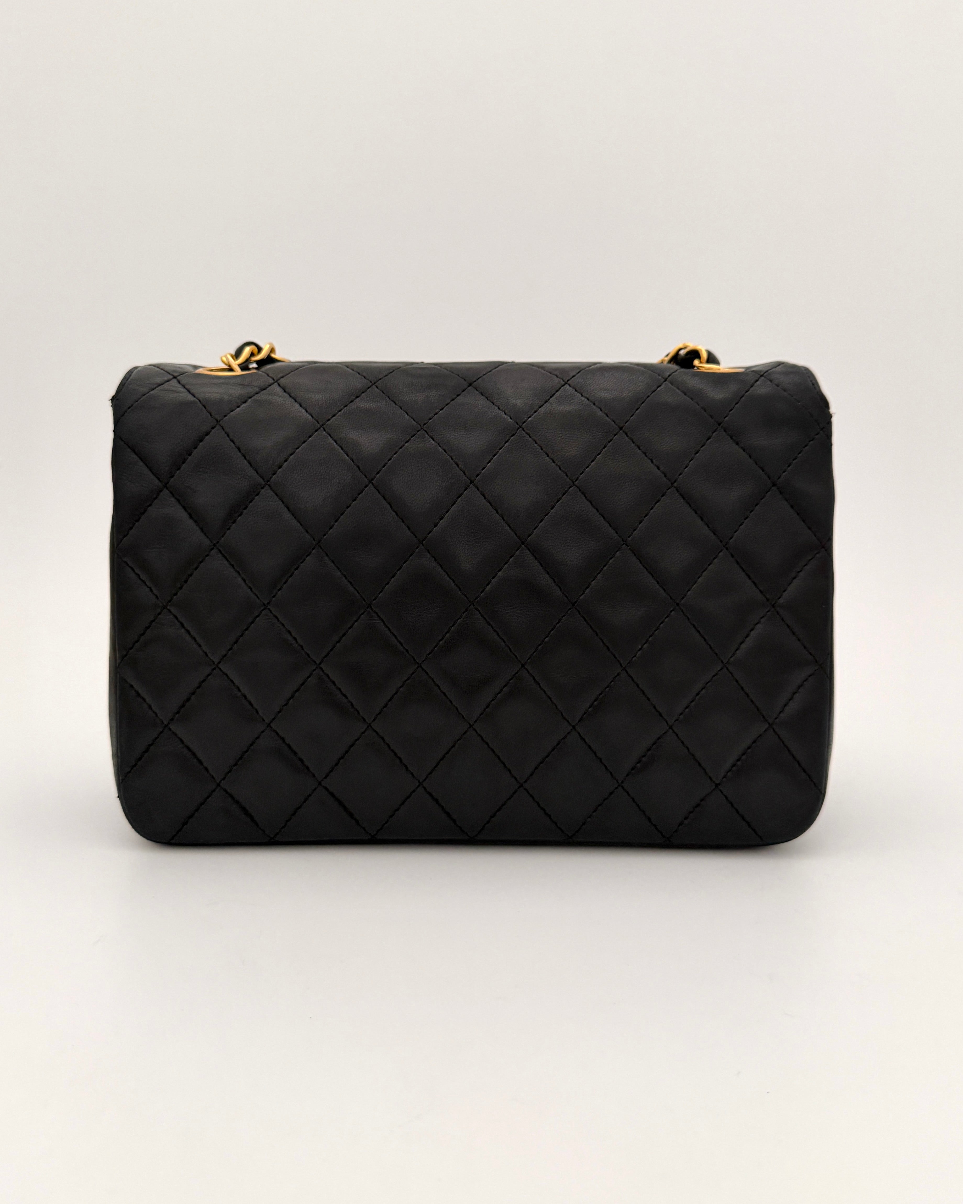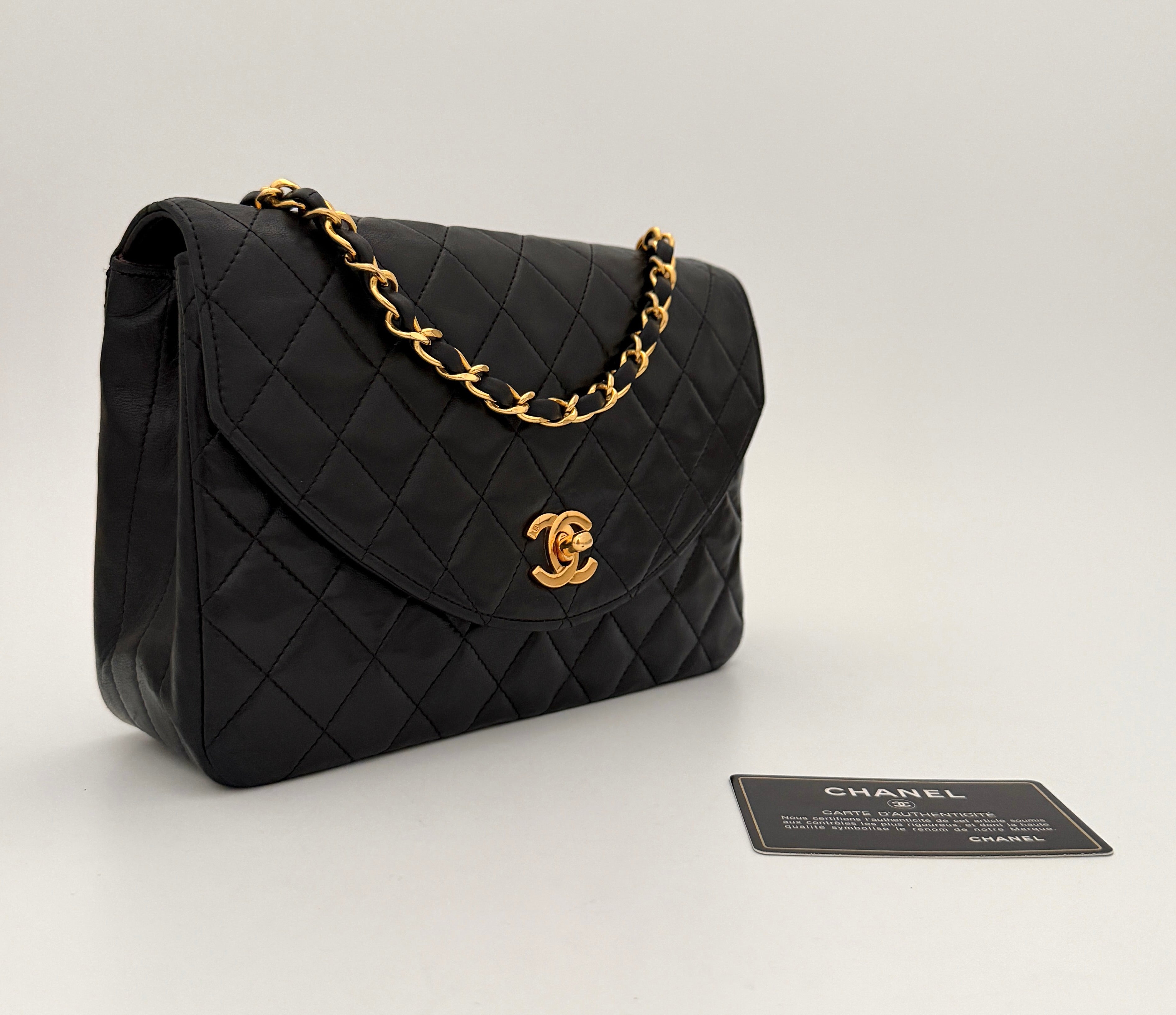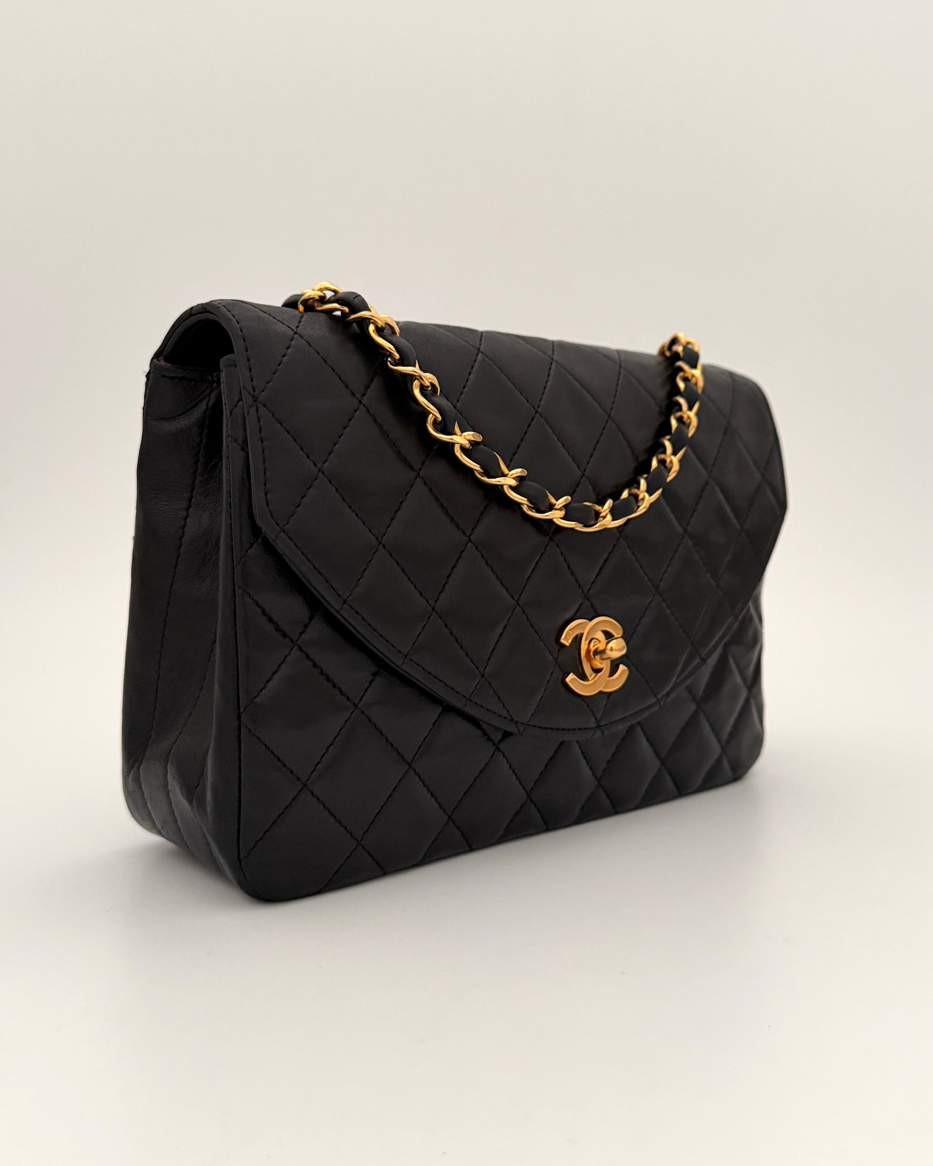 Chanel bag in black leather with gold-tone metal details.