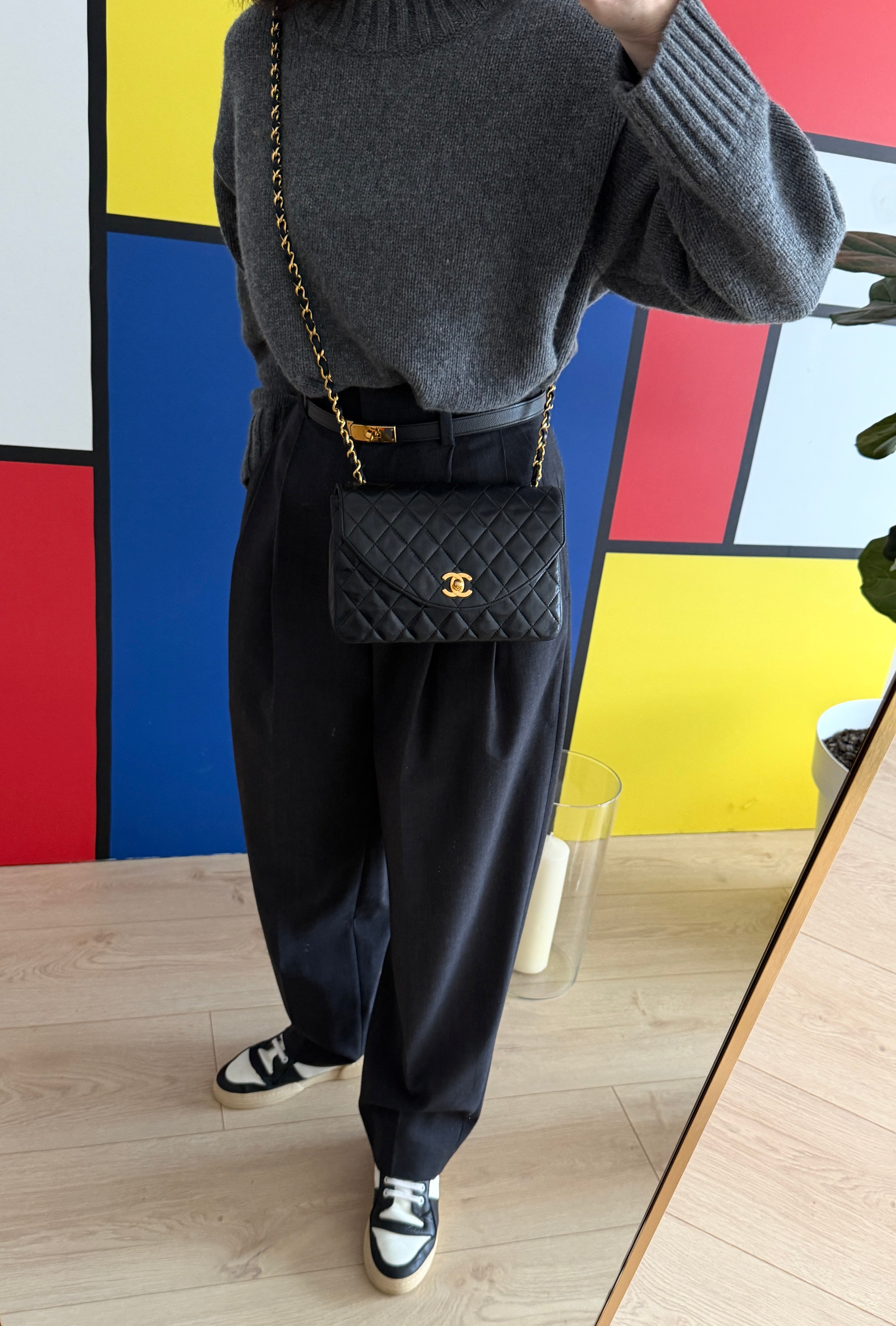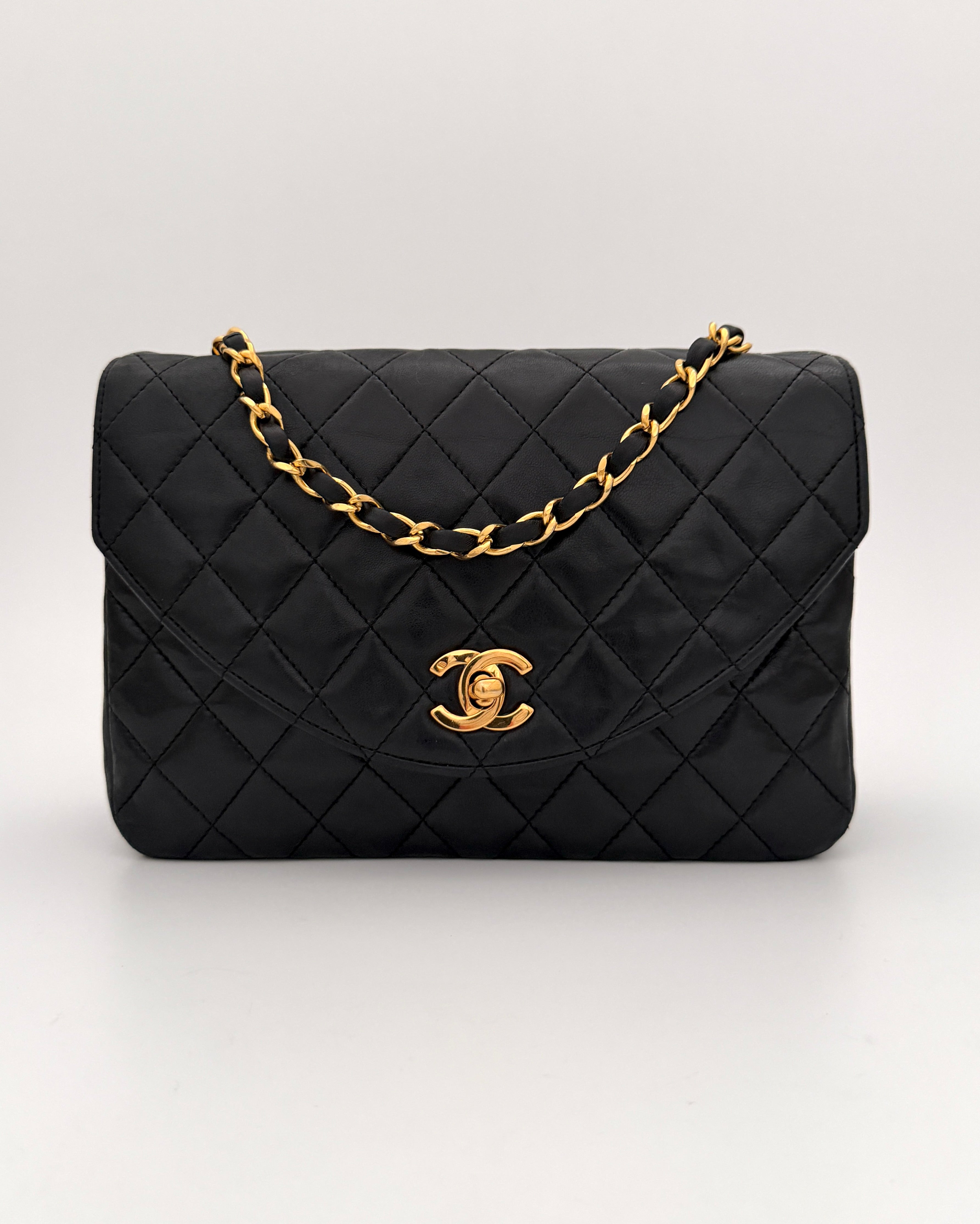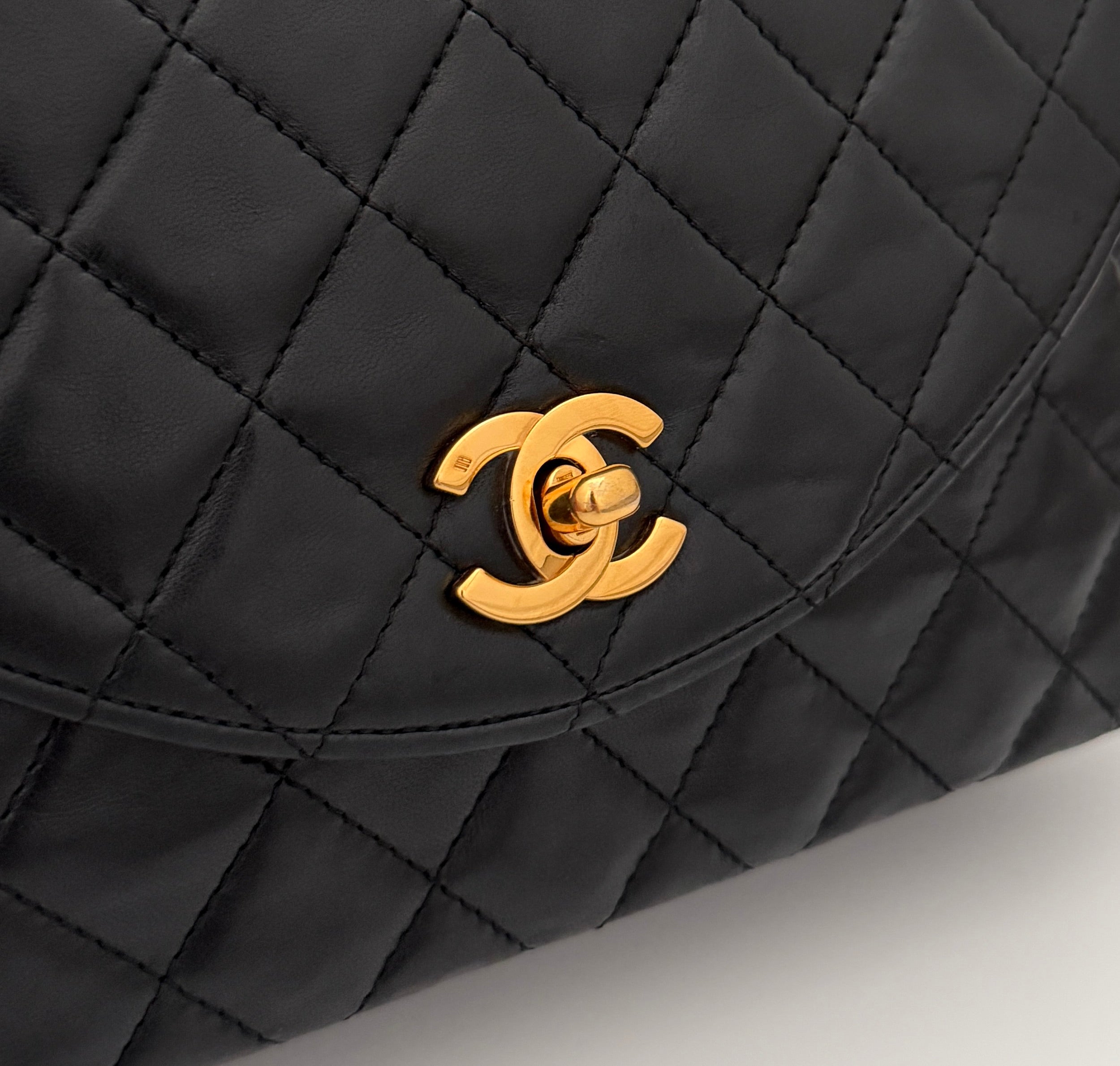 Chanel bag in black leather with gold-tone metal details.