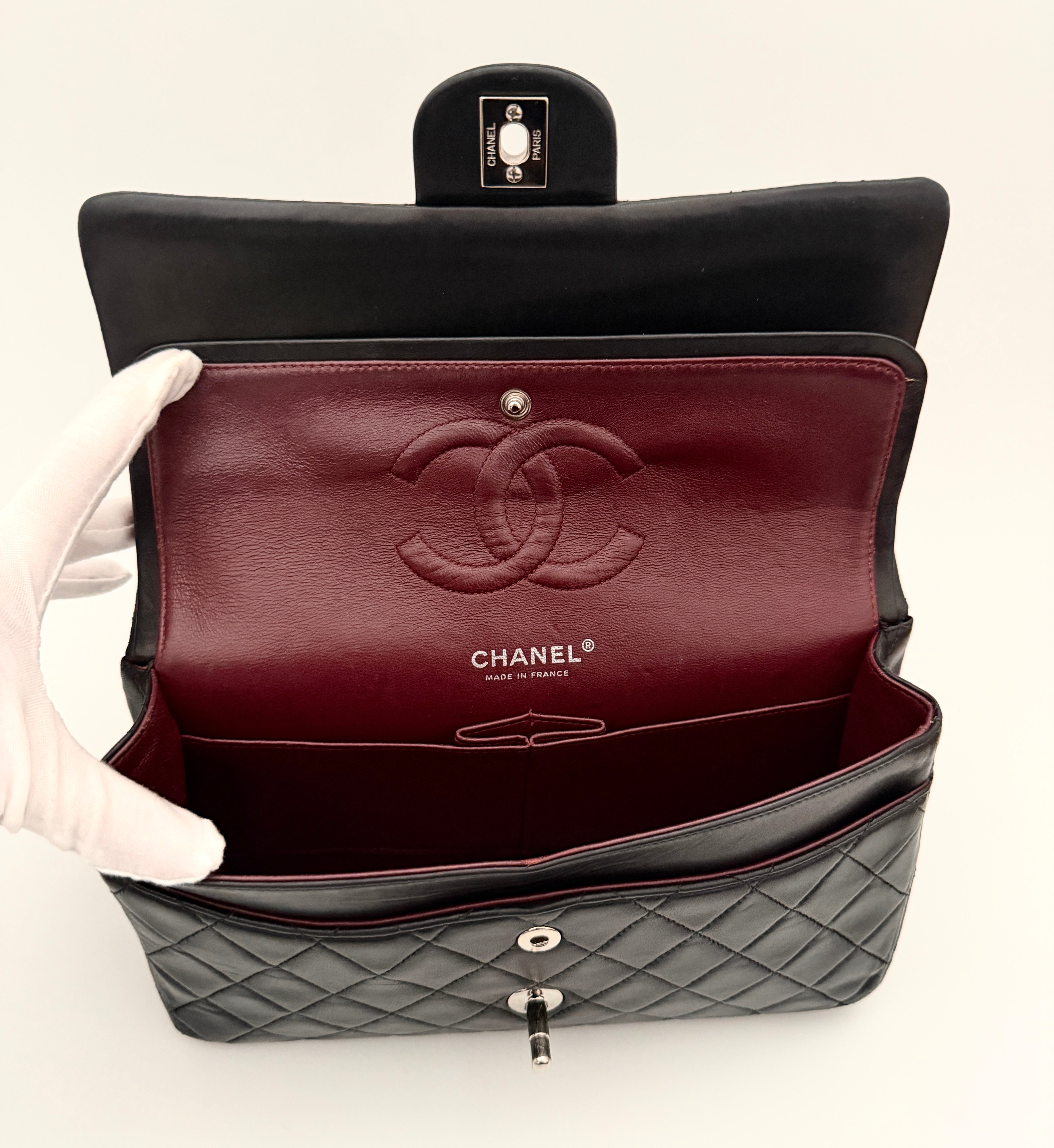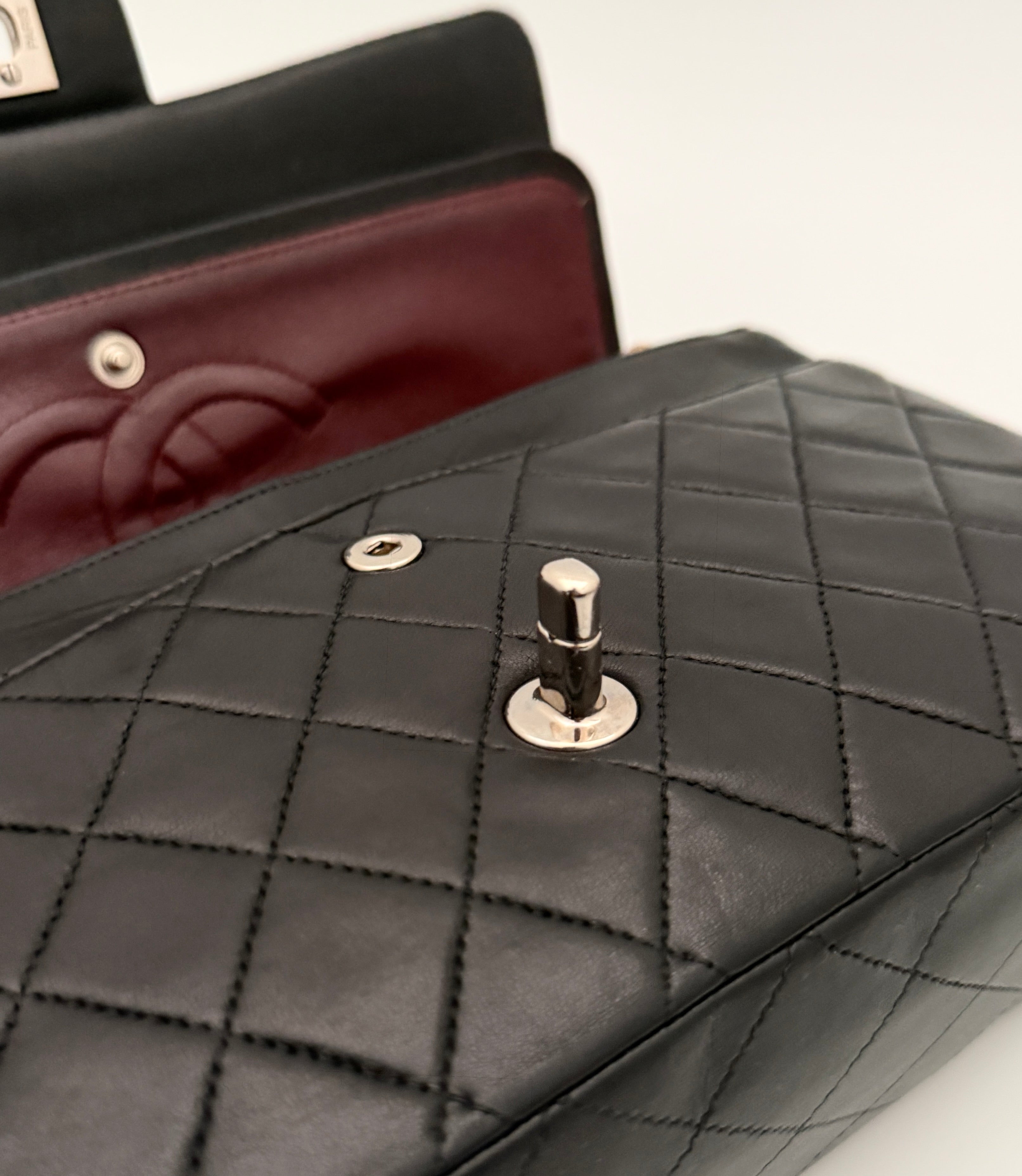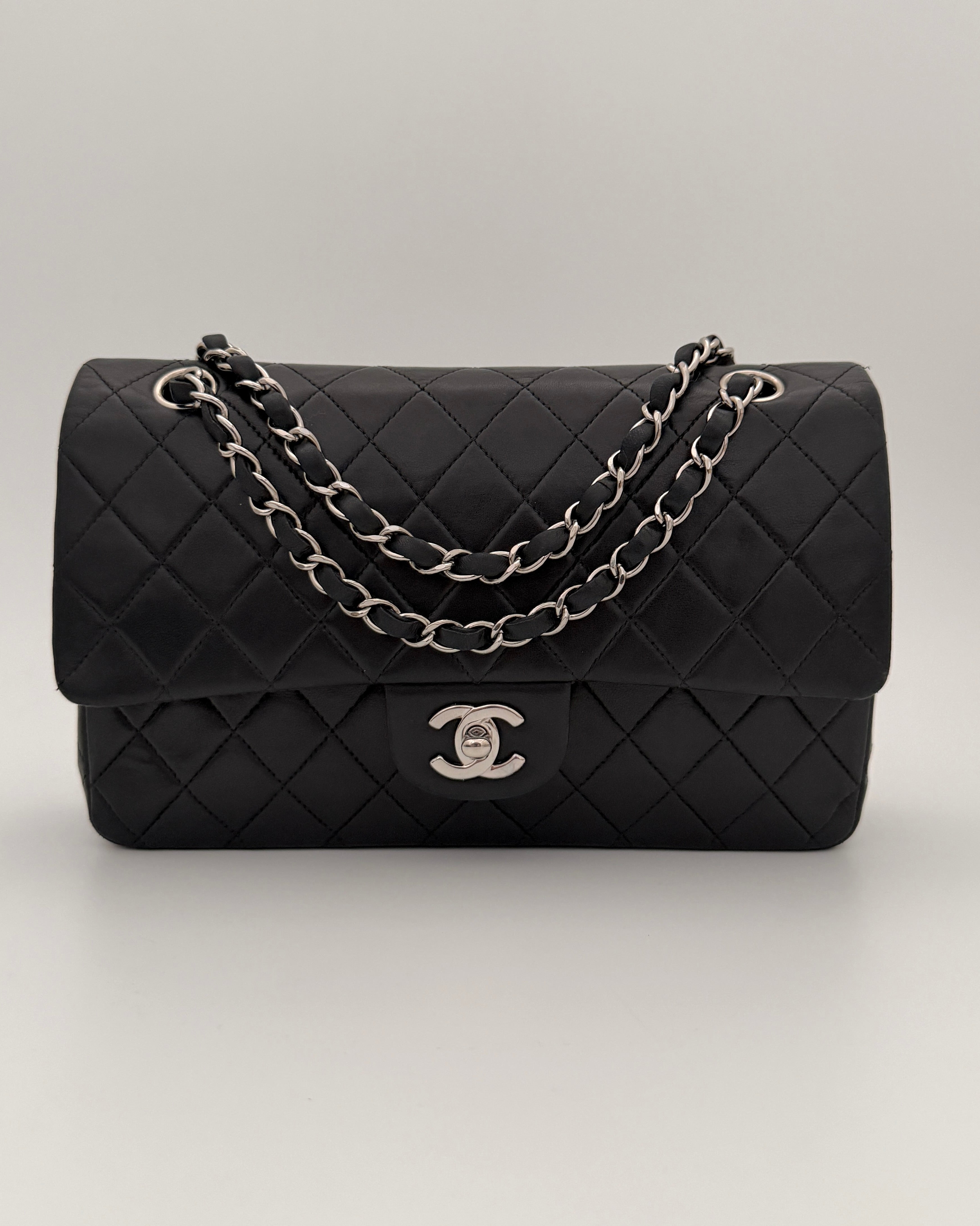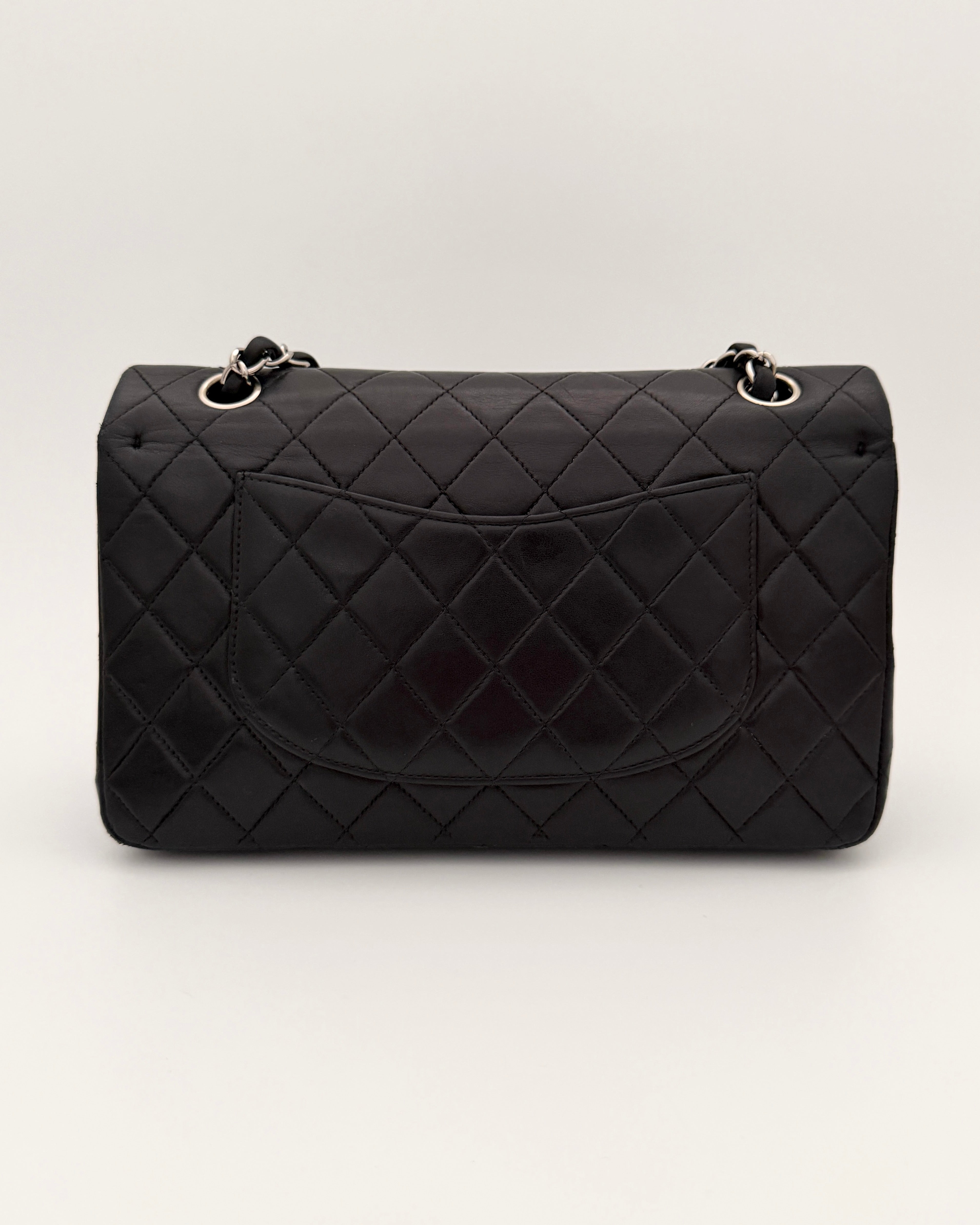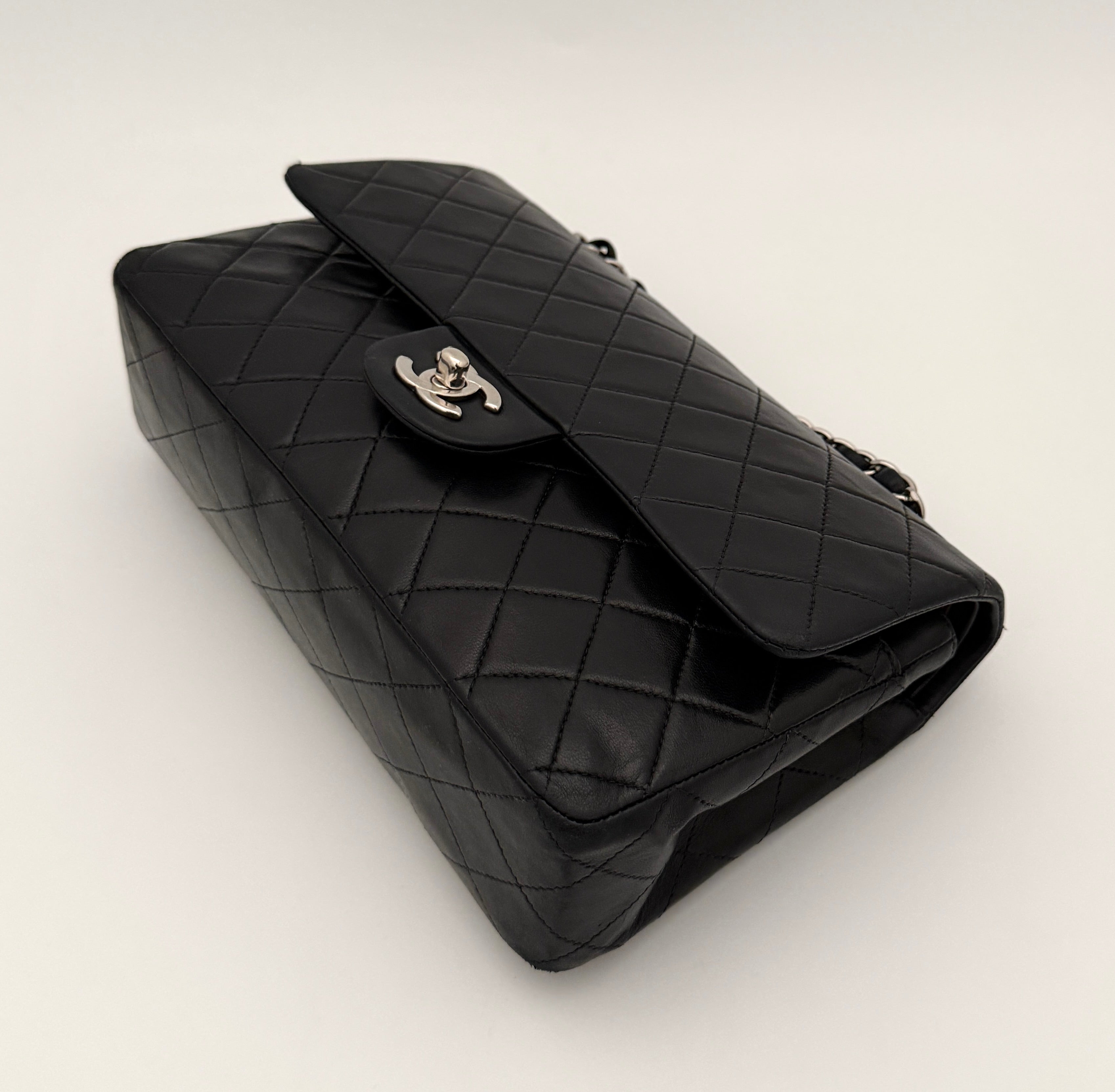 Chanel Timeless 25 double flap bag in black leather with silver metallic details.