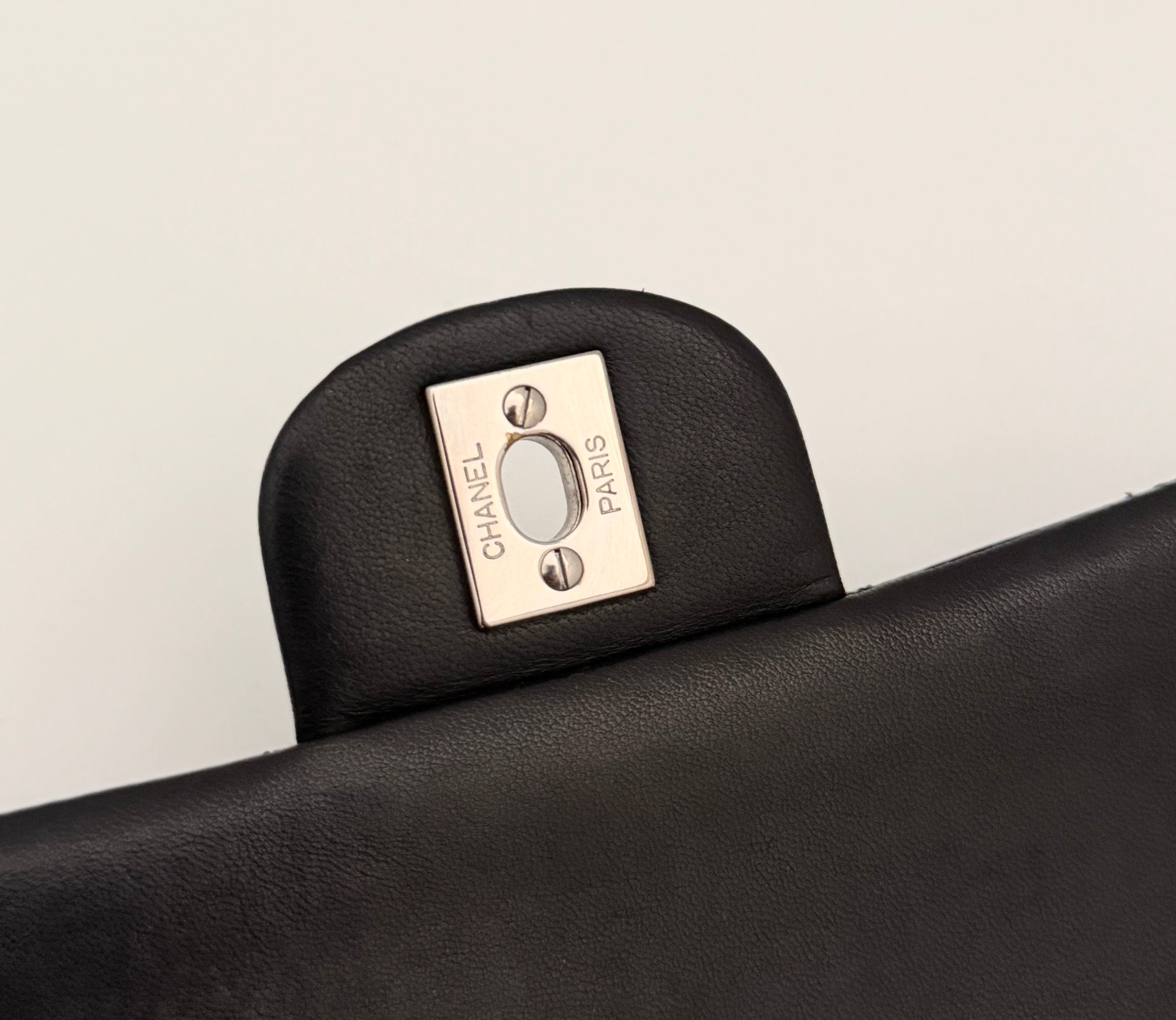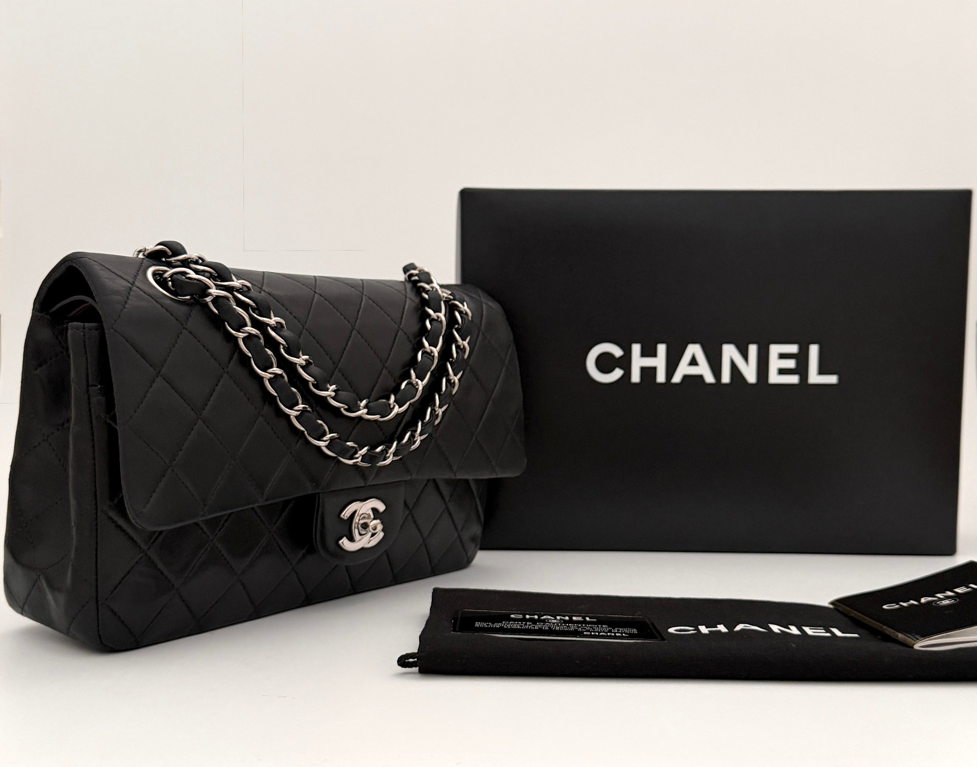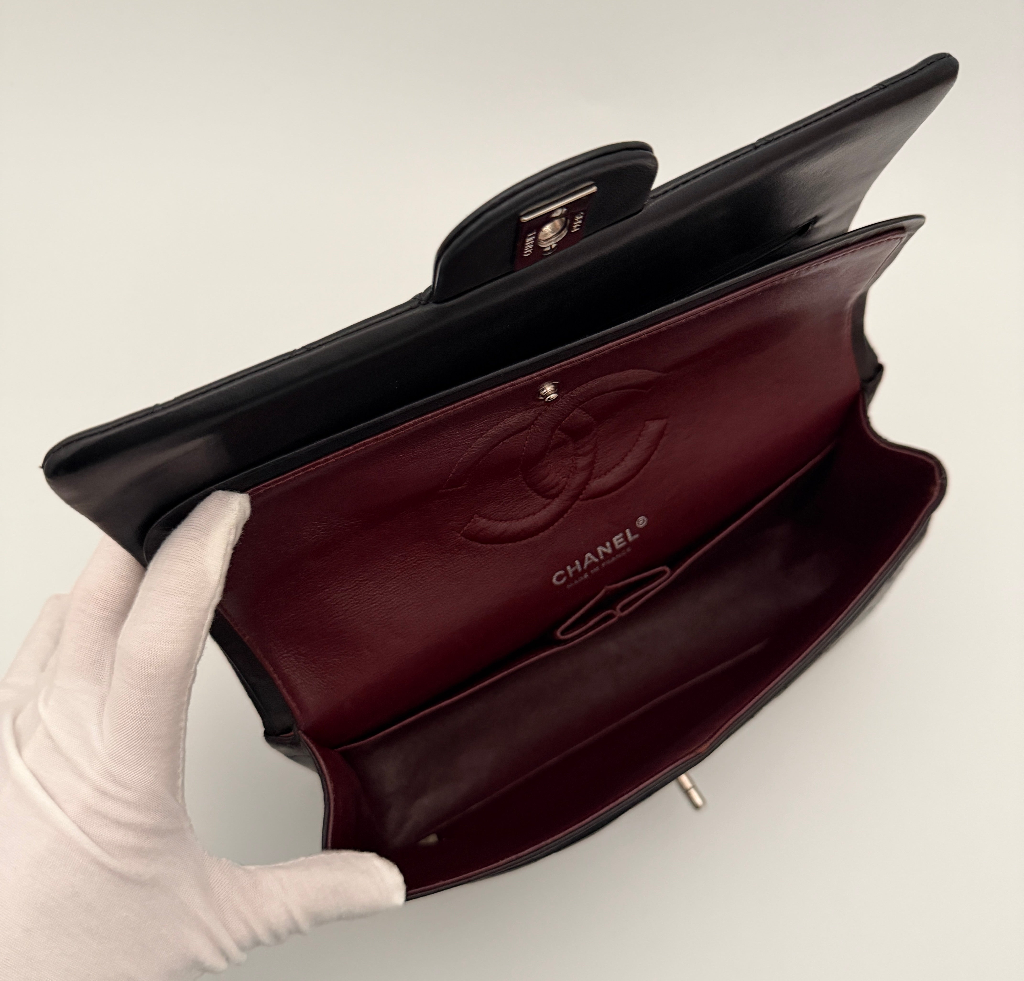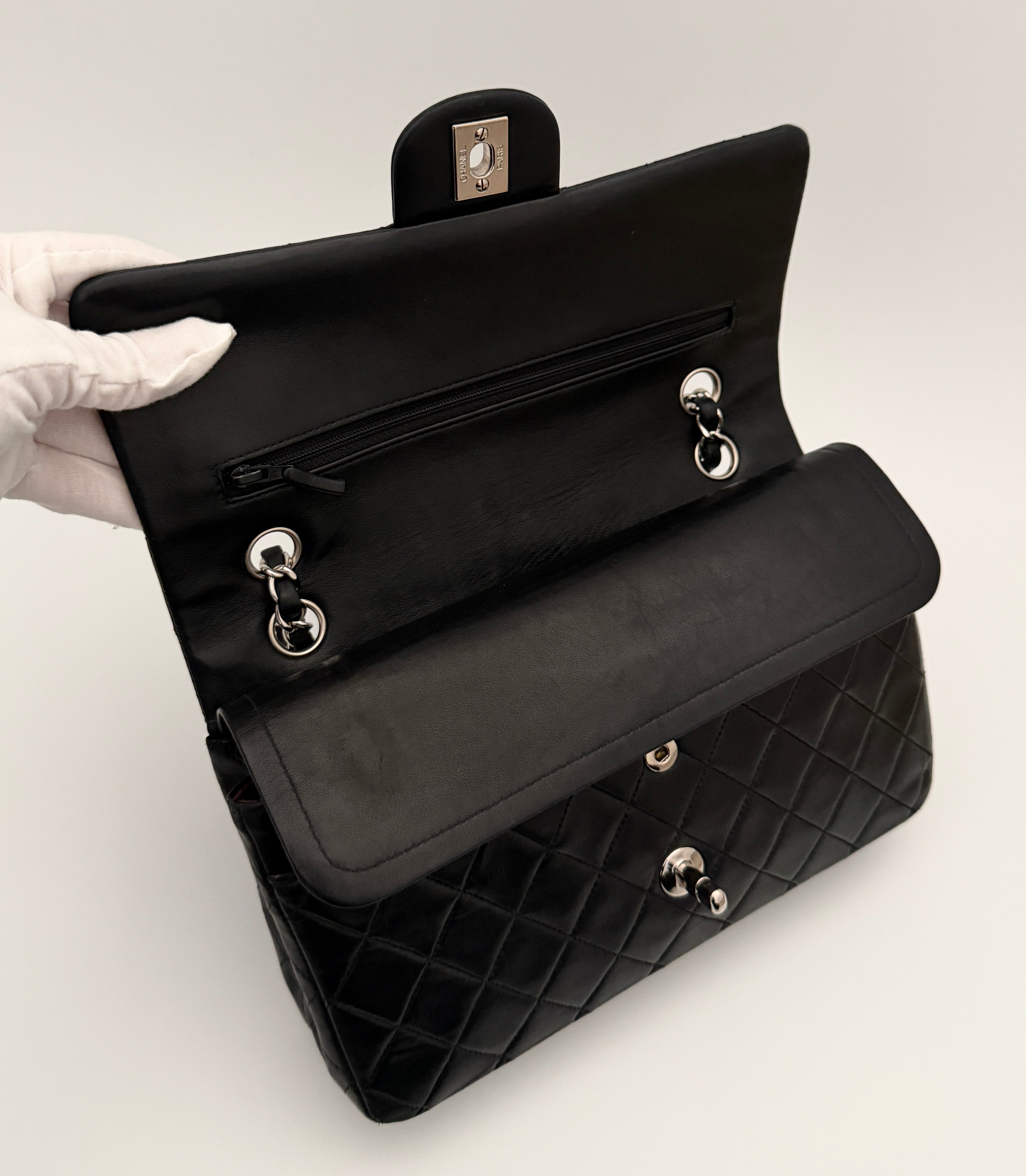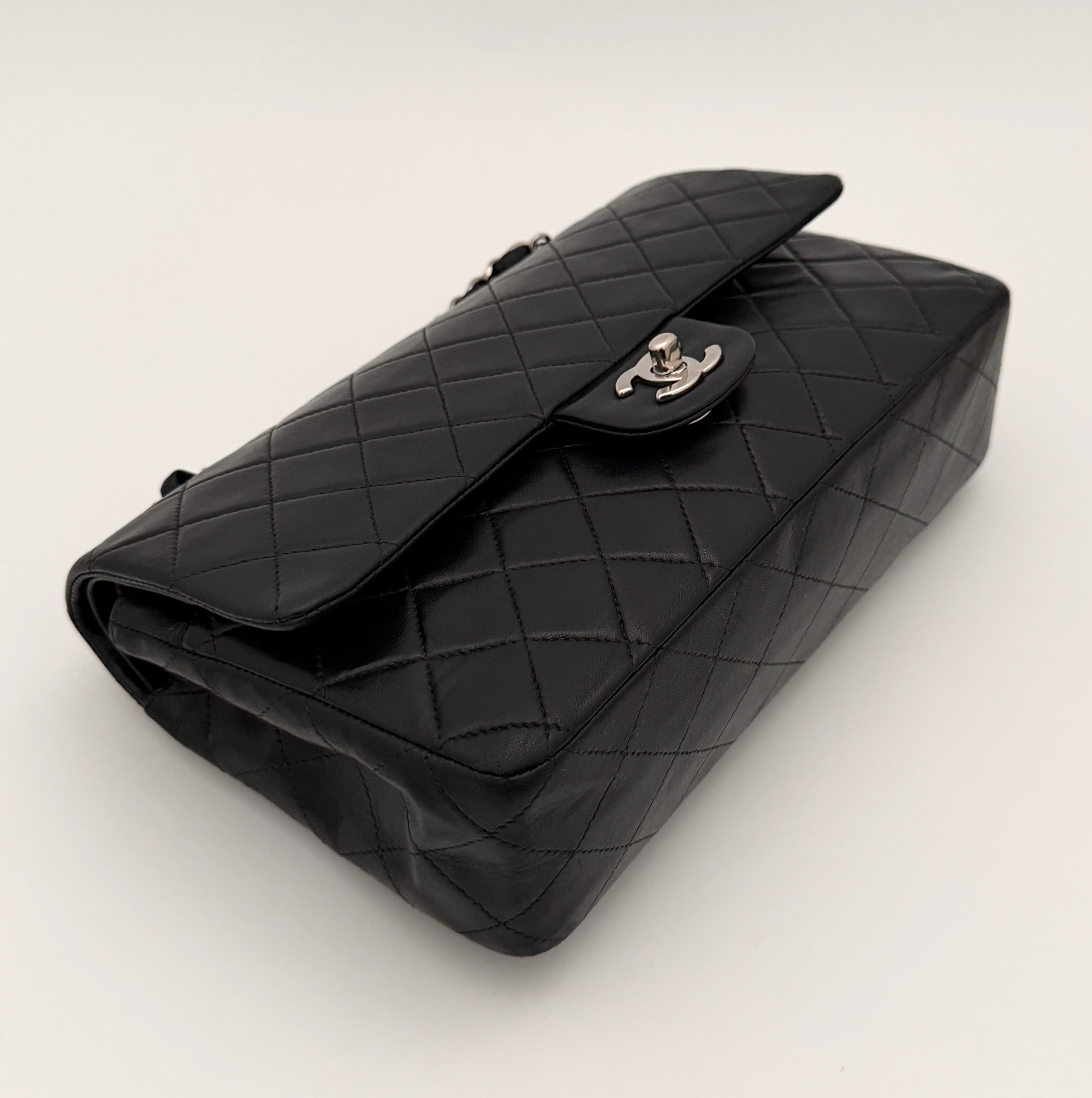 Chanel Timeless 25 double flap bag in black leather with silver metallic details.
