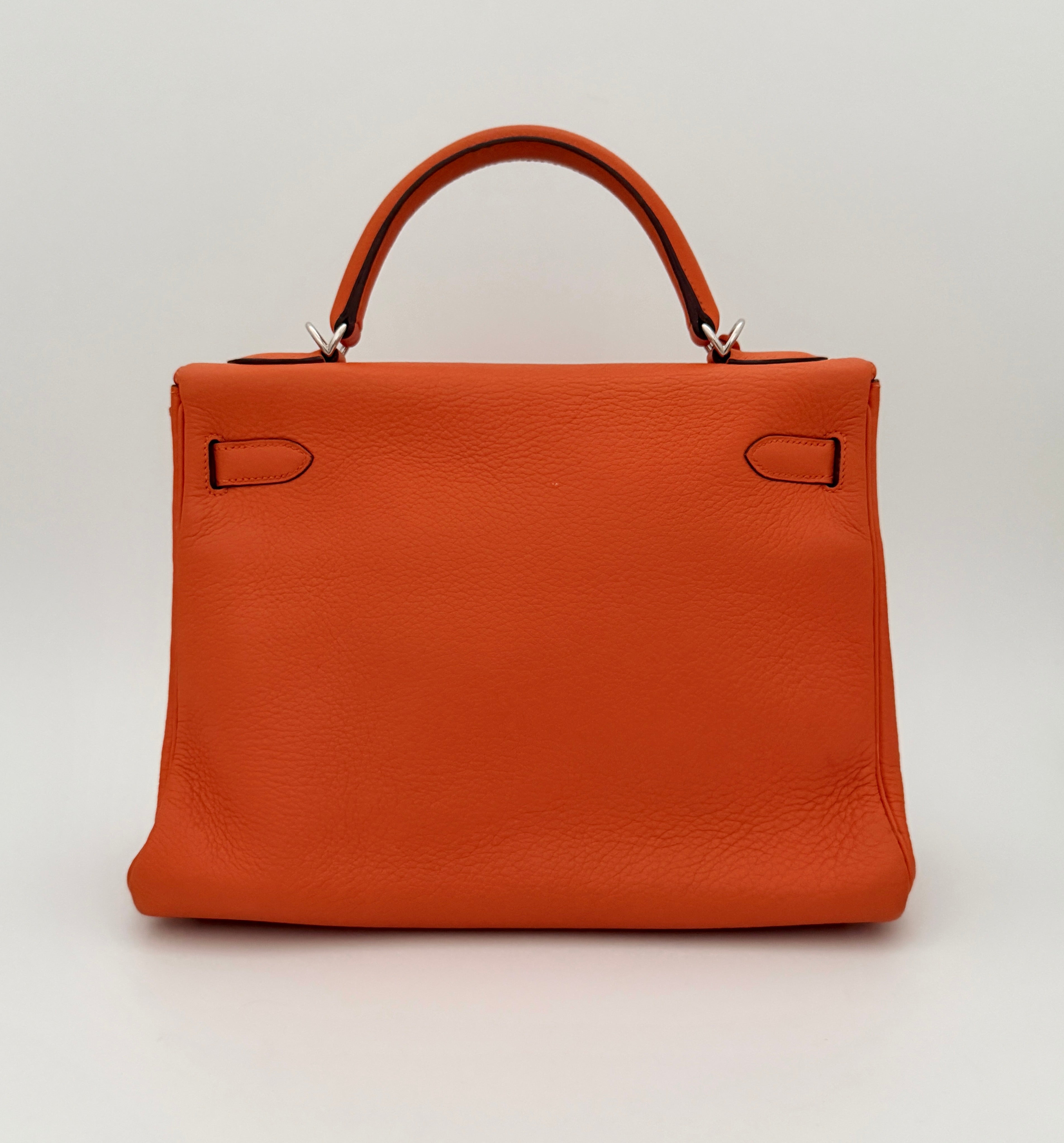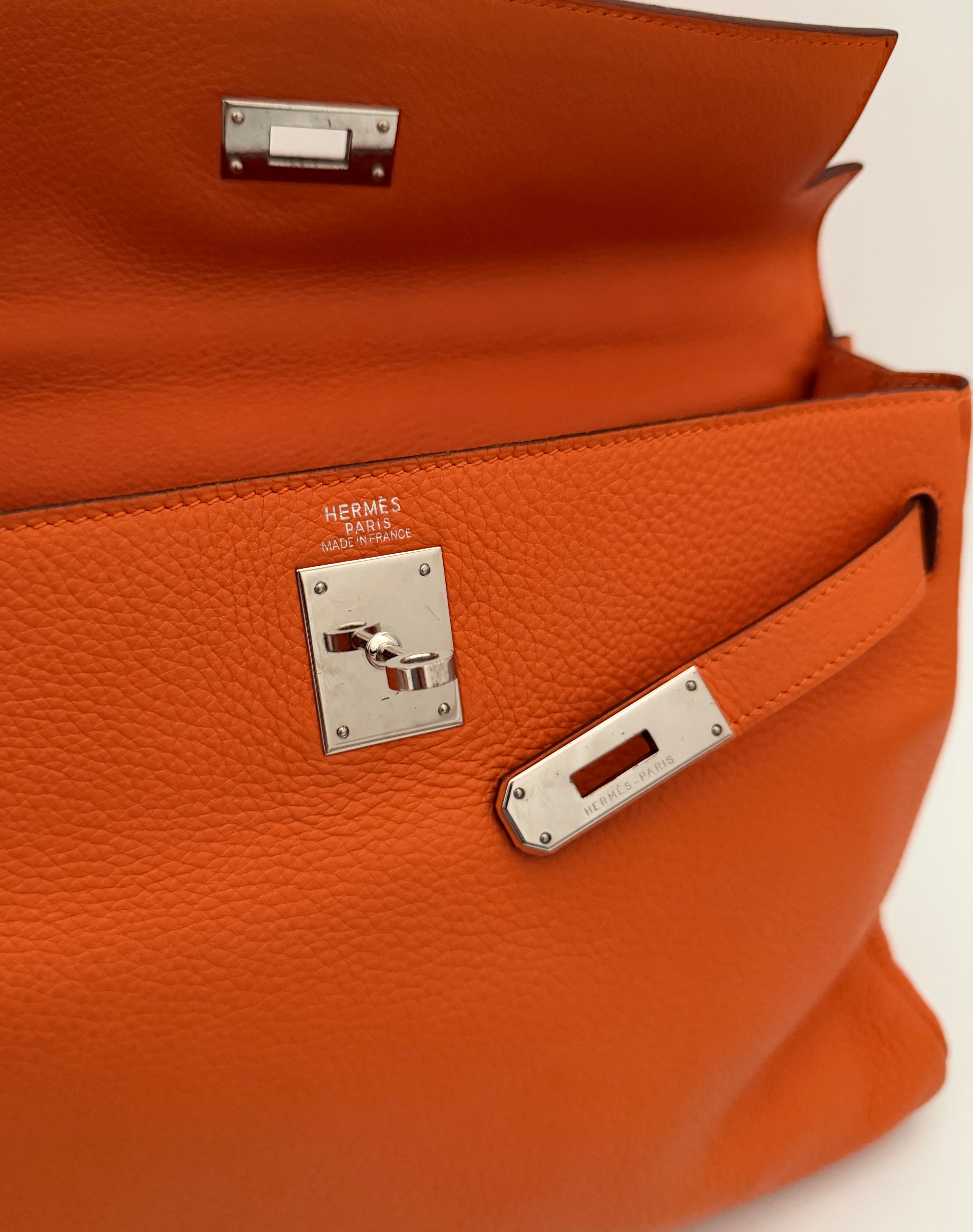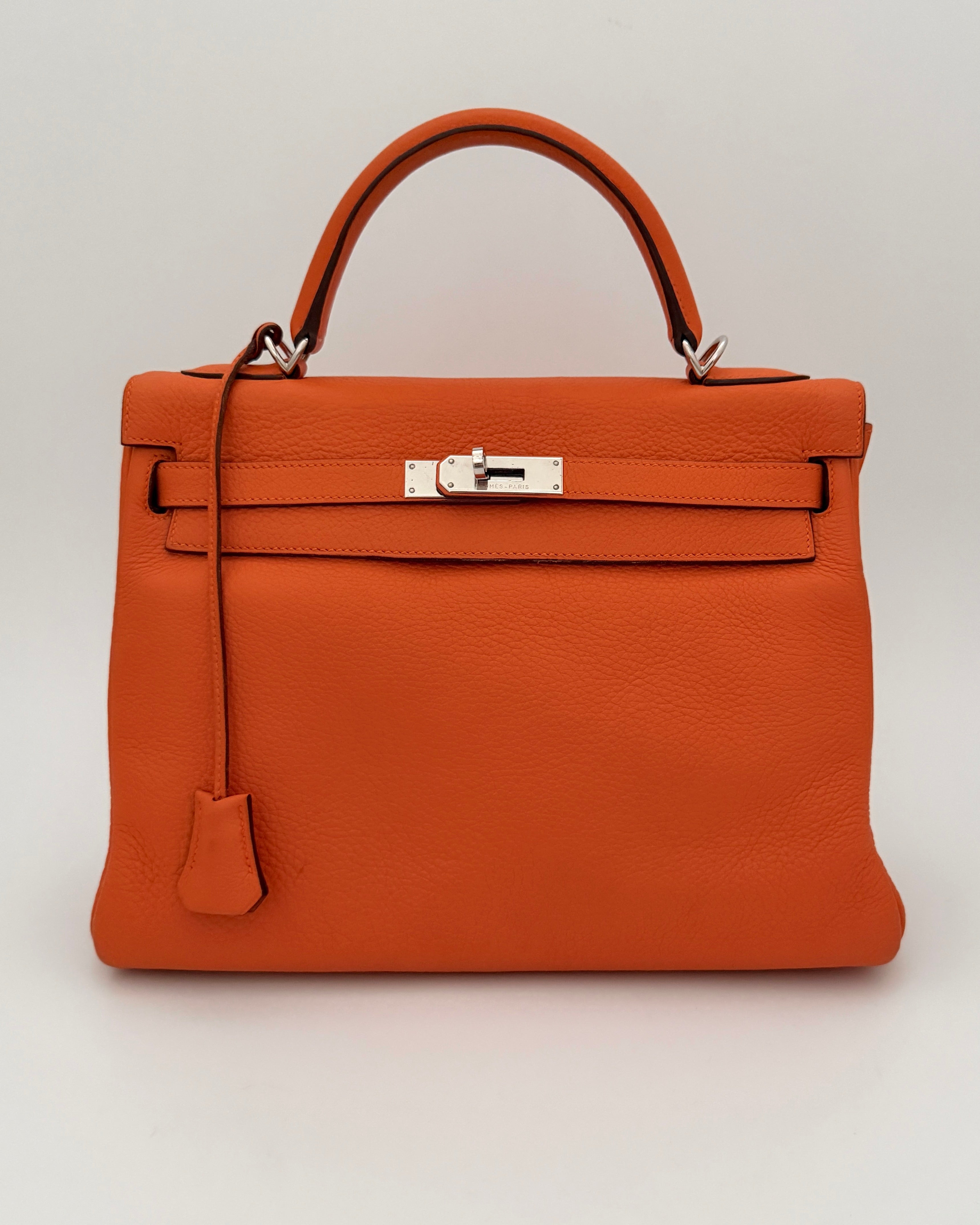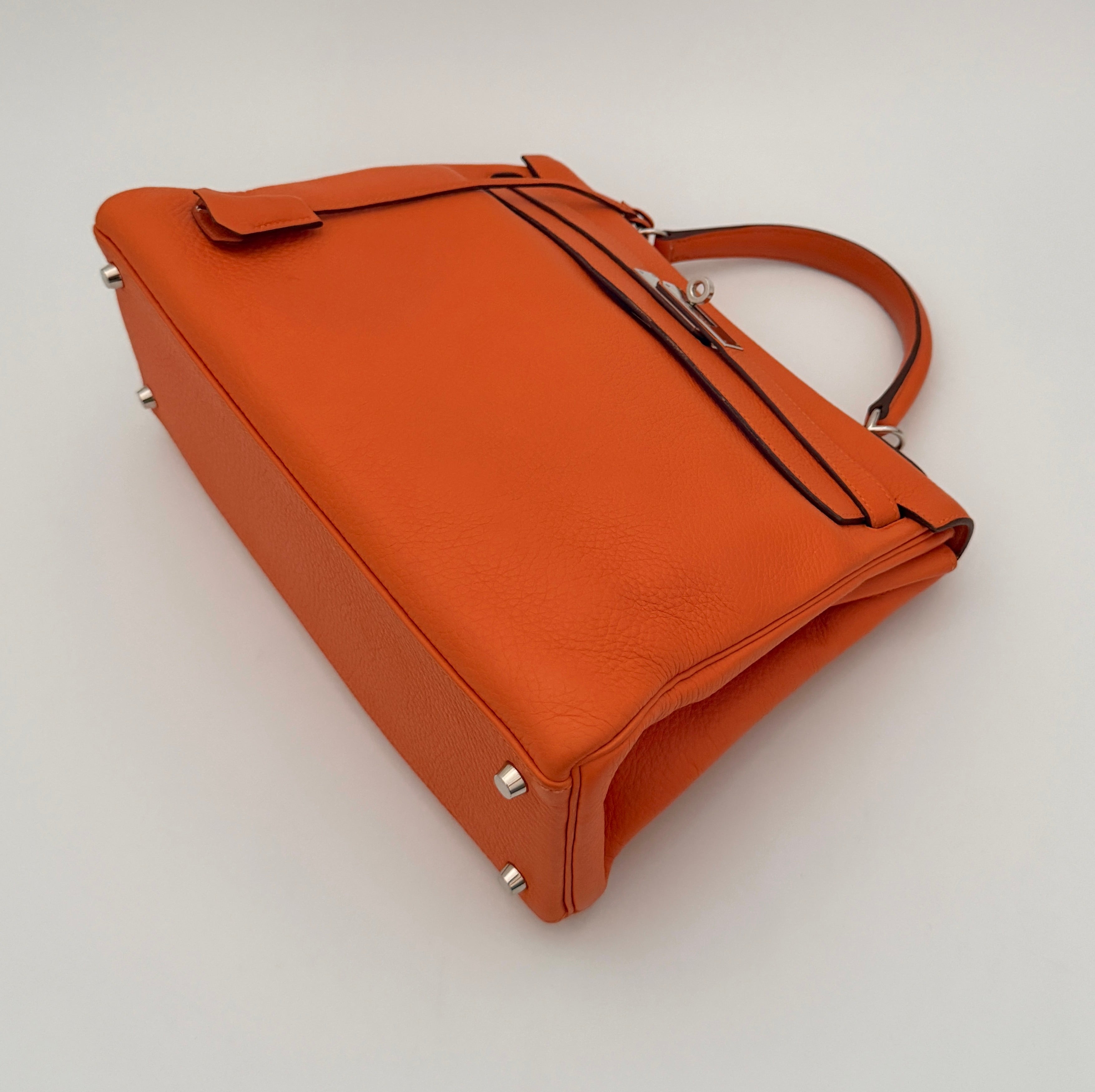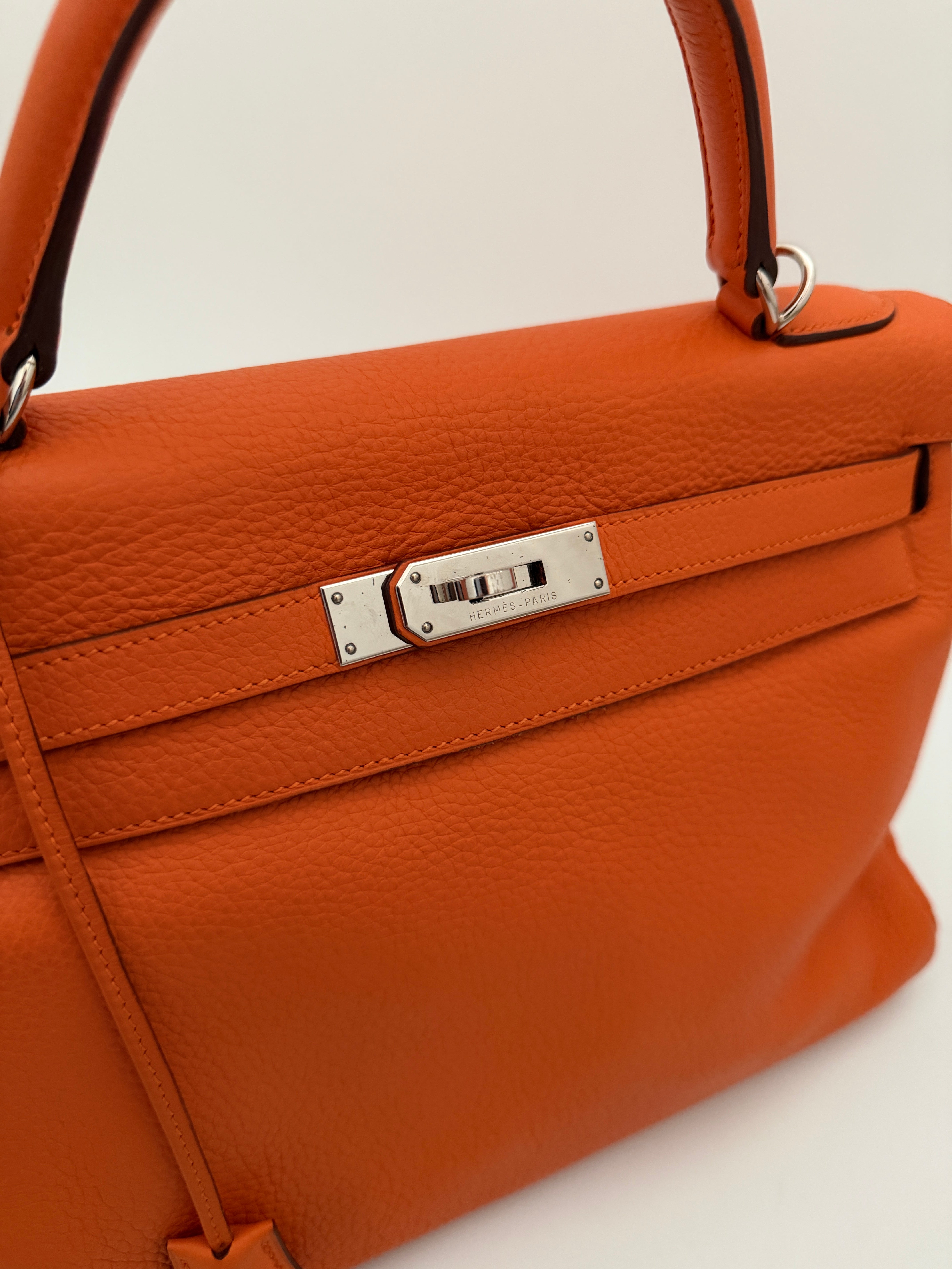 Hermès Kelly 32 bag in orange leather with silver-tone metal details.