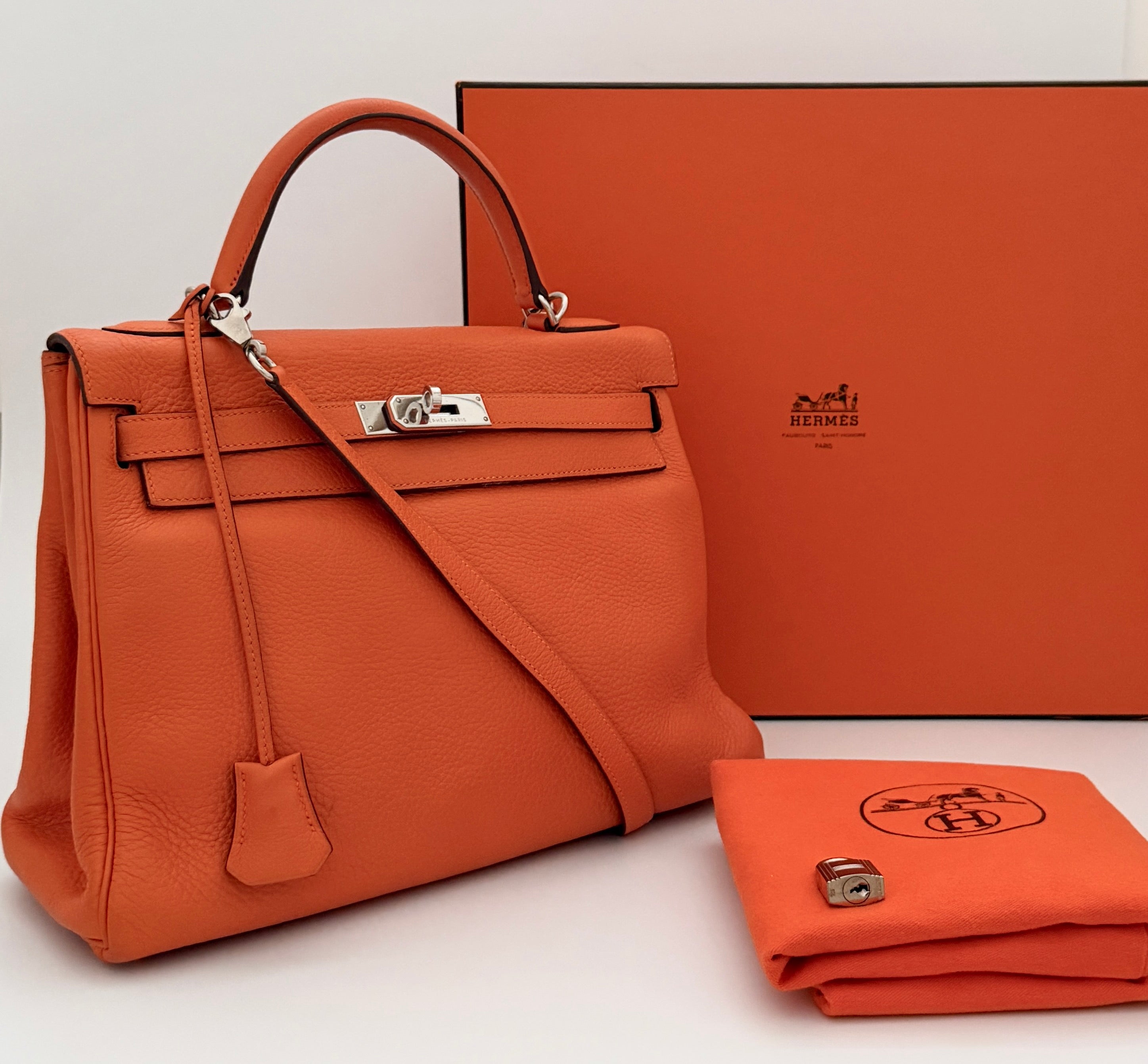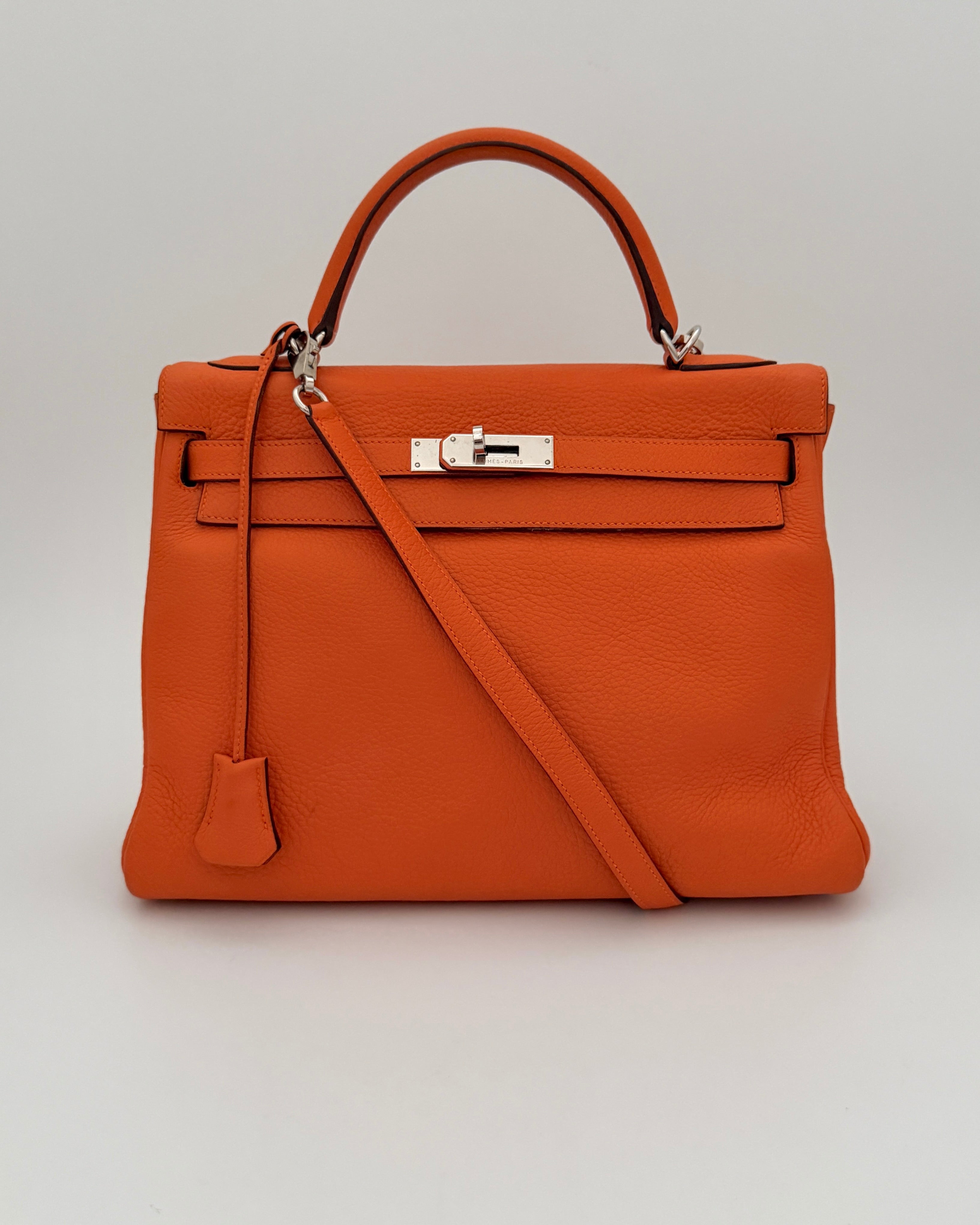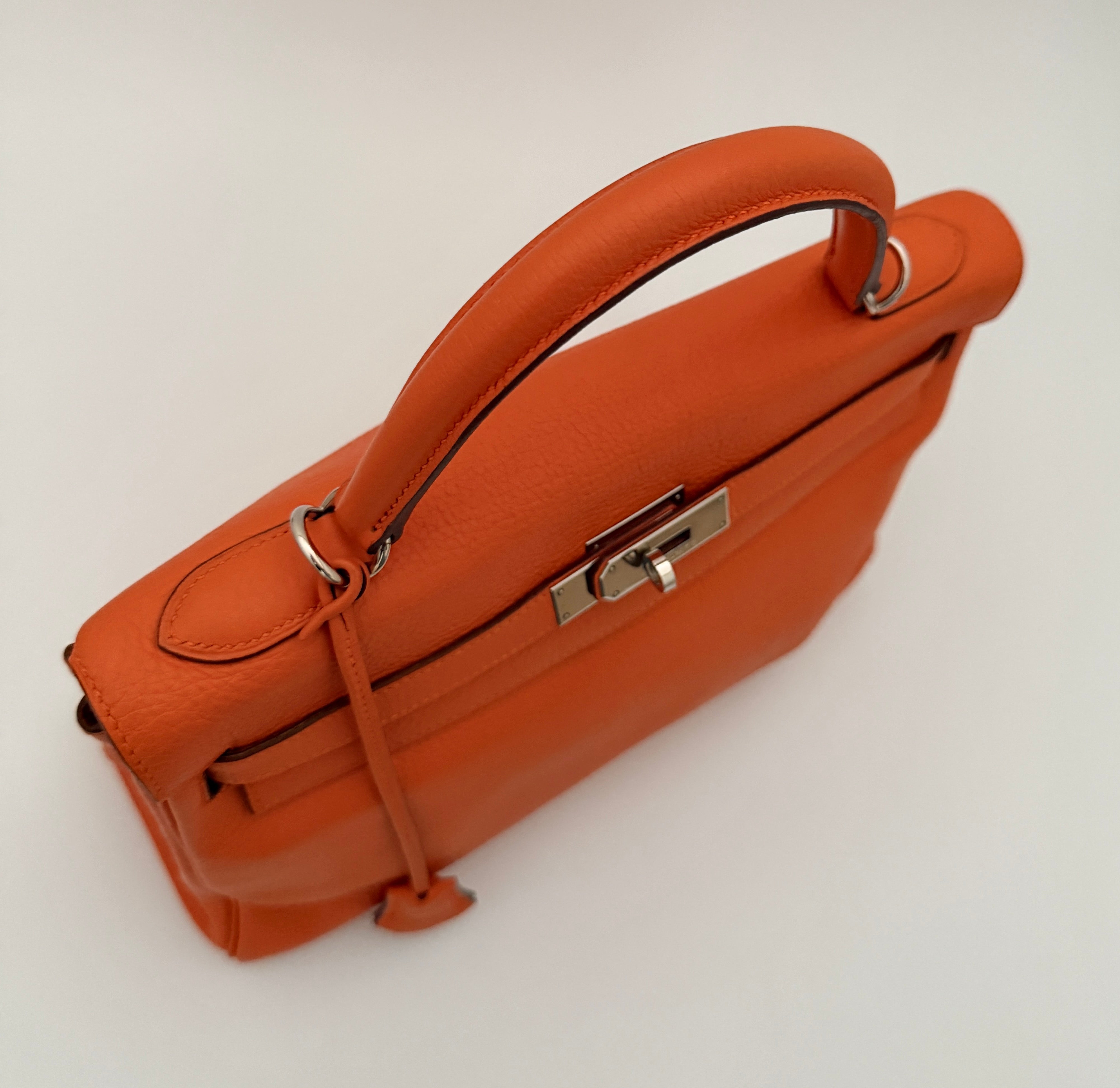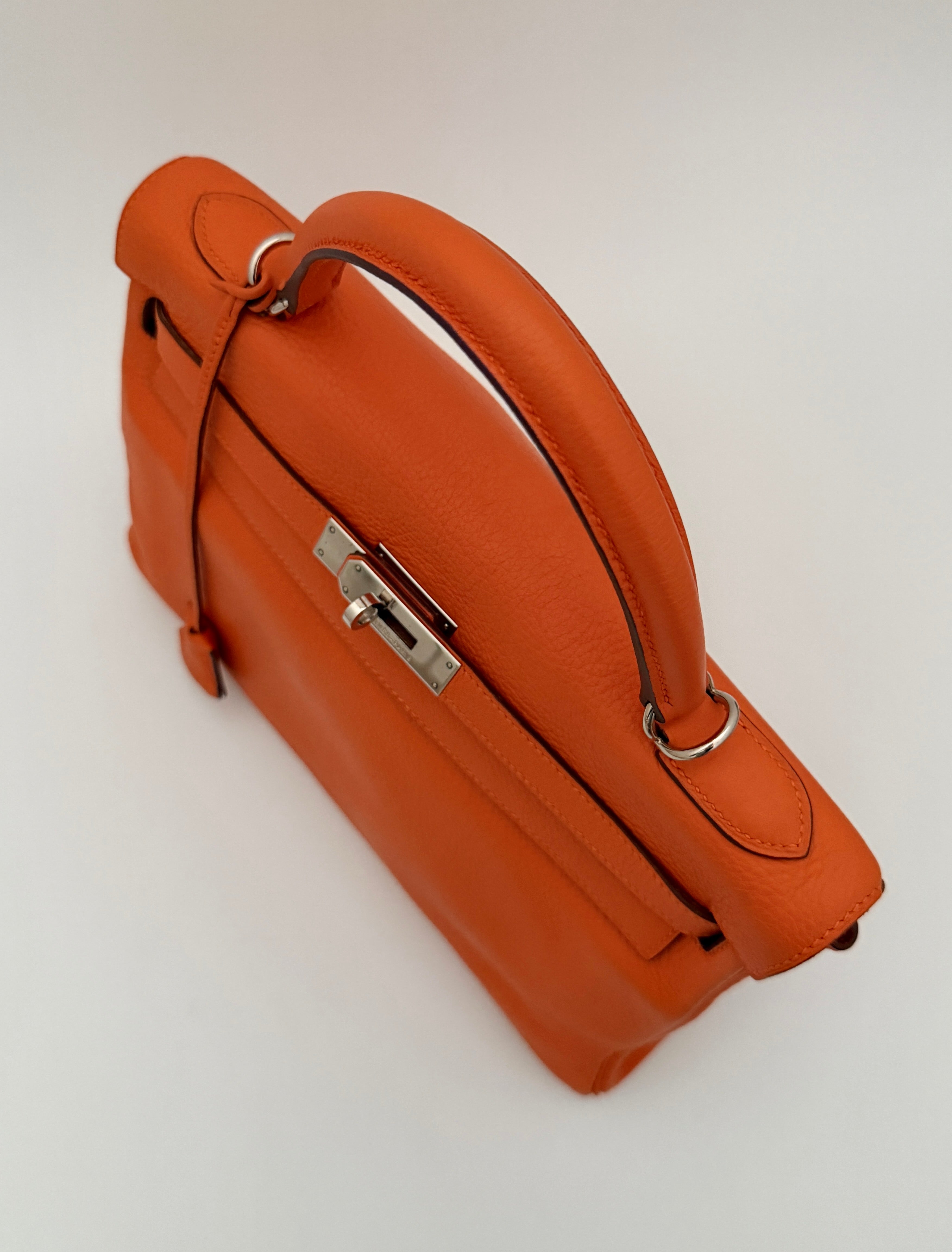 Hermès Kelly 32 bag in orange leather with silver-tone metal details.