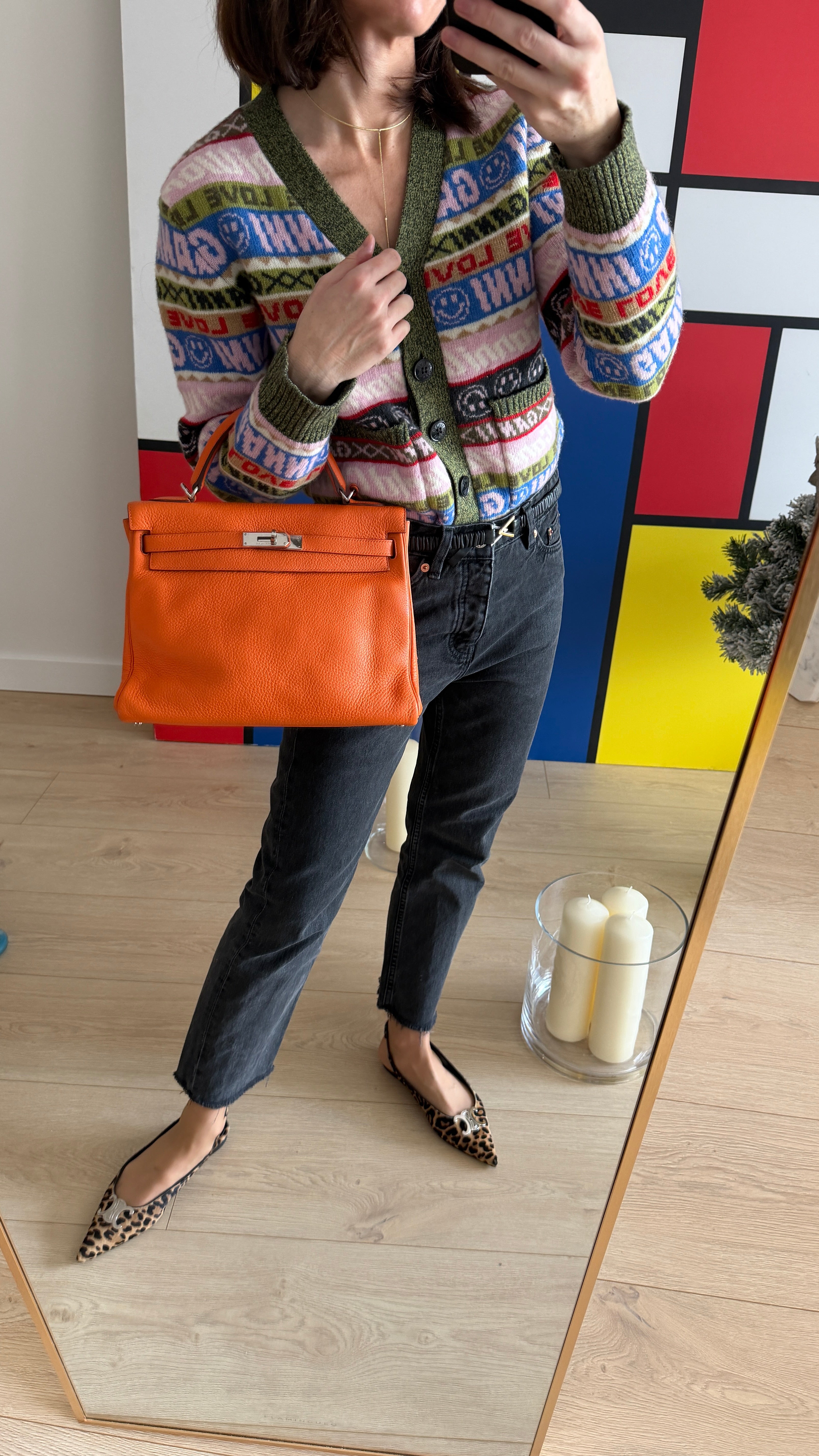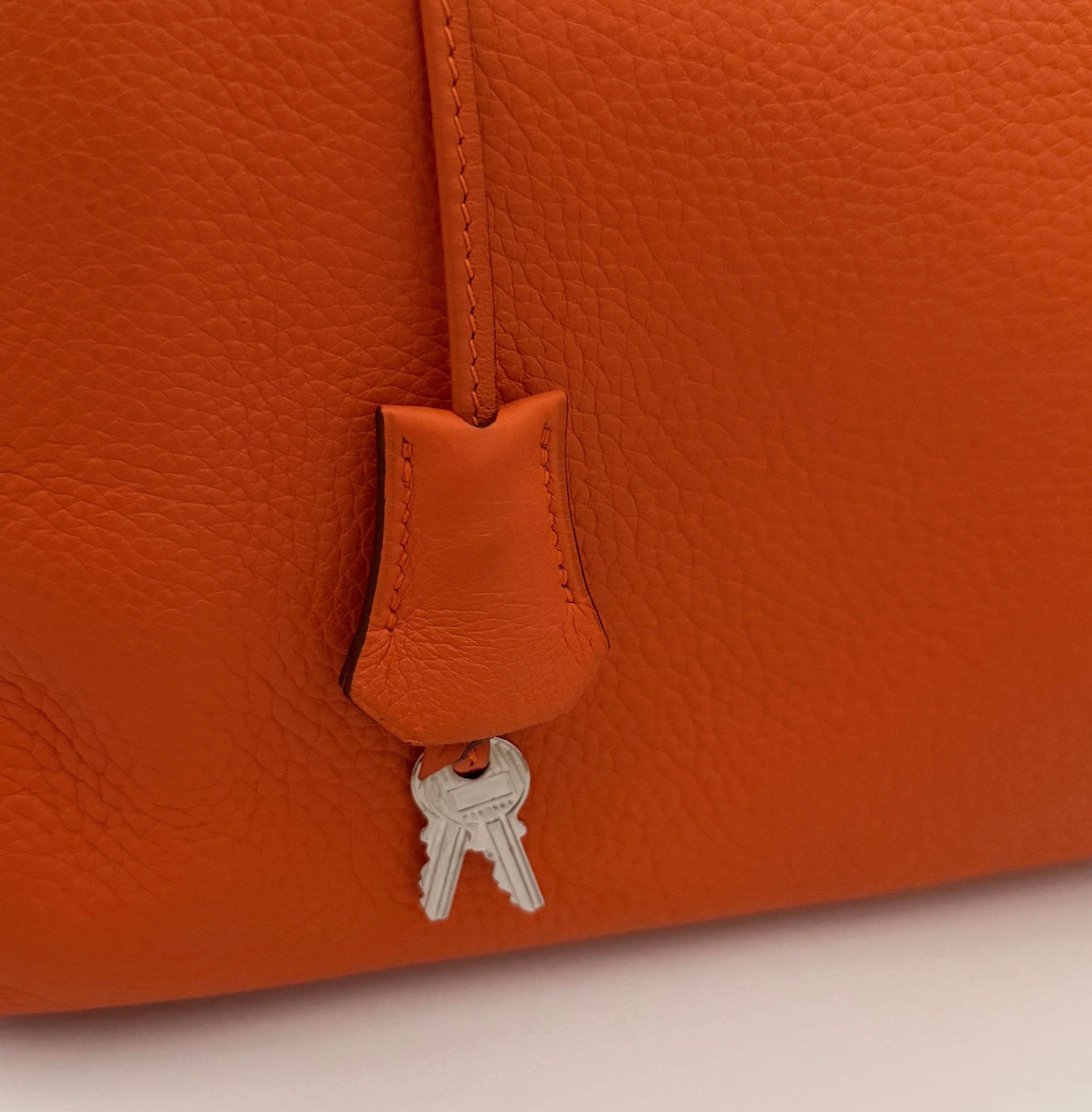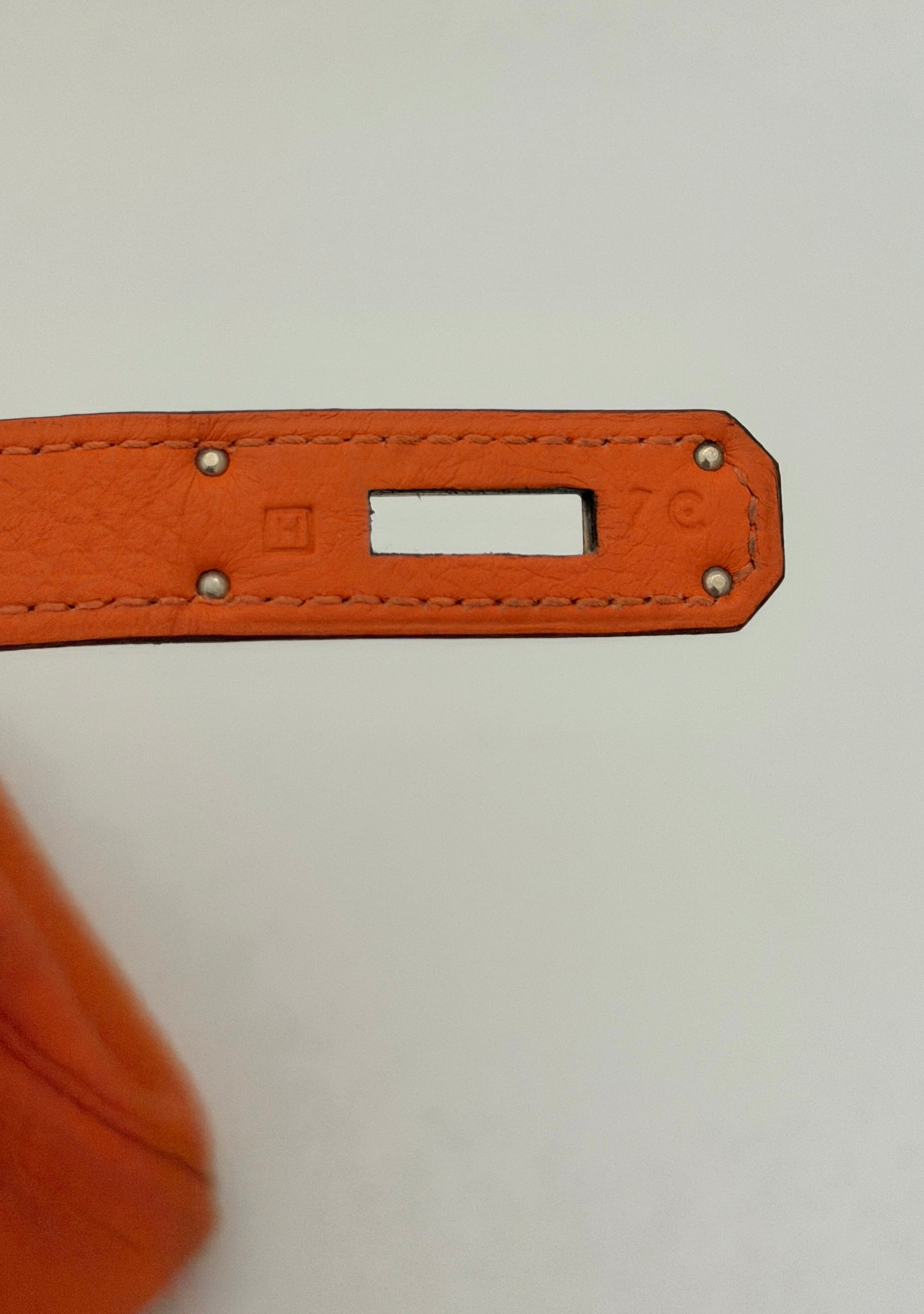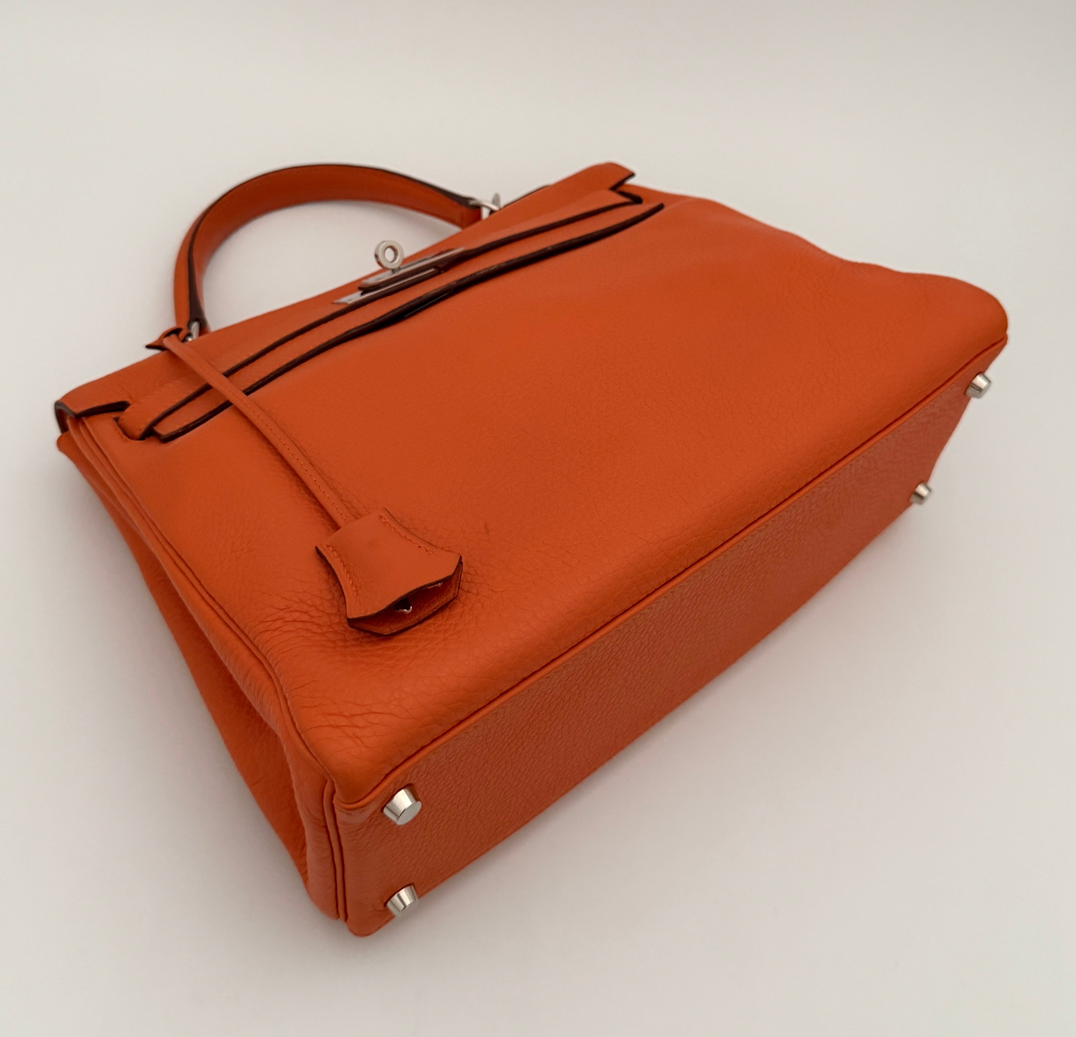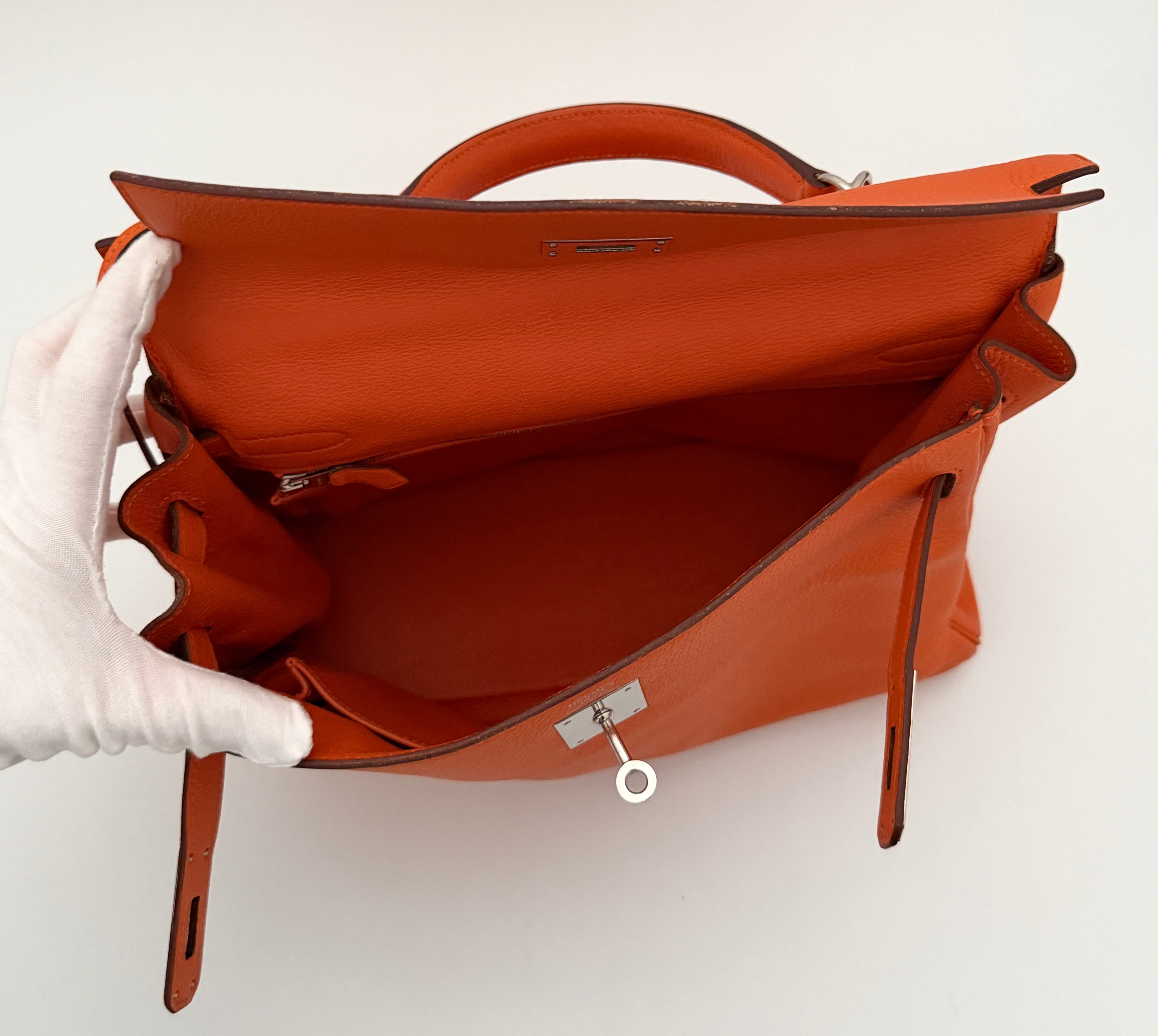 Hermès Kelly 32 bag in orange leather with silver-tone metal details.